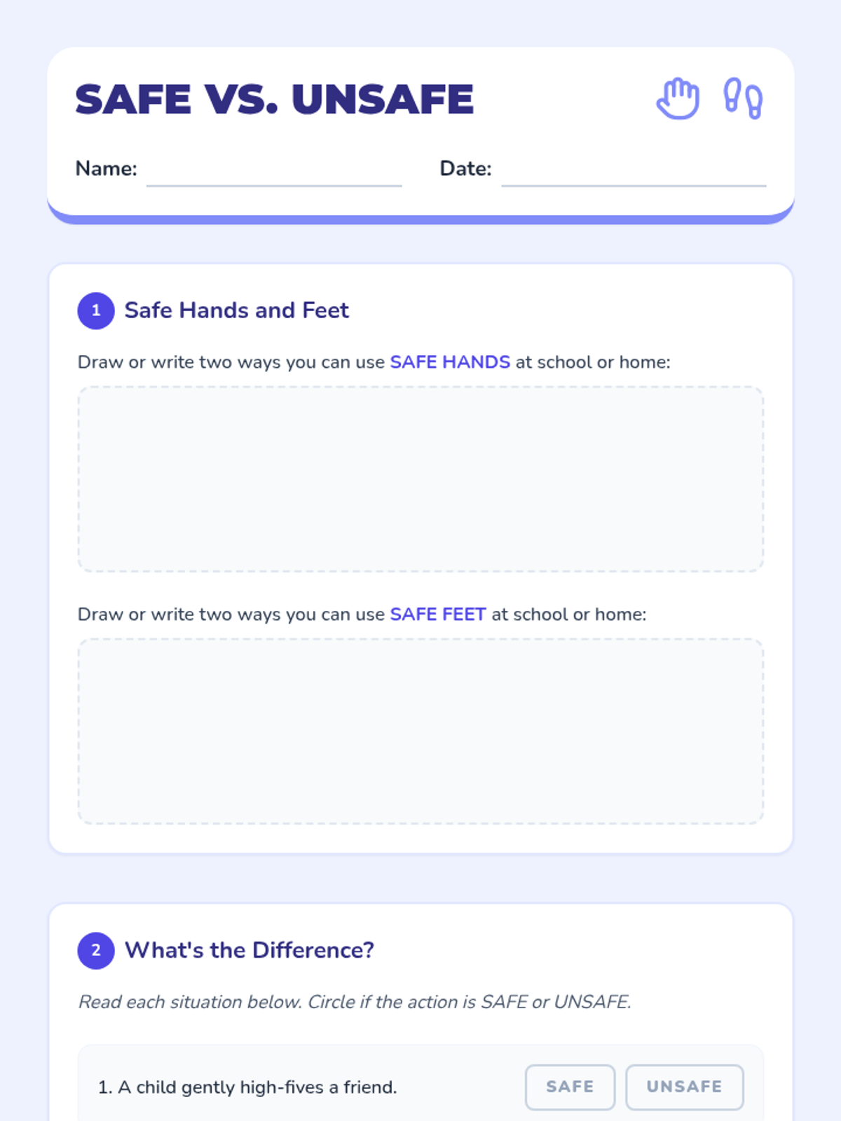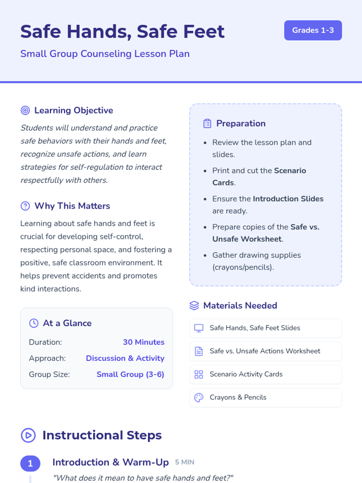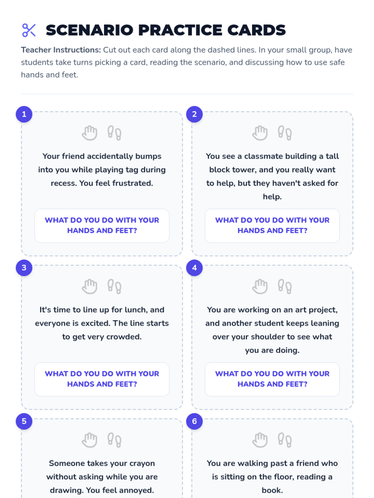 A 30-minute small group counseling lesson for students in grades 1-3 focusing on understanding and practicing safe behaviors with hands and feet. This lesson is important for developing self-regulation and respectful interactions.