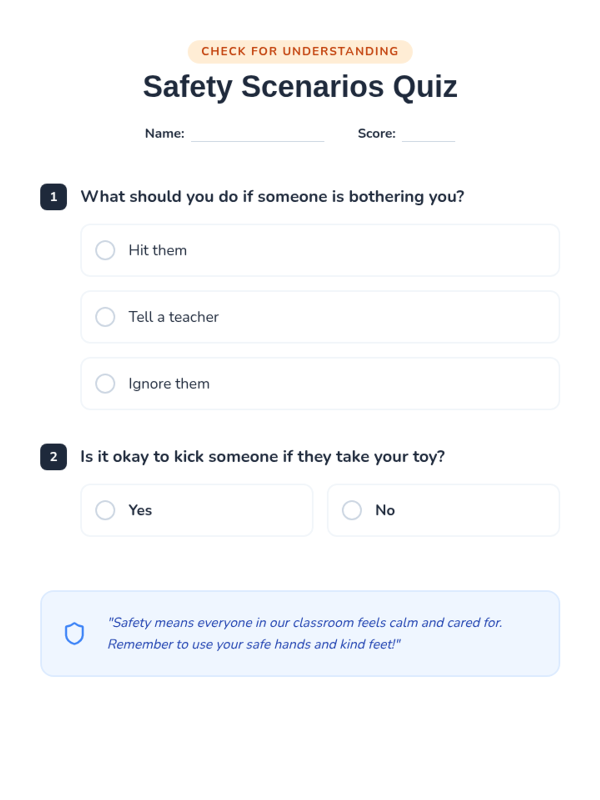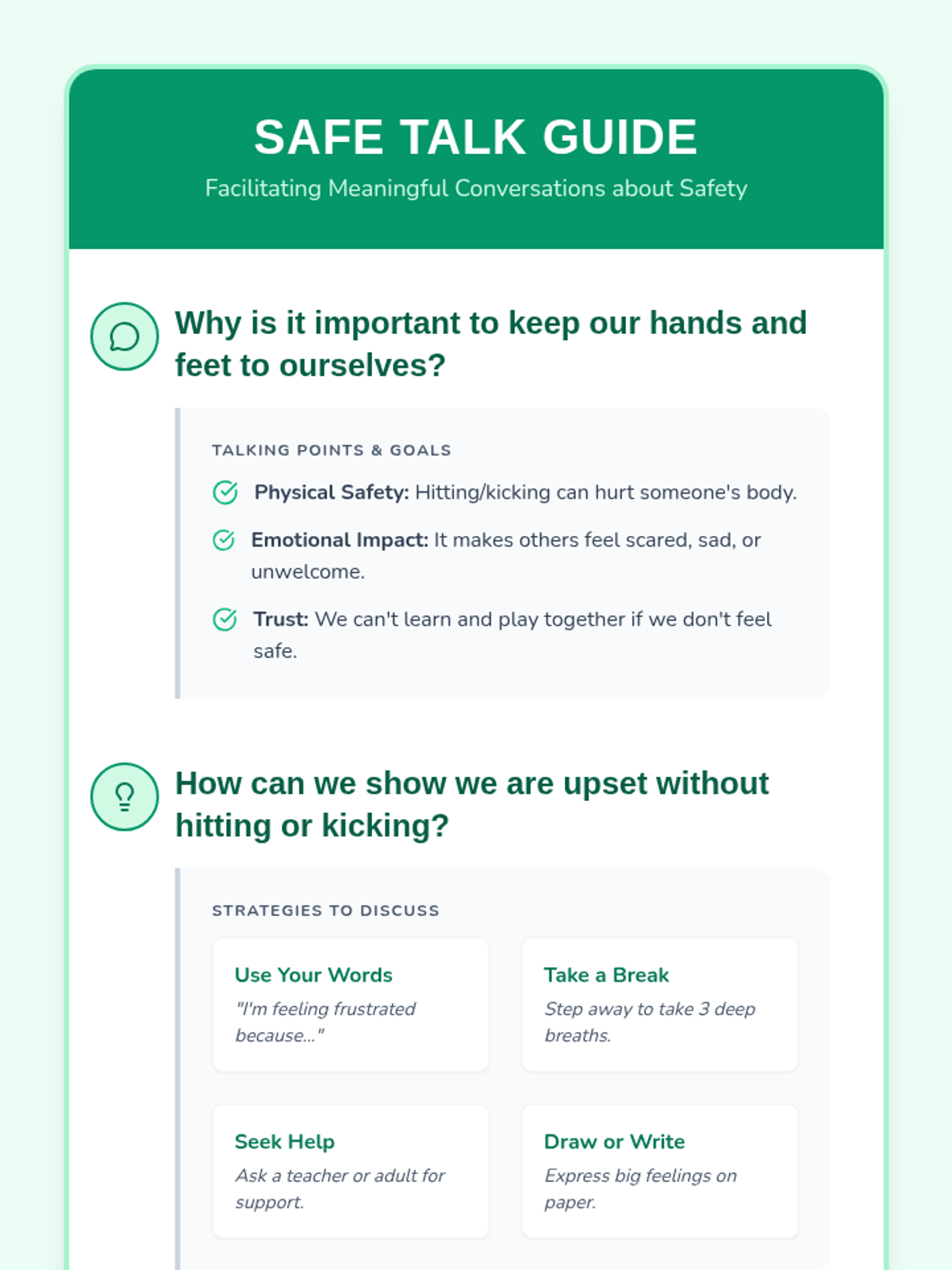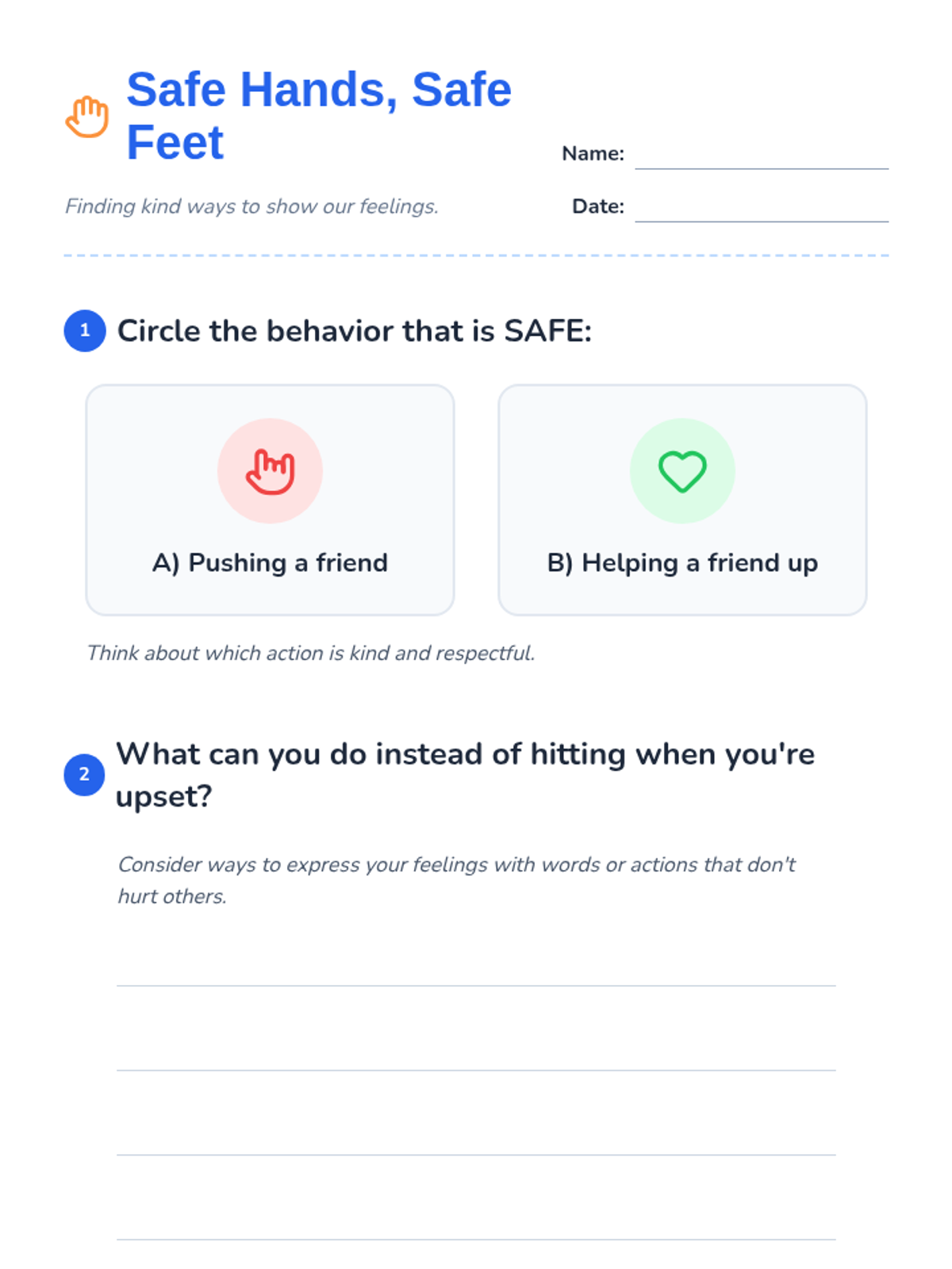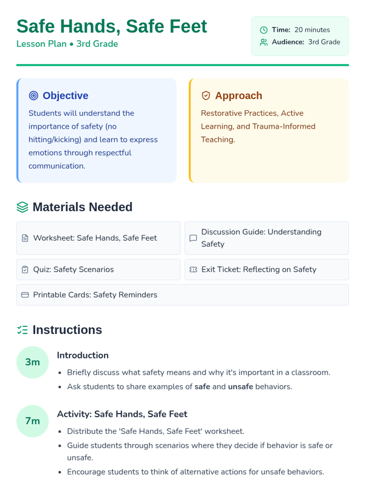 This lesson teaches 3rd grade students the importance of physical safety, emotional expression, and the impact of hitting or kicking. Students engage in discussions and activities to foster a supportive and respectful classroom environment.