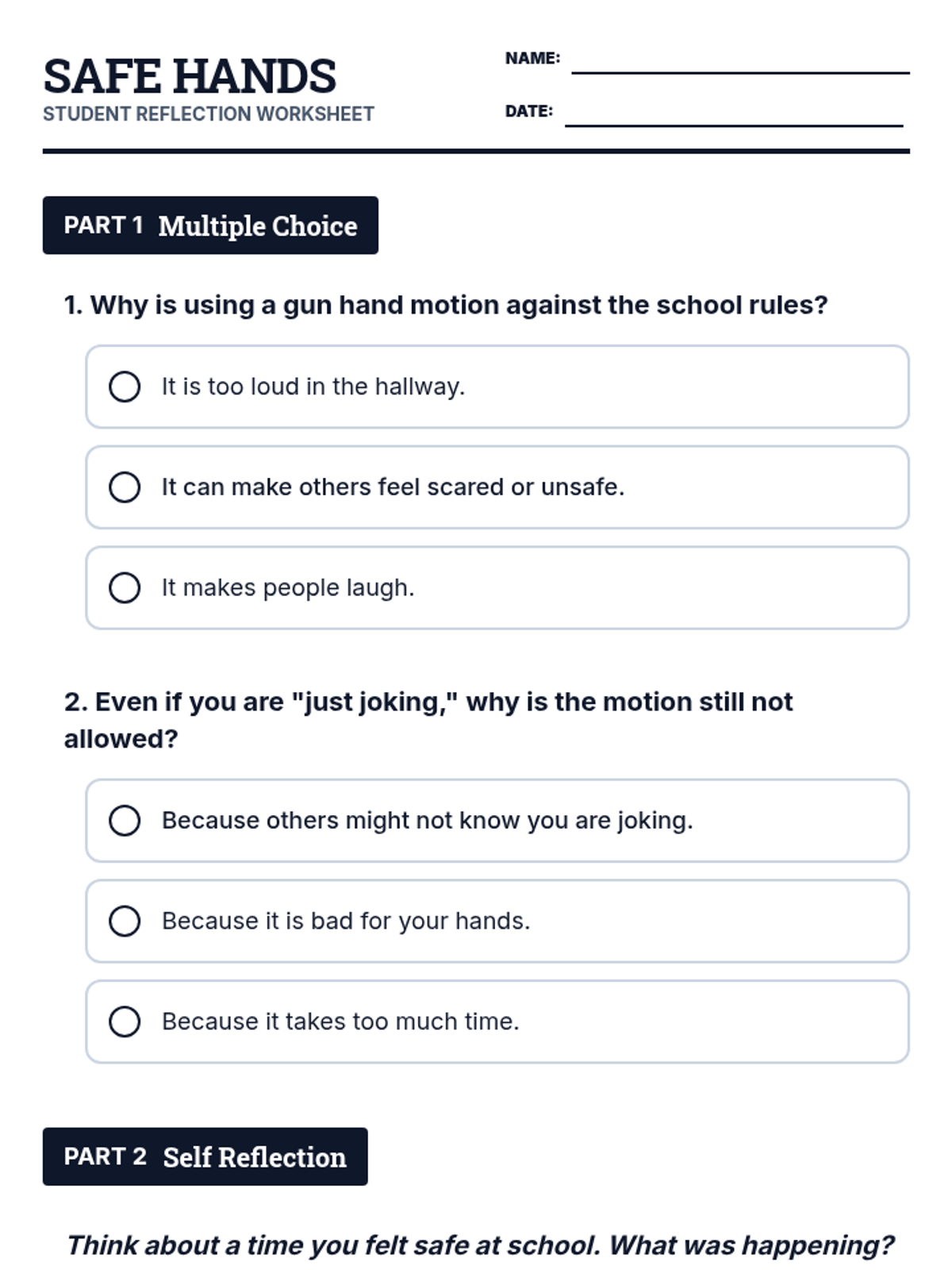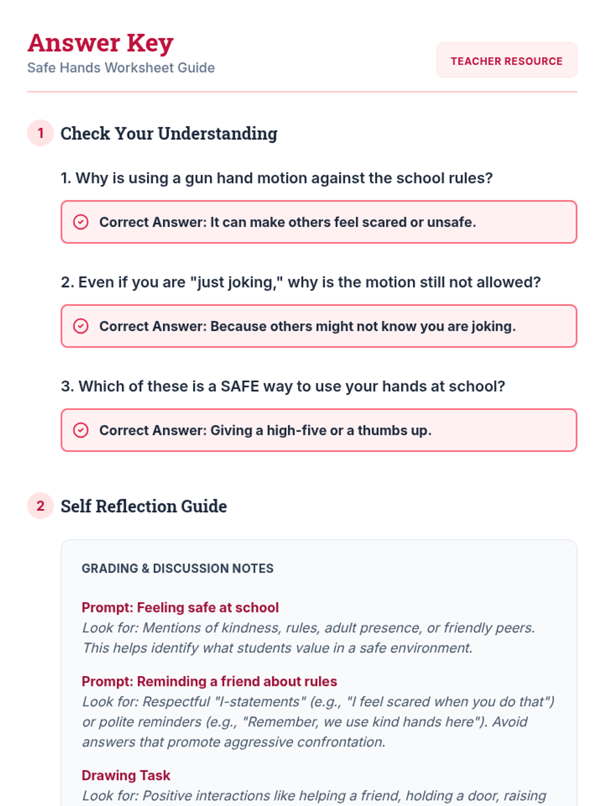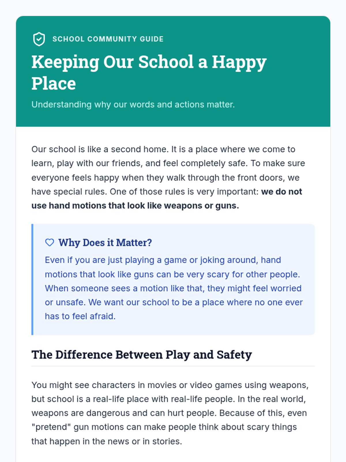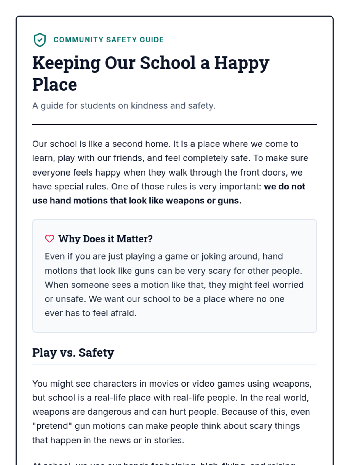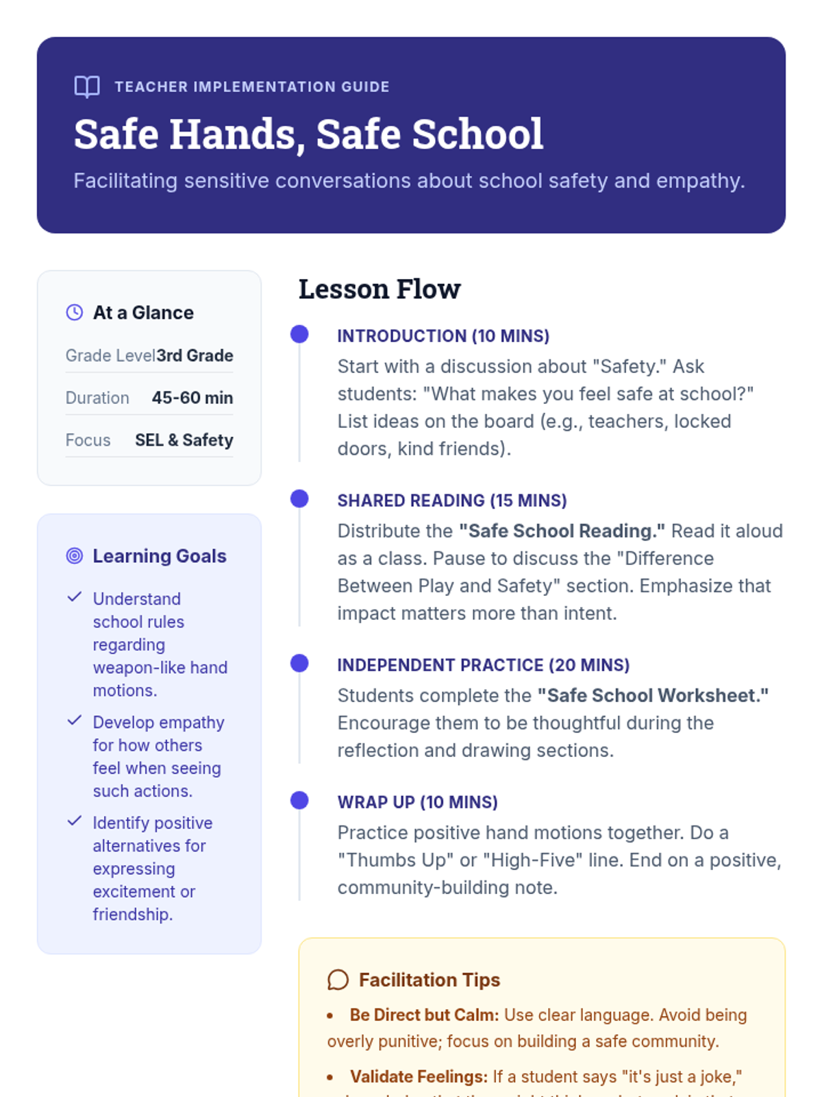 This lesson focuses on teaching 3rd-grade students why gun hand motions are inappropriate in school, emphasizing empathy for others' feelings and the importance of school safety rules.