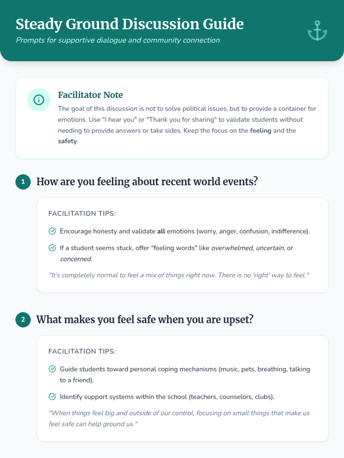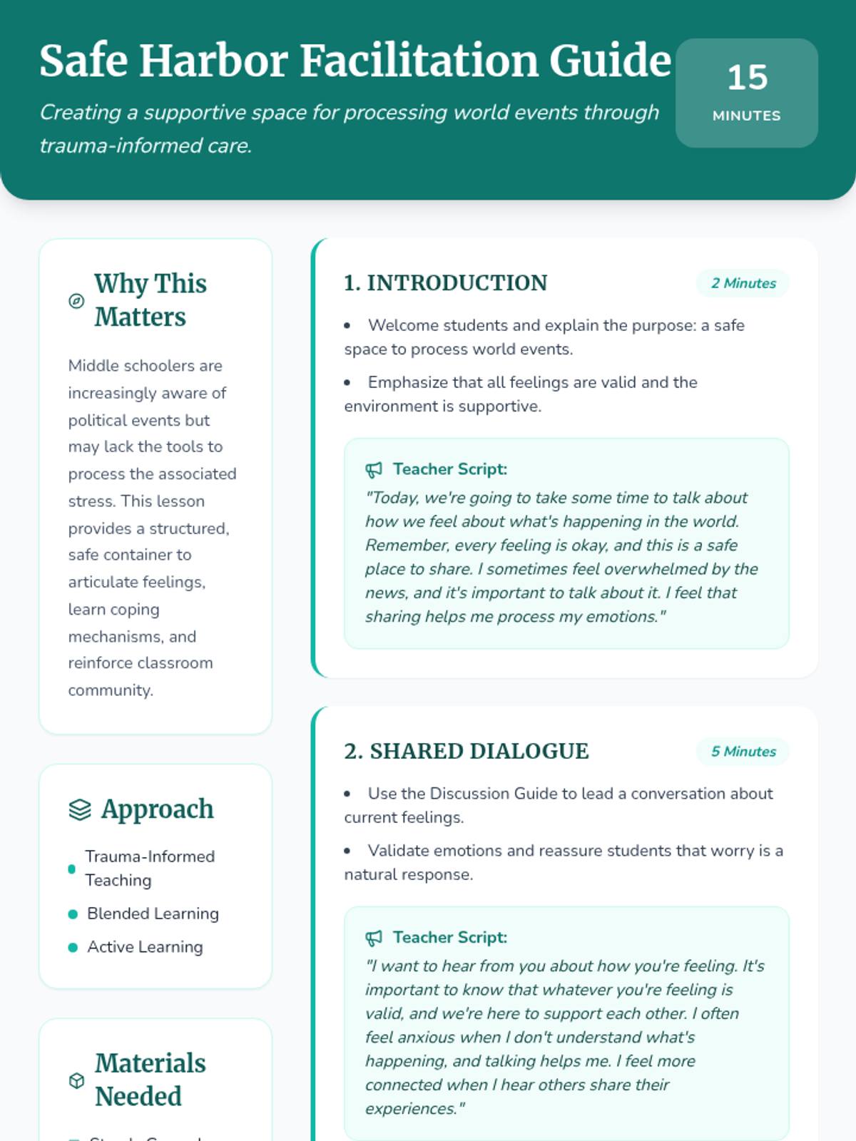 A trauma-informed middle school lesson designed to provide a safe space for students to process emotions related to political events. Students practice mindfulness, engage in supportive dialogue, and use creative expression to identify coping mechanisms and feel heard.