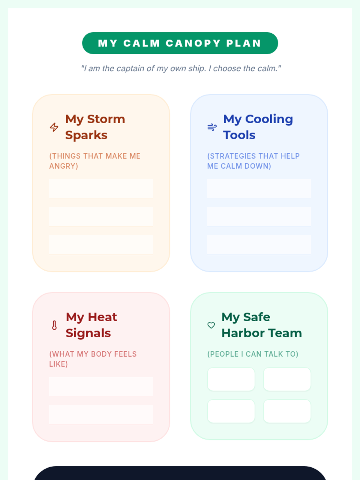 Students will synthesize their learning by creating a personal 'Calm Canopy' plan, identifying their triggers, coping strategies, and support people.