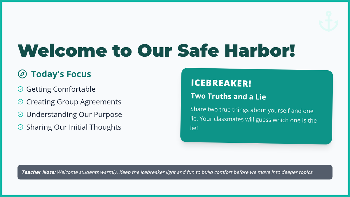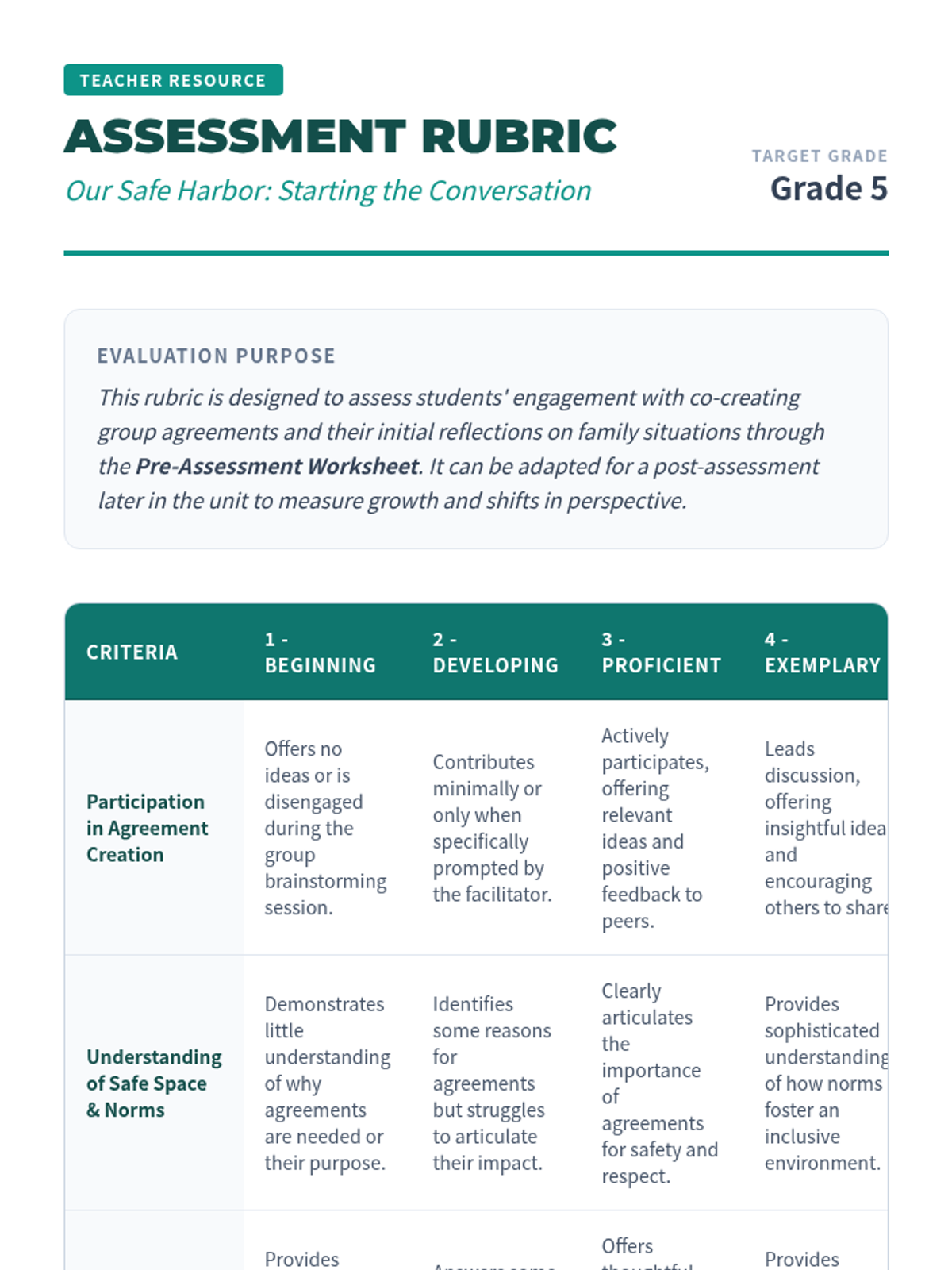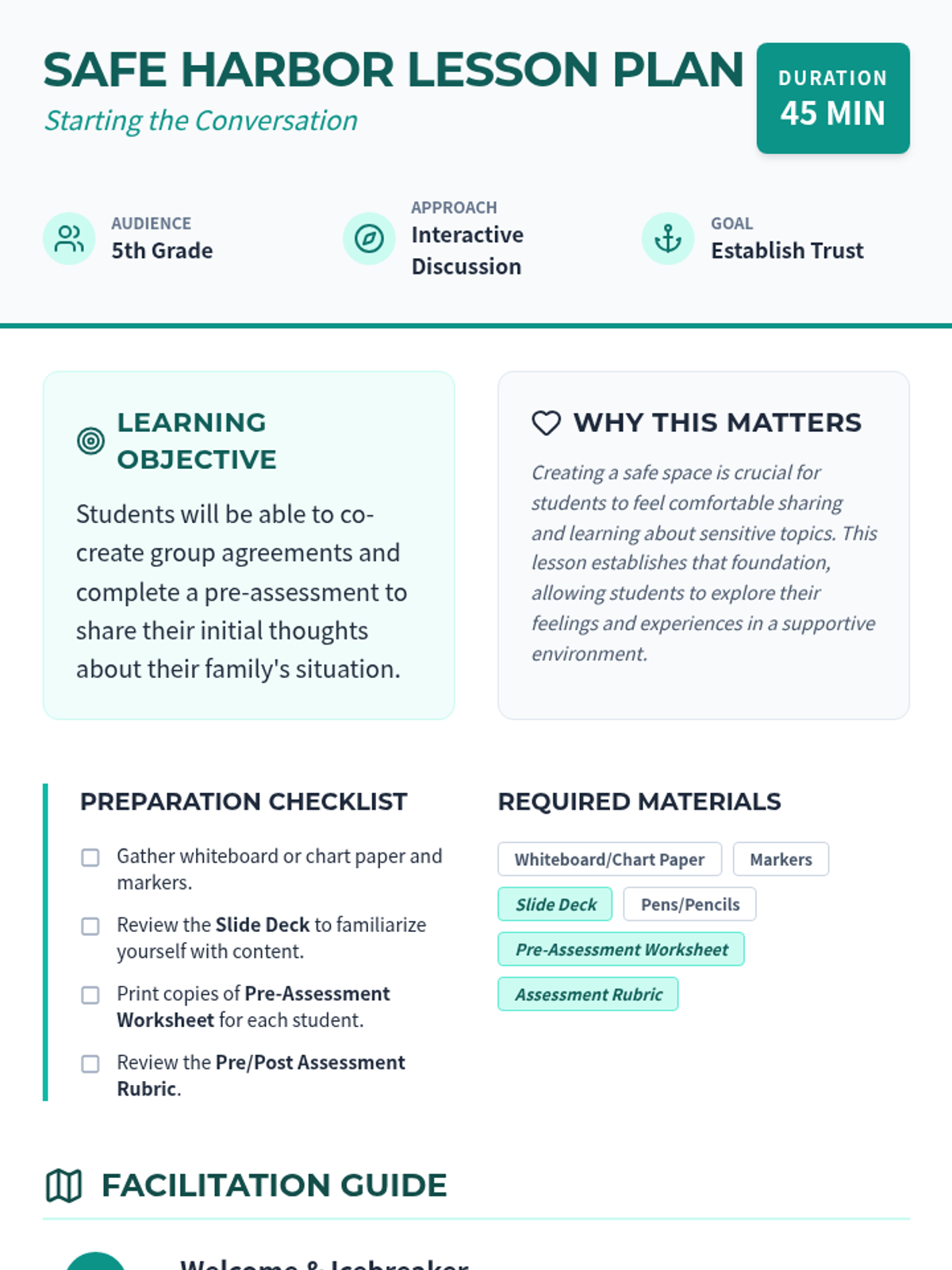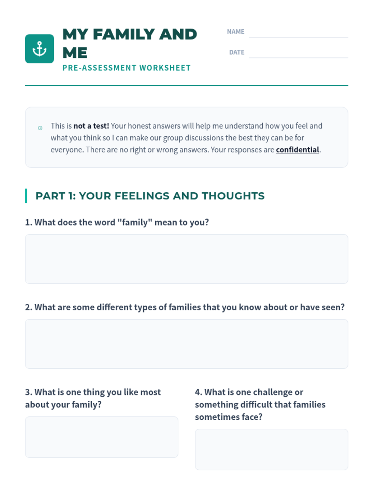 A foundational lesson for 5th graders to establish trust, co-create group agreements, and share initial thoughts on family dynamics through a pre-assessment.