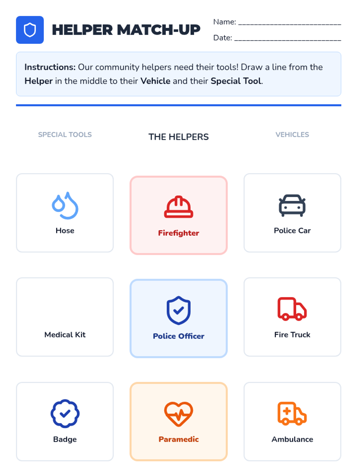 Learners identify police officers, firefighters, and paramedics, understanding their roles and recognizing their uniforms and vehicles.