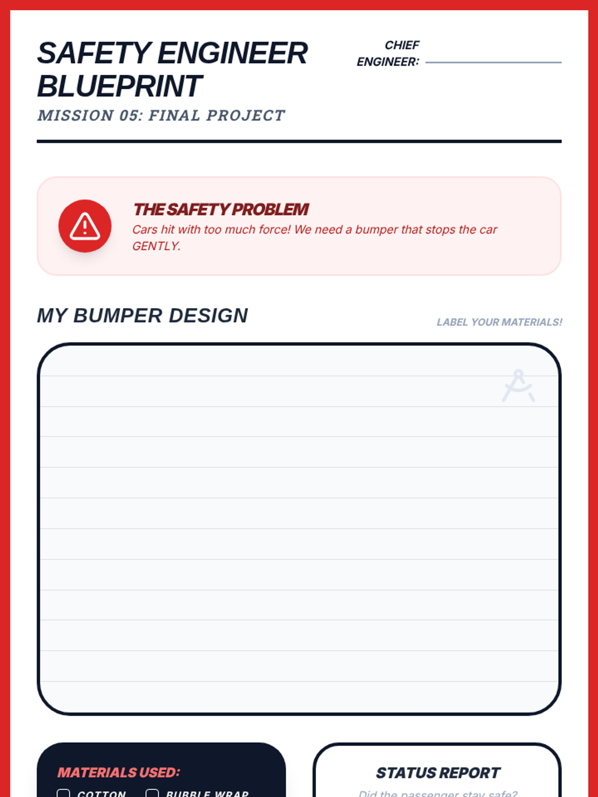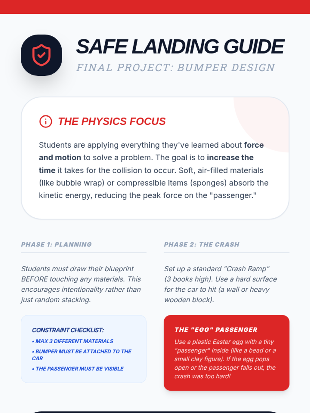 Applying their knowledge of collisions, students design a soft landing pad or bumper to minimize impact force on a toy car.