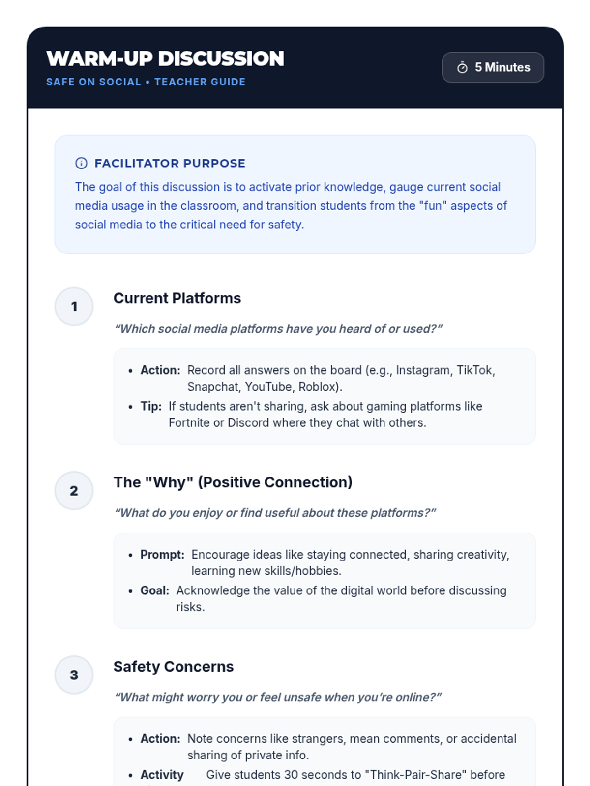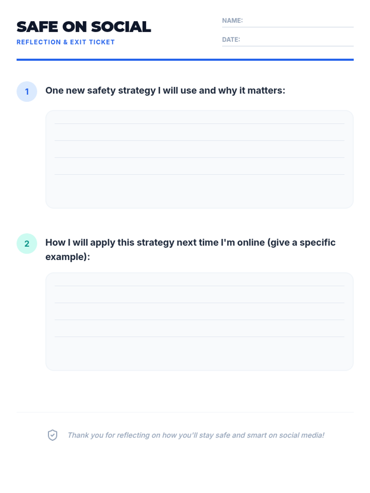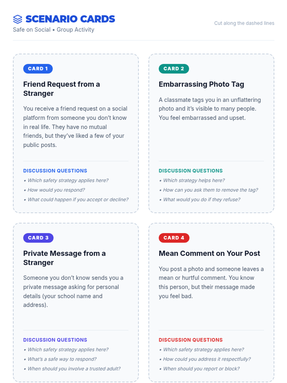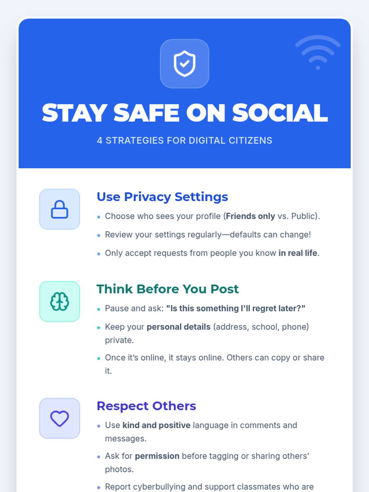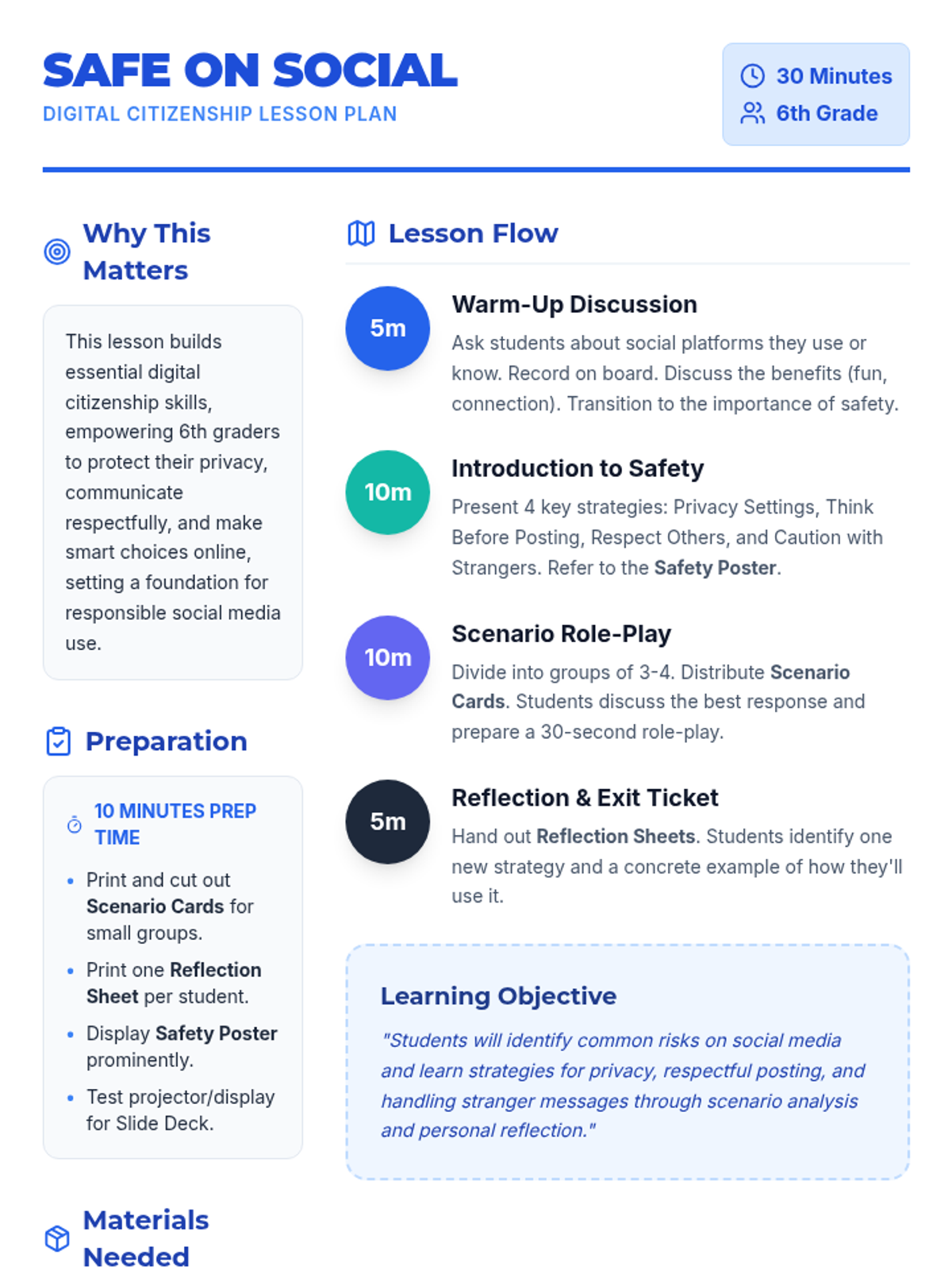 In this 30-minute lesson, 6th graders will explore key strategies and behaviors to stay safe on social media. Students will identify risks, learn best practices for privacy and respectful posting, and practice making smart choices through engaging scenarios.