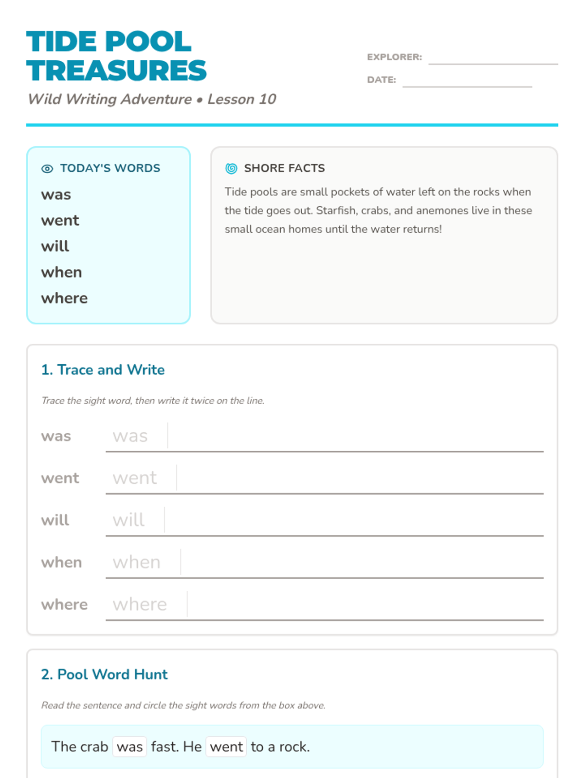 Explore the rocky shore to discover sight words while meeting starfish, crabs, and sea anemones in colorful tide pools.