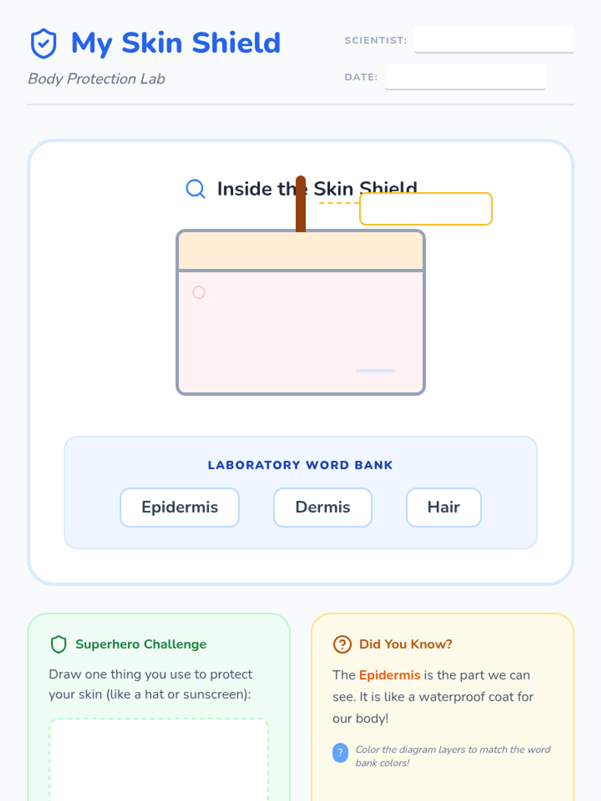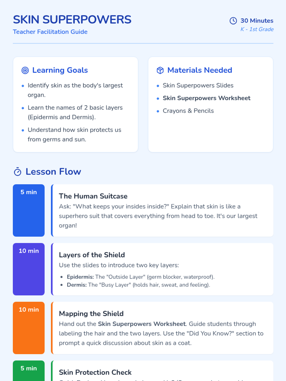 A 30-minute introductory lesson for K-1 students about the skin's layers and its role as a protective shield for the body.