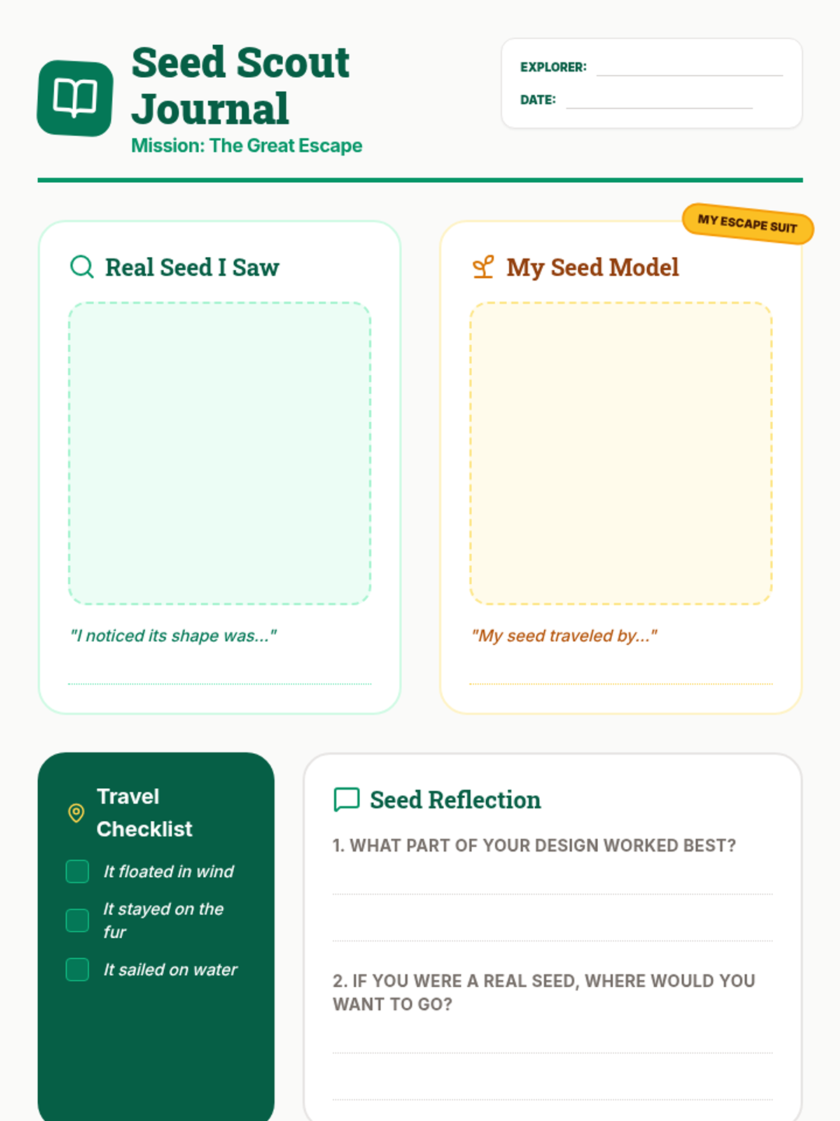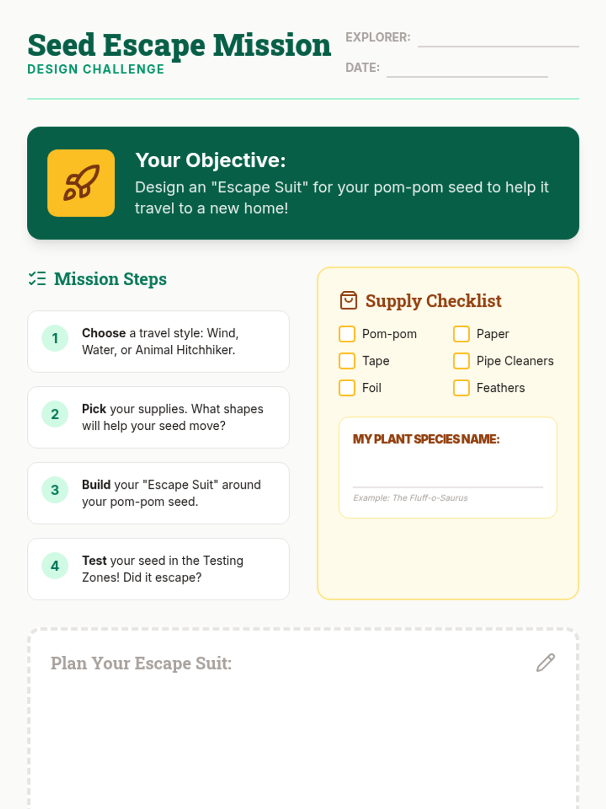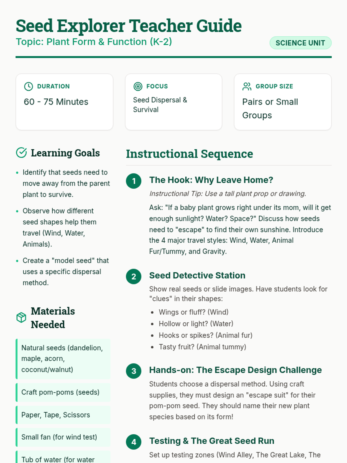 Students explore the fascinating world of seed dispersal through hands-on modeling and observation, discovering how plant 'form' follows 'function' to ensure the next generation of plants can grow in new places.