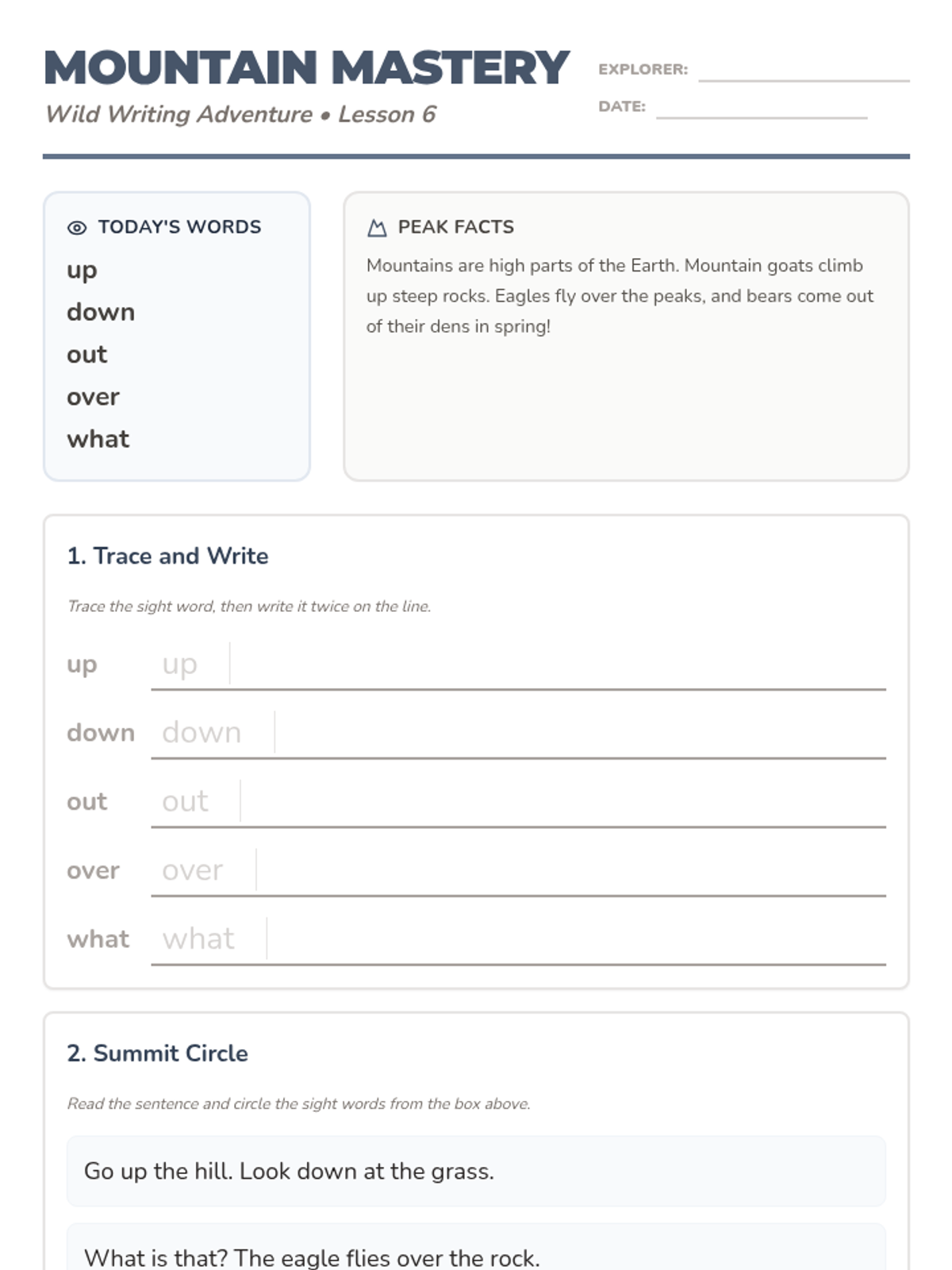 Climb to the highest peaks to master directional sight words while meeting mountain goats, eagles, and black bears.