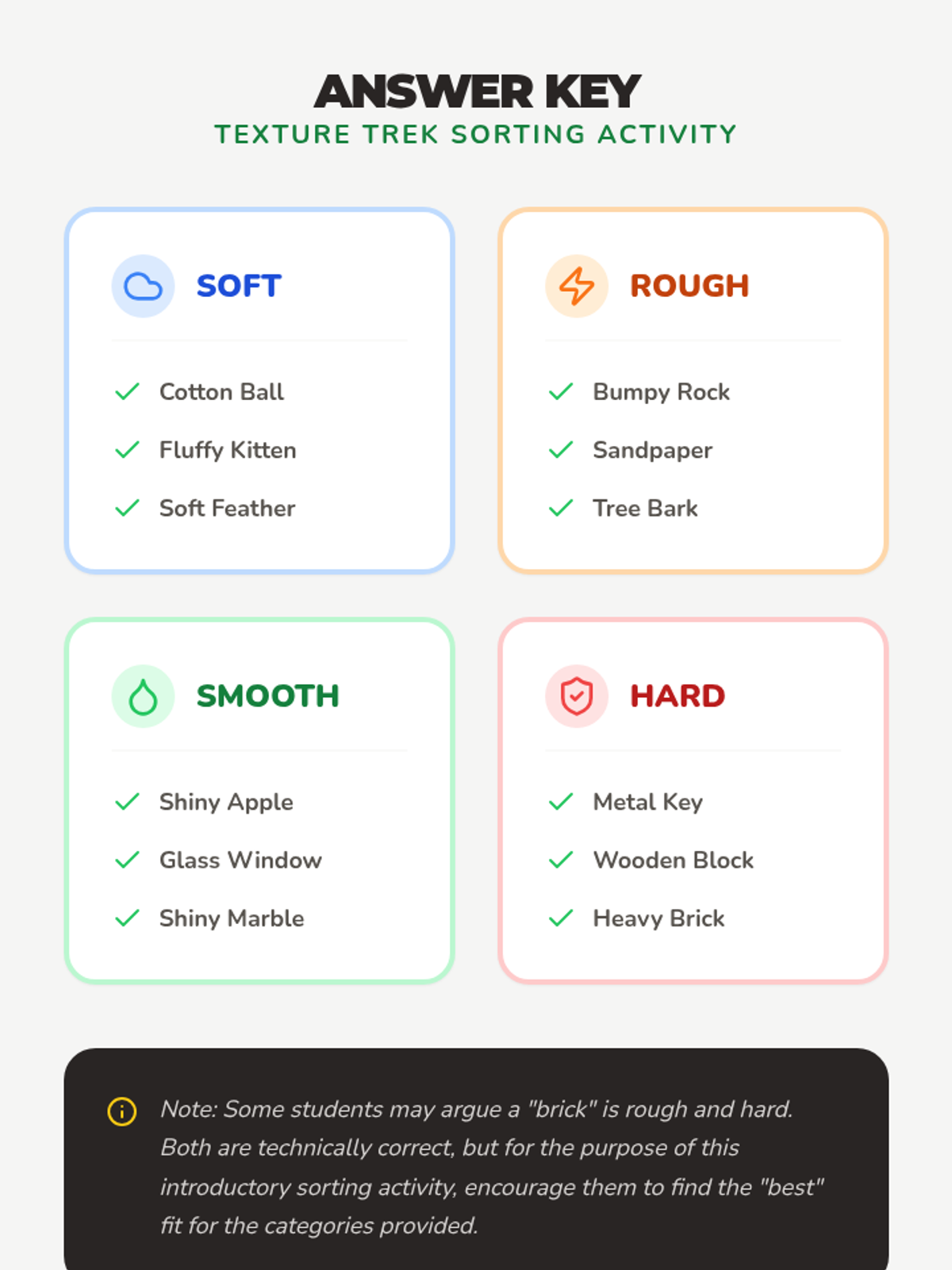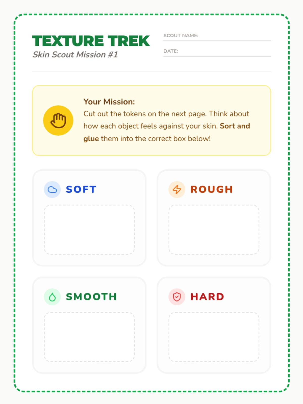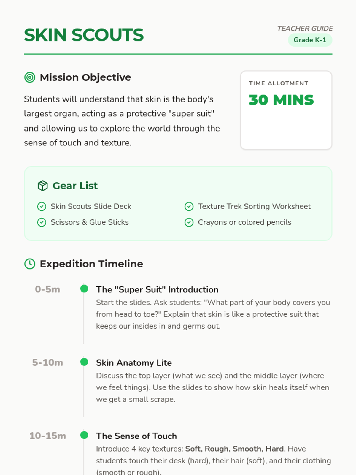 A 30-minute introductory lesson for K-1 students to learn about skin's protective role and the sense of touch through a texture-sorting activity.