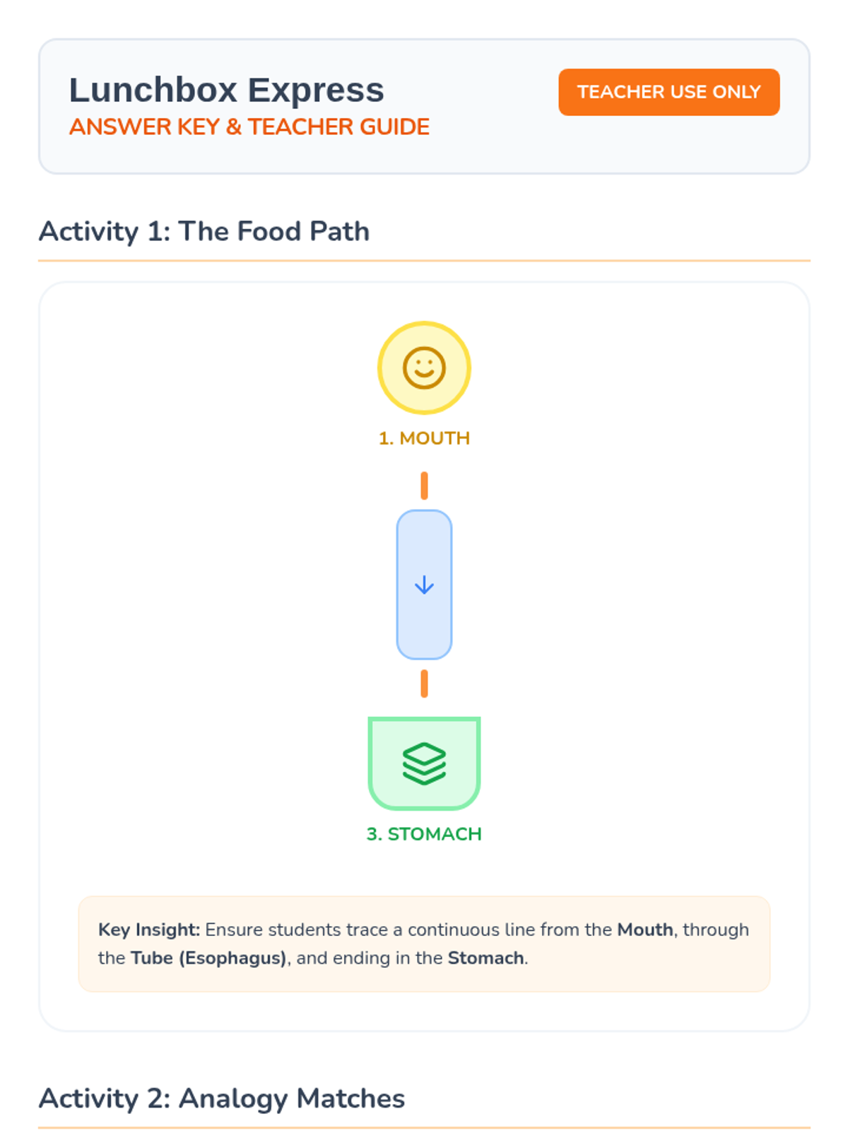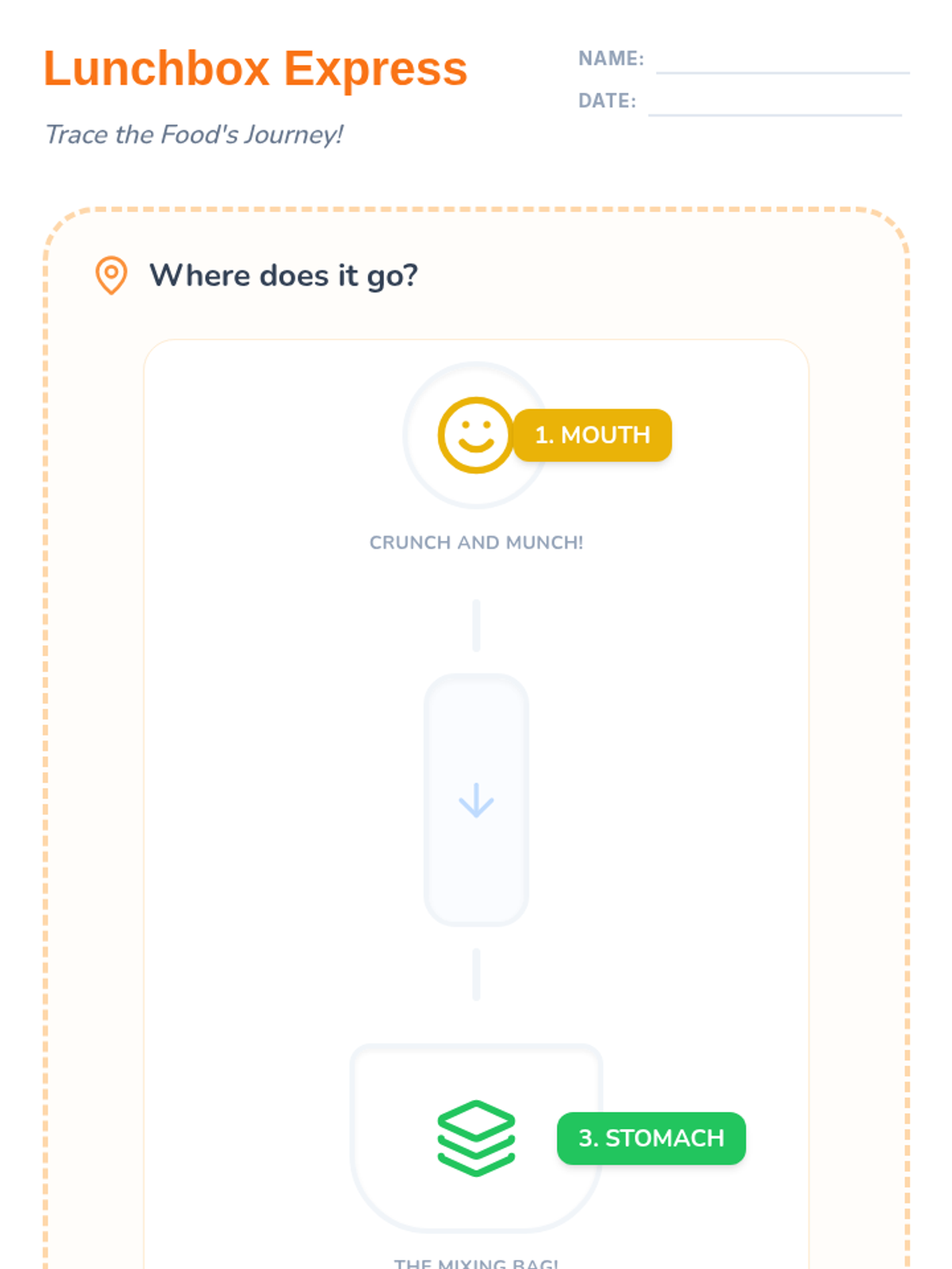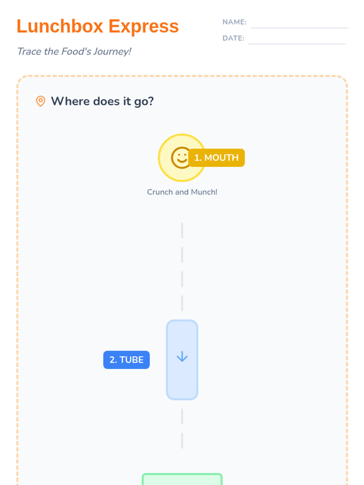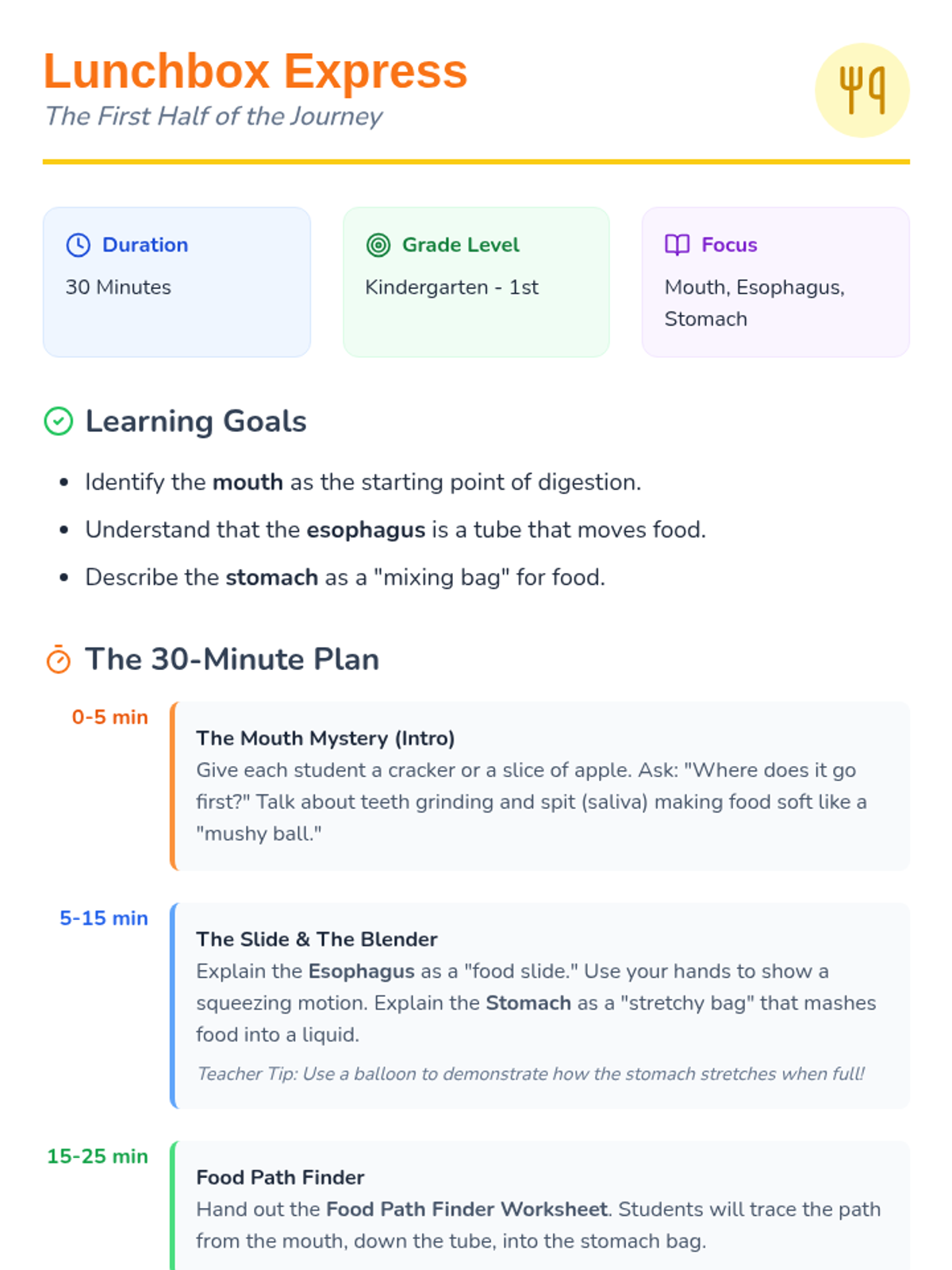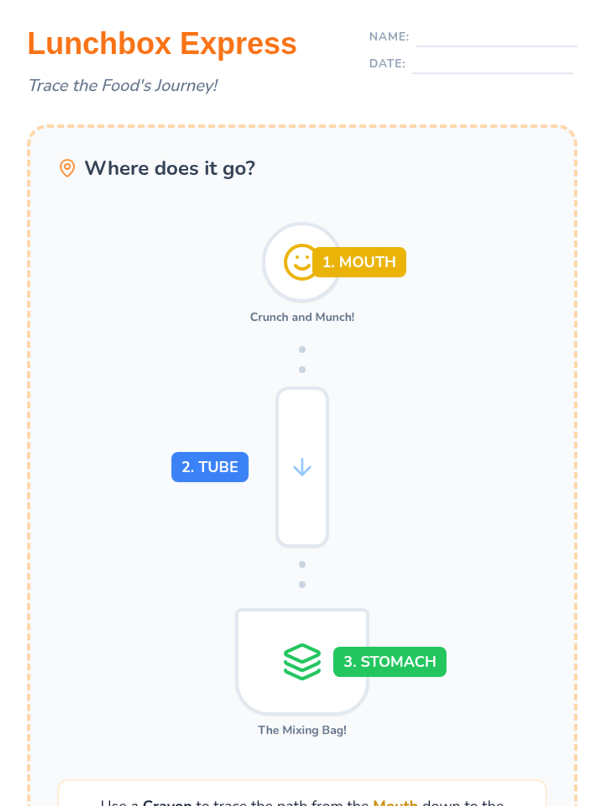 A high-energy, 30-minute introduction to the first half of the digestive system (mouth to stomach) designed for K-1 students. Includes a guided exploration of how food travels and a hands-on activity sheet.