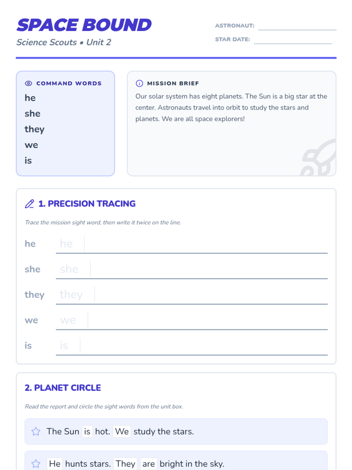 Launch into orbit to explore planets and stars while mastering high-frequency sight words and scientific terminology.