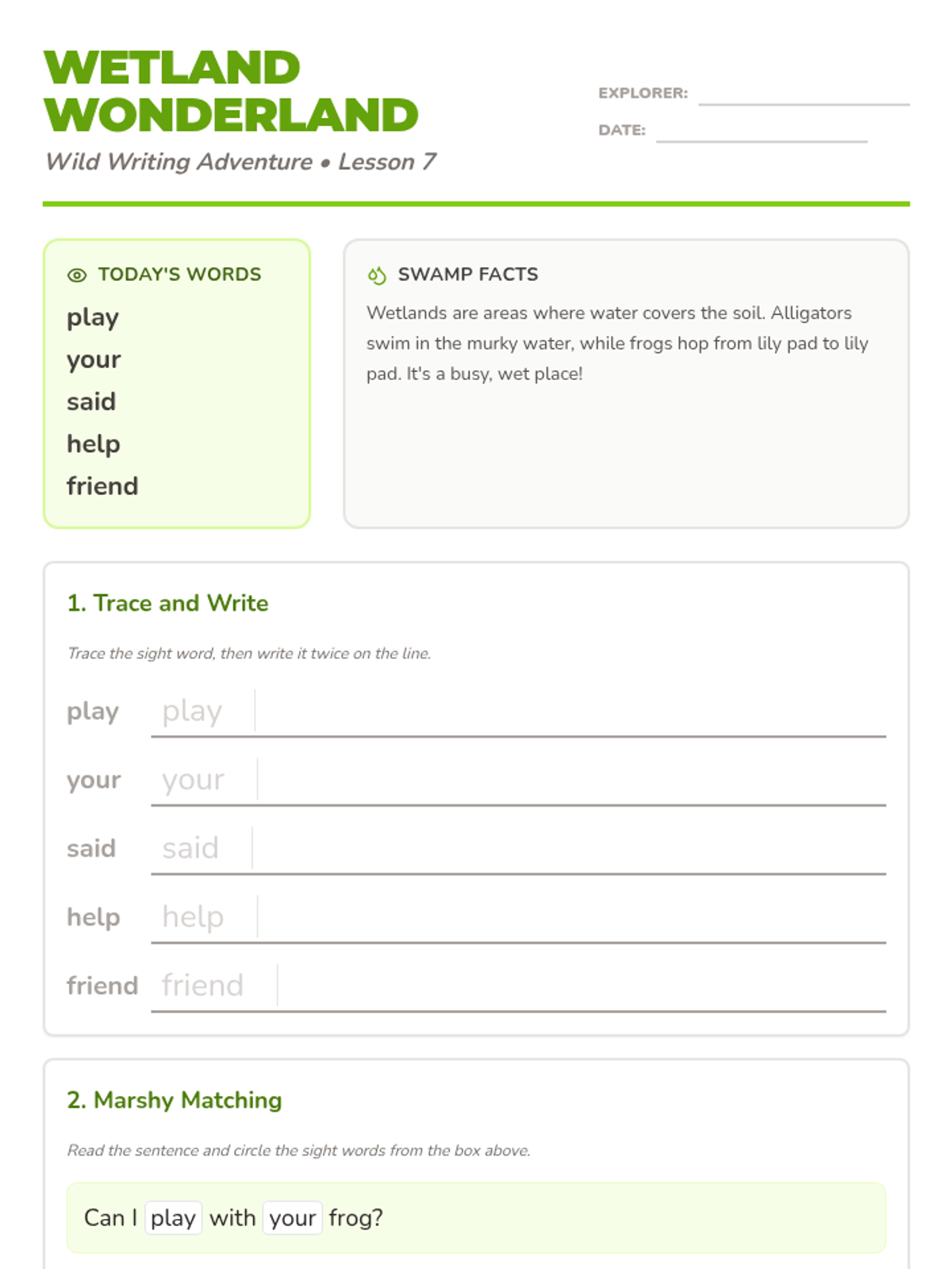 Squelch through the marshy wetlands to master descriptive sight words while spotting alligators, frogs, and dragonflies.