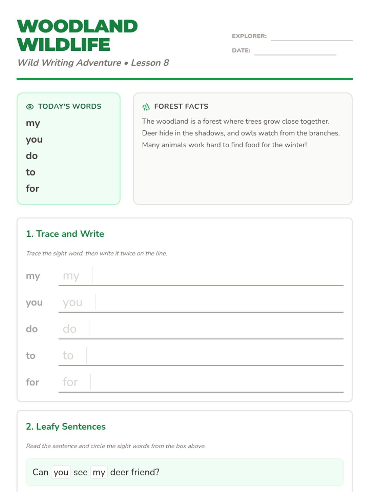 Explore the leafy woodland forest to master essential sight words while meeting graceful deer, wise owls, and busy woodpeckers.