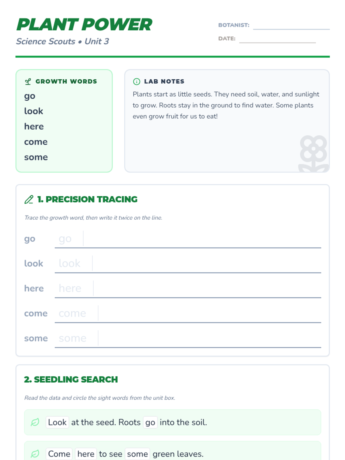 Investigate the life cycle of plants and the essentials for growth while mastering sight words and scientific observation.