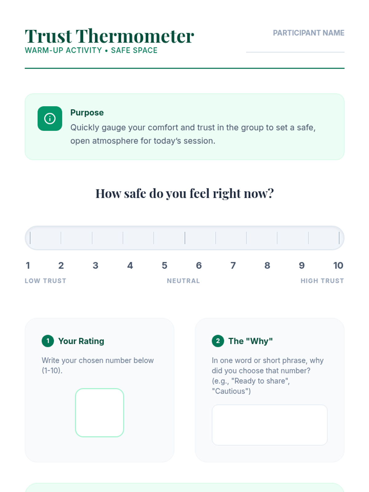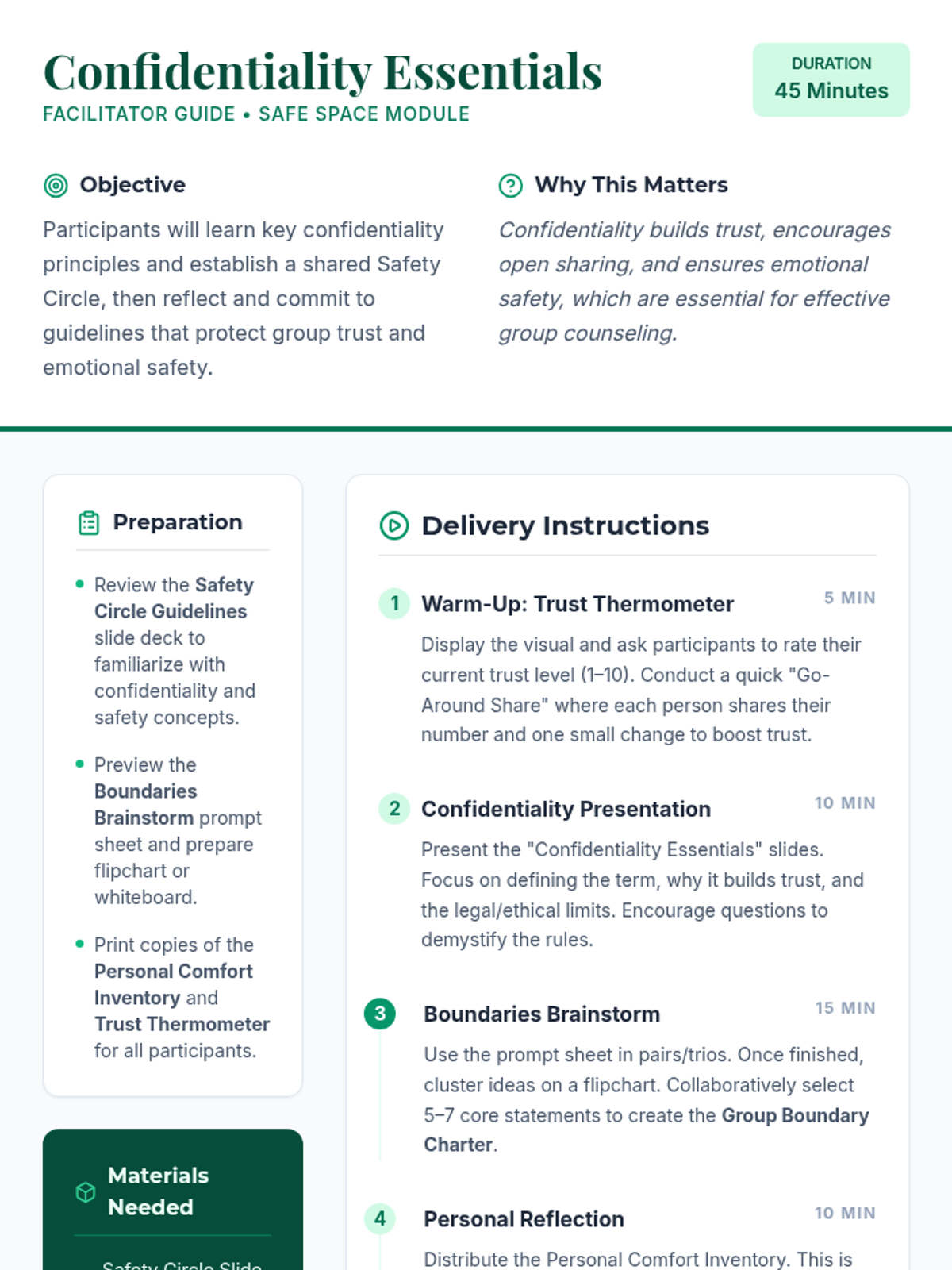 A 45-minute Tier 2 group counseling module for adults focused on establishing confidentiality, emotional safety, and trust within a group setting through interactive activities and reflection.