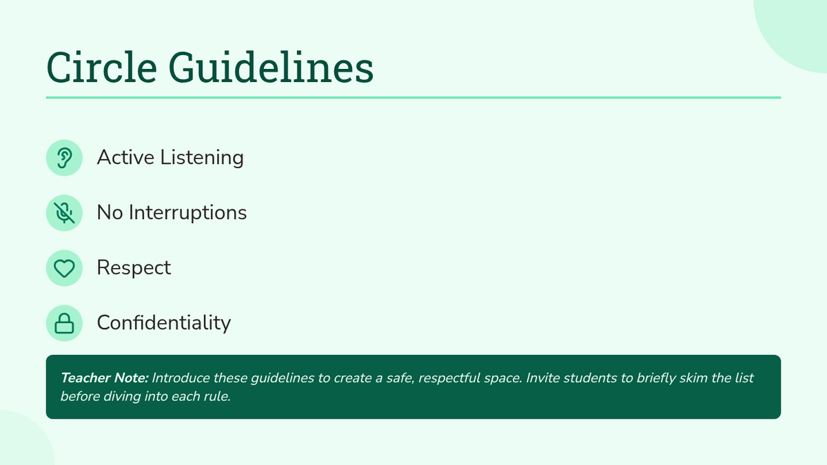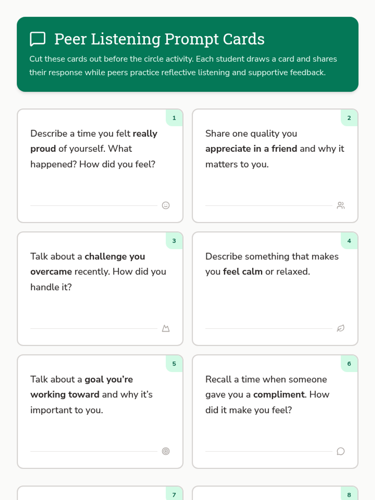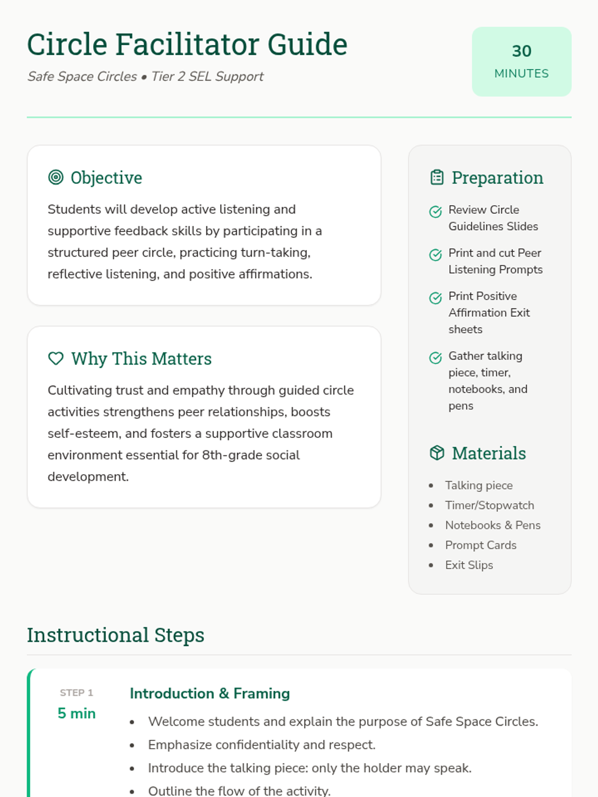 A 30-minute Tier 2 circle activity for 8th grade students to practice active listening and supportive feedback to strengthen trust and community.