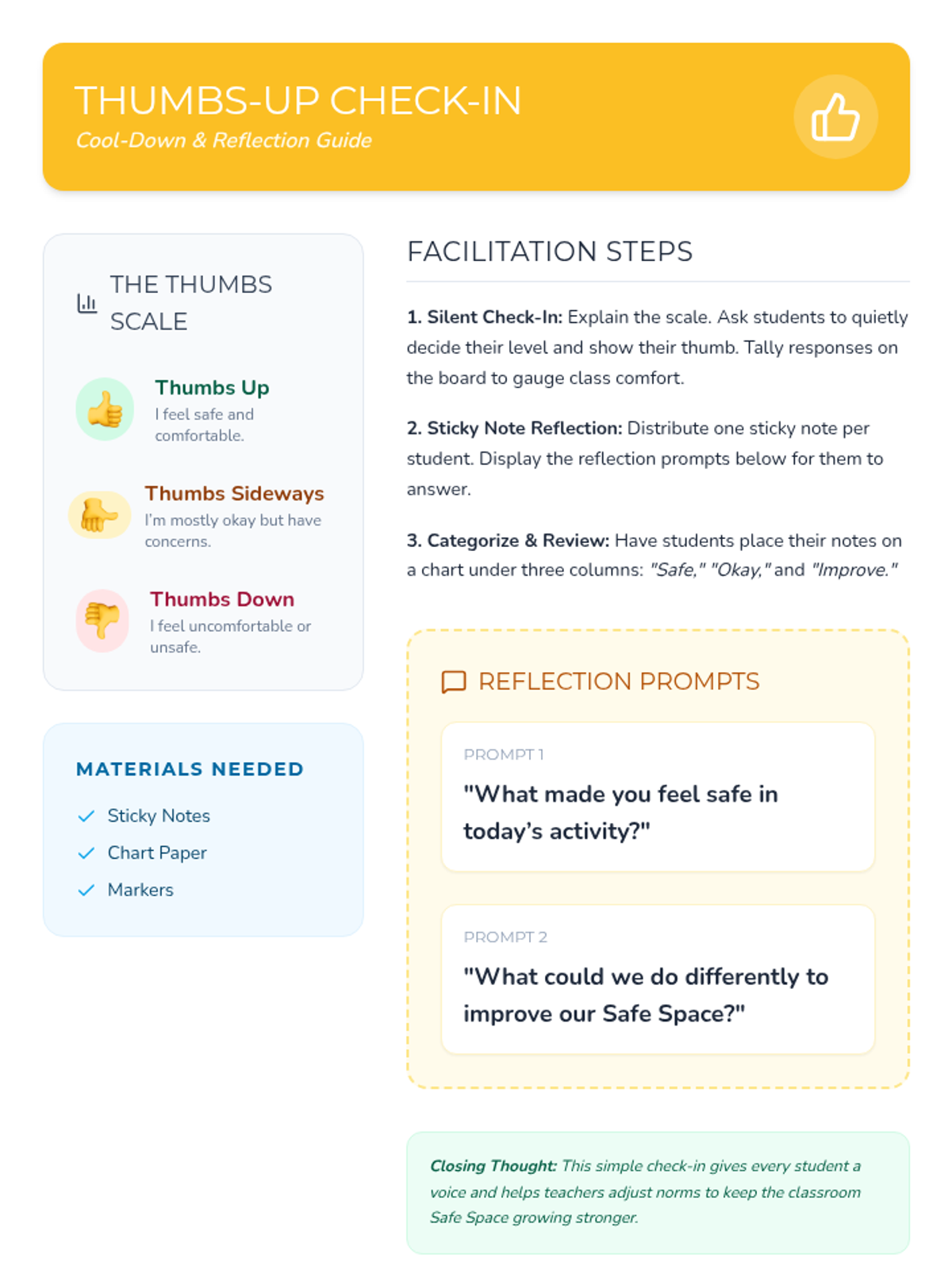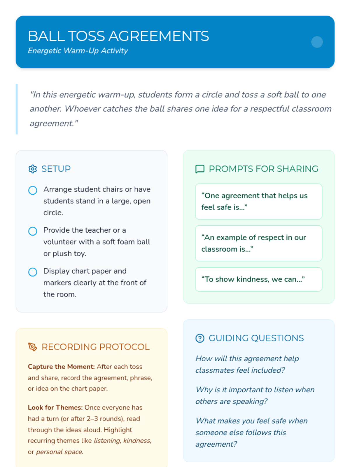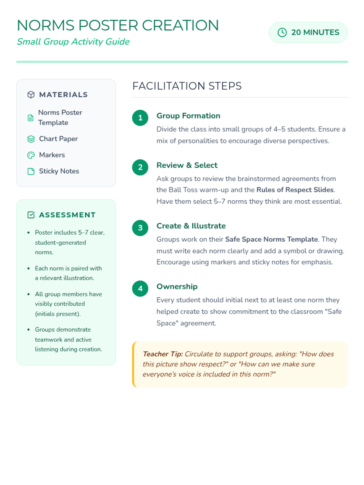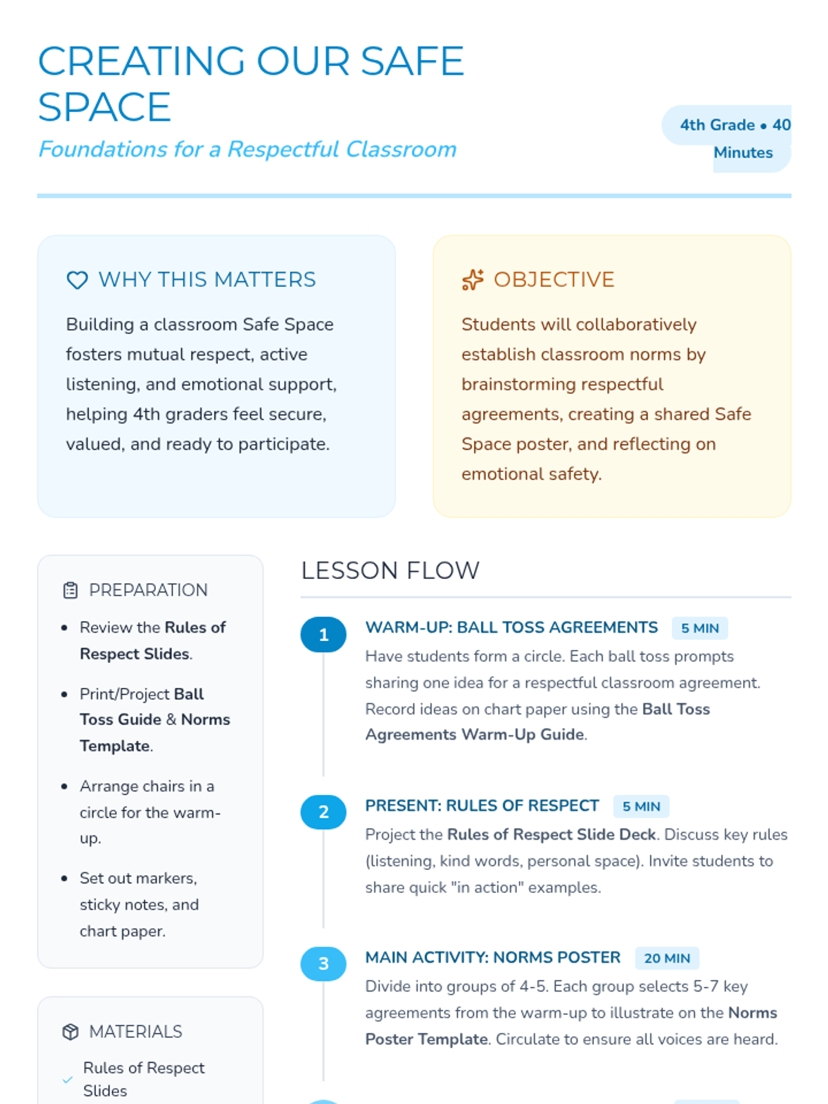 This lesson helps 4th graders establish group norms and build an emotionally safe classroom environment through collaborative activities. Students will learn respect, active listening, and mutual support in a fun, engaging 40-minute session.
