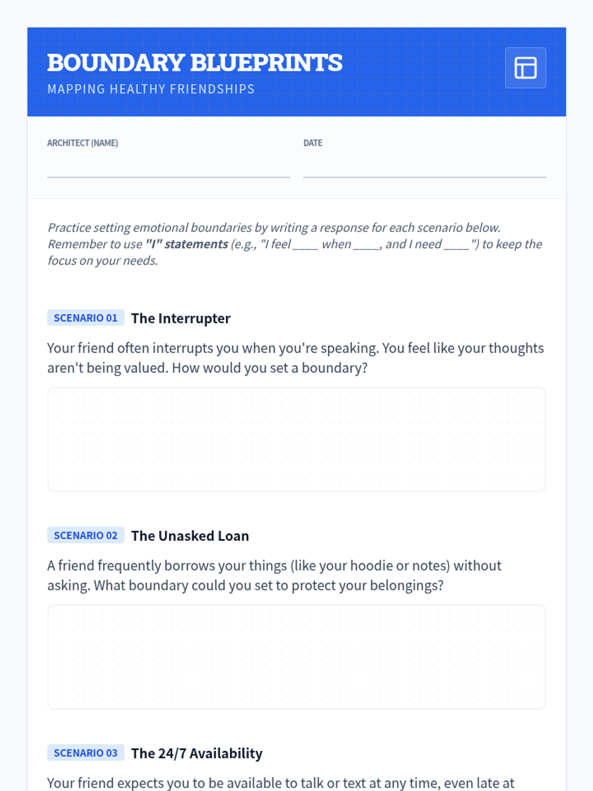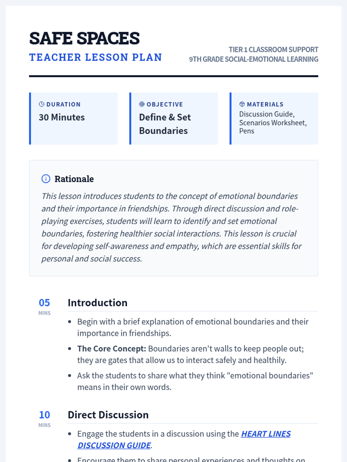 This lesson introduces 9th-grade students to emotional boundaries, helping them identify, communicate, and respect personal limits in friendships to foster healthier social interactions.