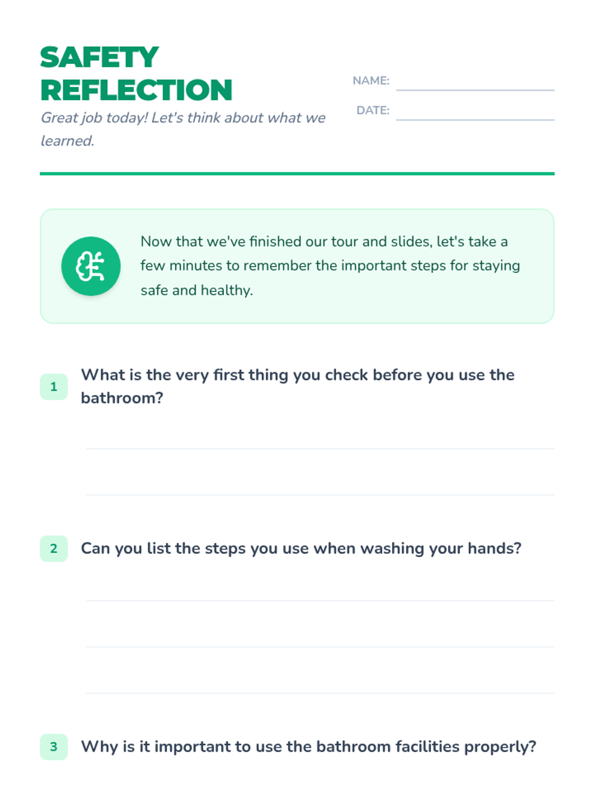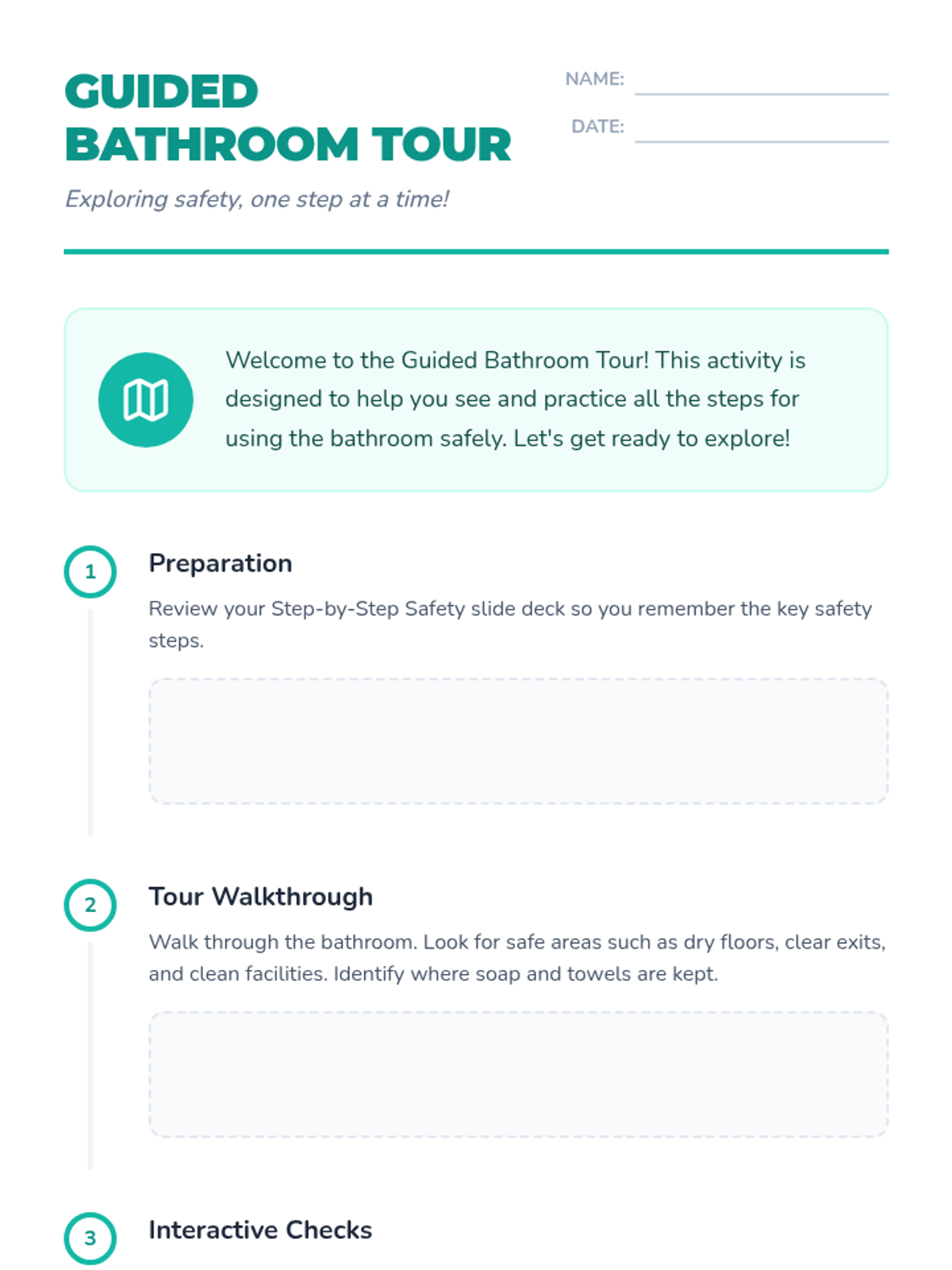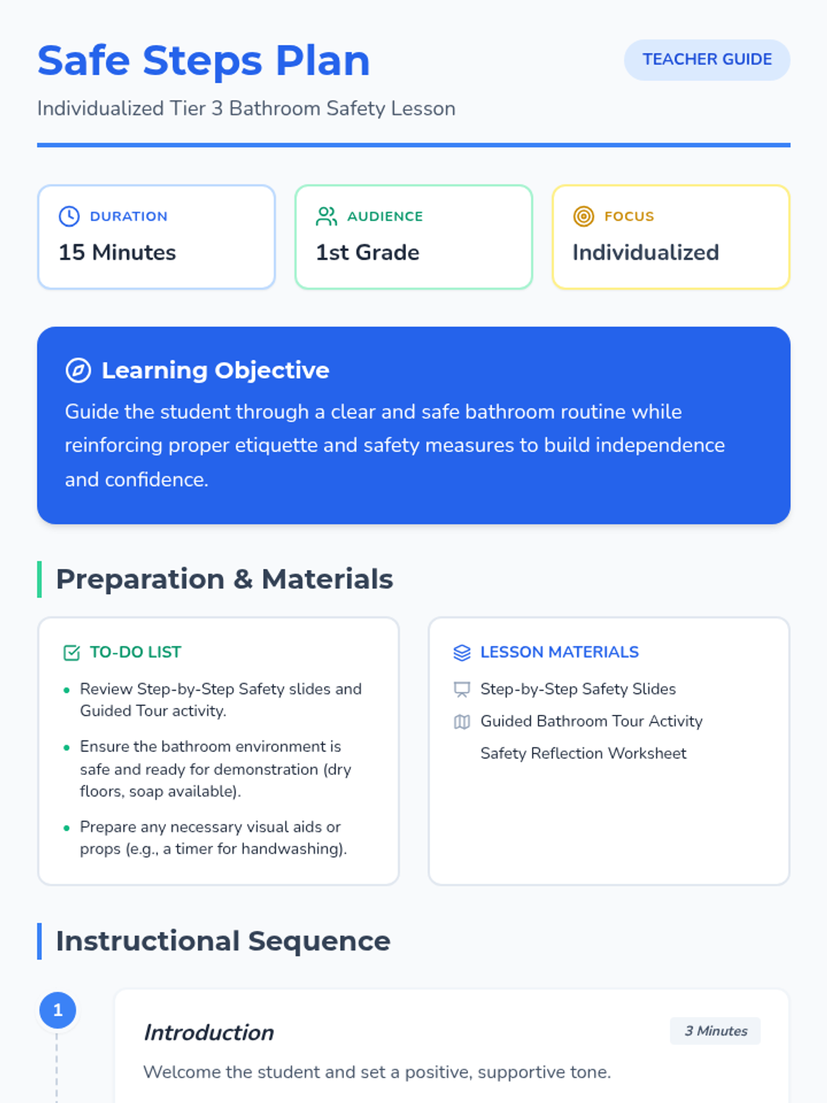 An individualized Tier 3 lesson focused on navigating the bathroom safely and maintaining proper hygiene. Includes a guided tour, step-by-step safety instruction, and reflective activities.