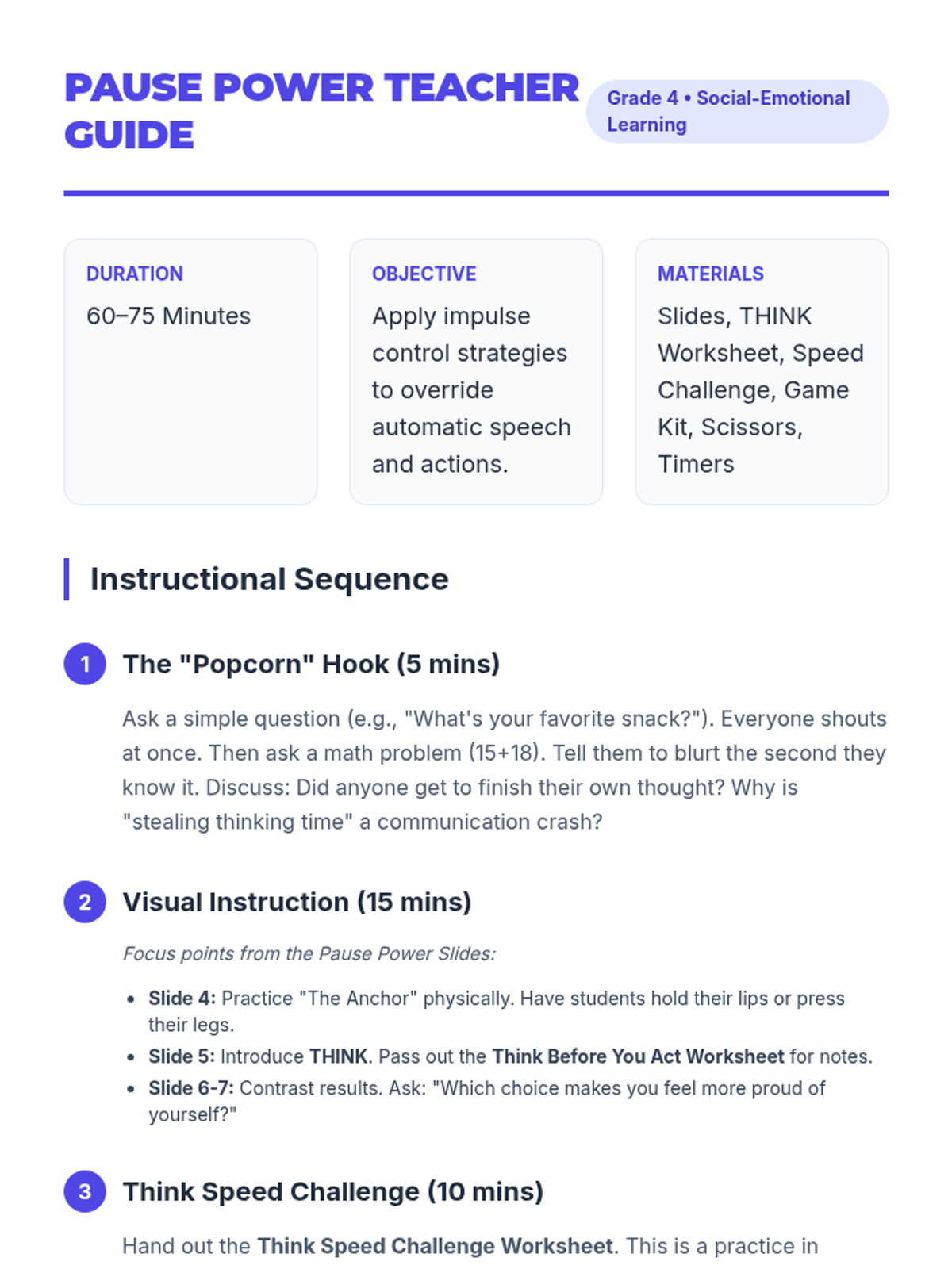 Focuses on impulse control by teaching the 'Stop, Think, Act' method, helping students recognize high-pressure moments and choose thoughtful responses over instant reactions.
