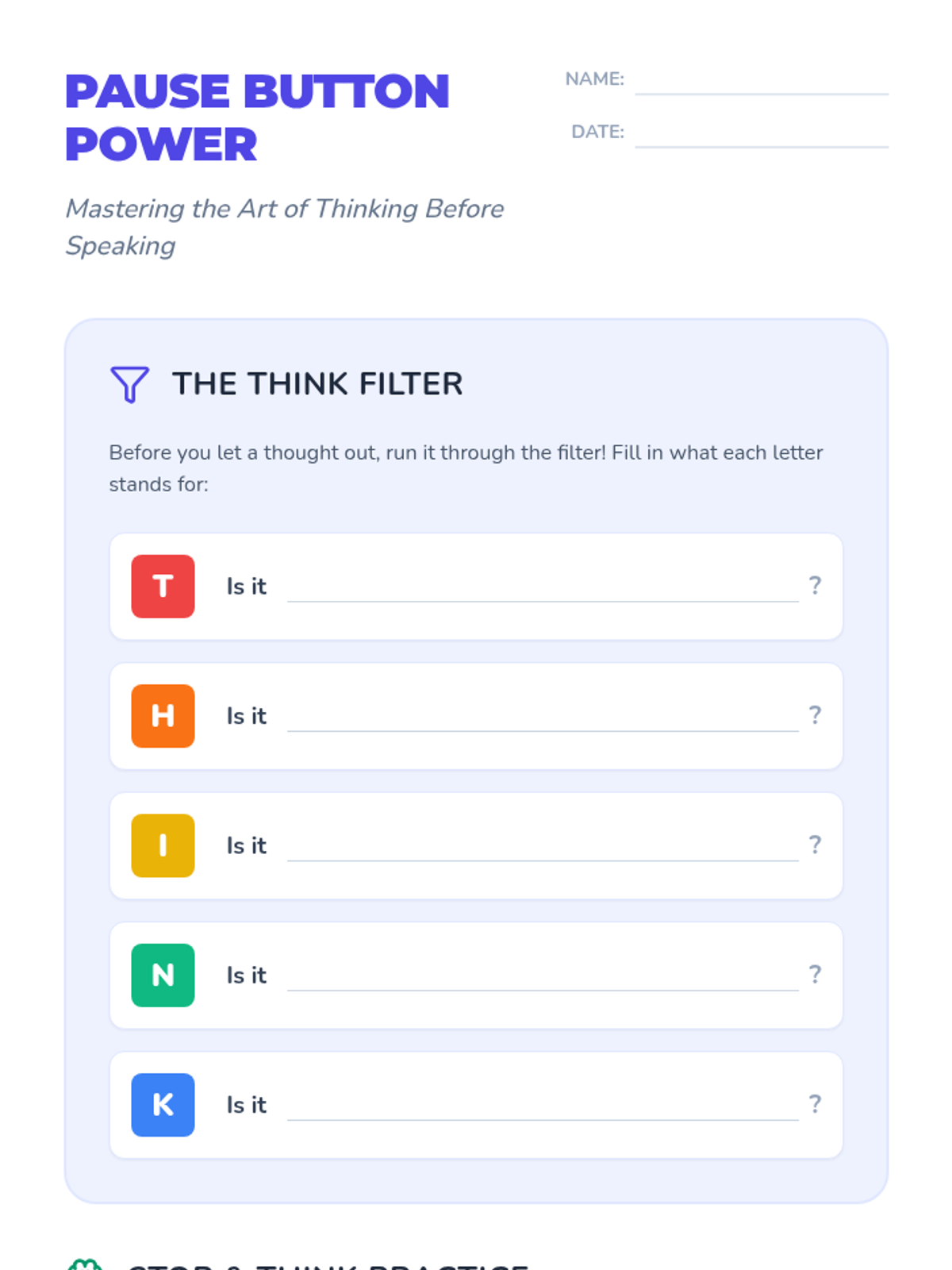 Students learn the THINK filter and explore how words can help or hurt others through a social narrative and interactive activities.