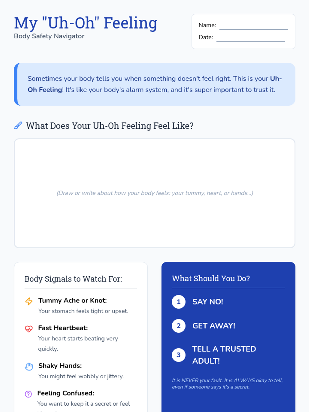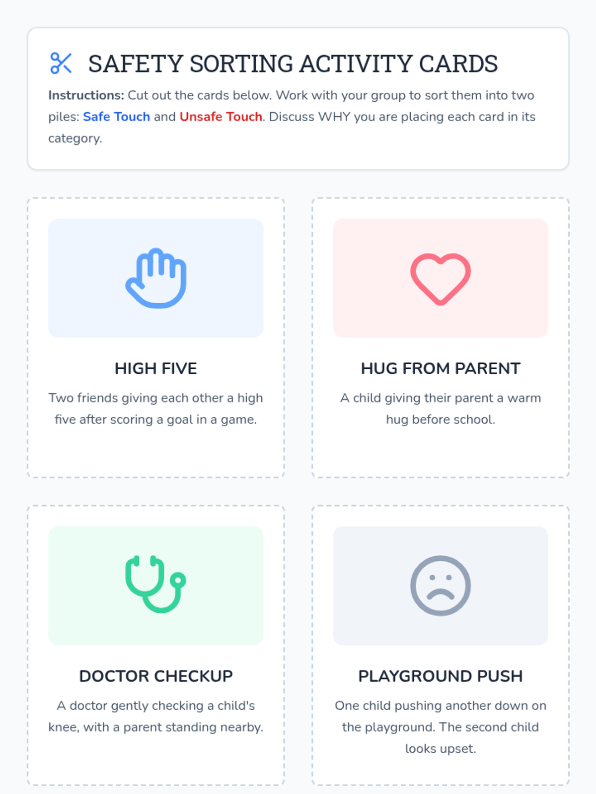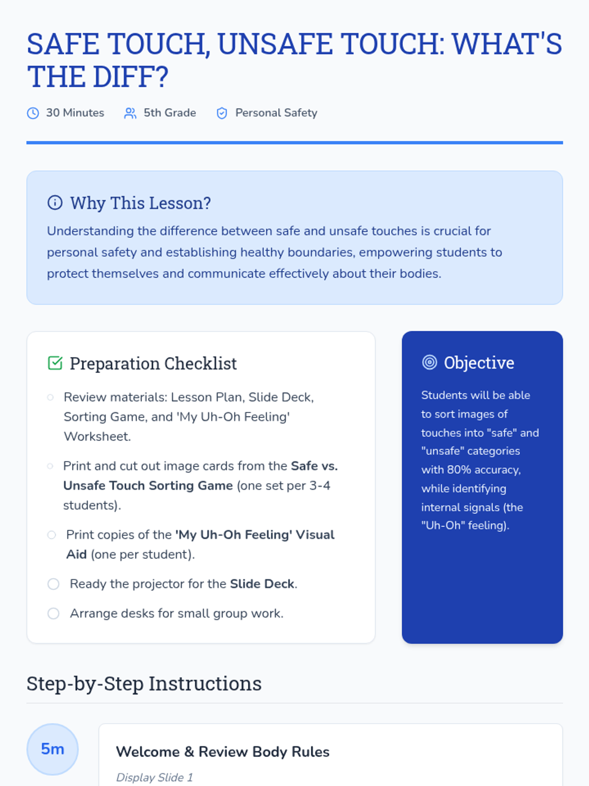 A 30-minute lesson for 5th graders focused on distinguishing between safe and unsafe touches, recognizing the 'uh-oh' feeling, and identifying trusted adults. Students engage in a sorting activity to apply their understanding of personal boundaries.