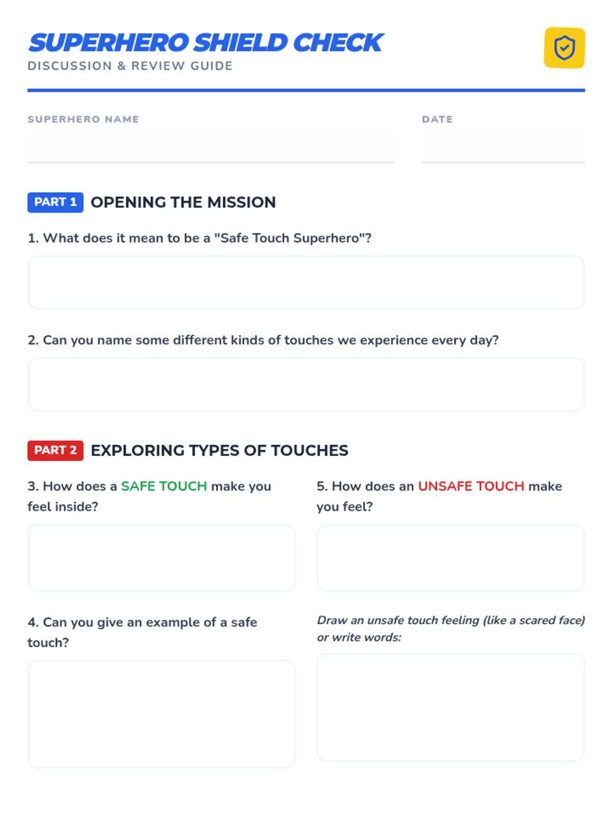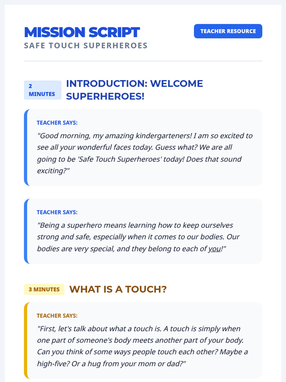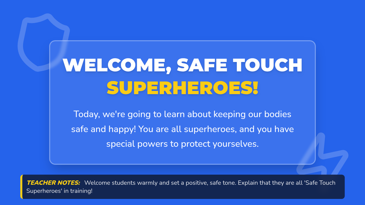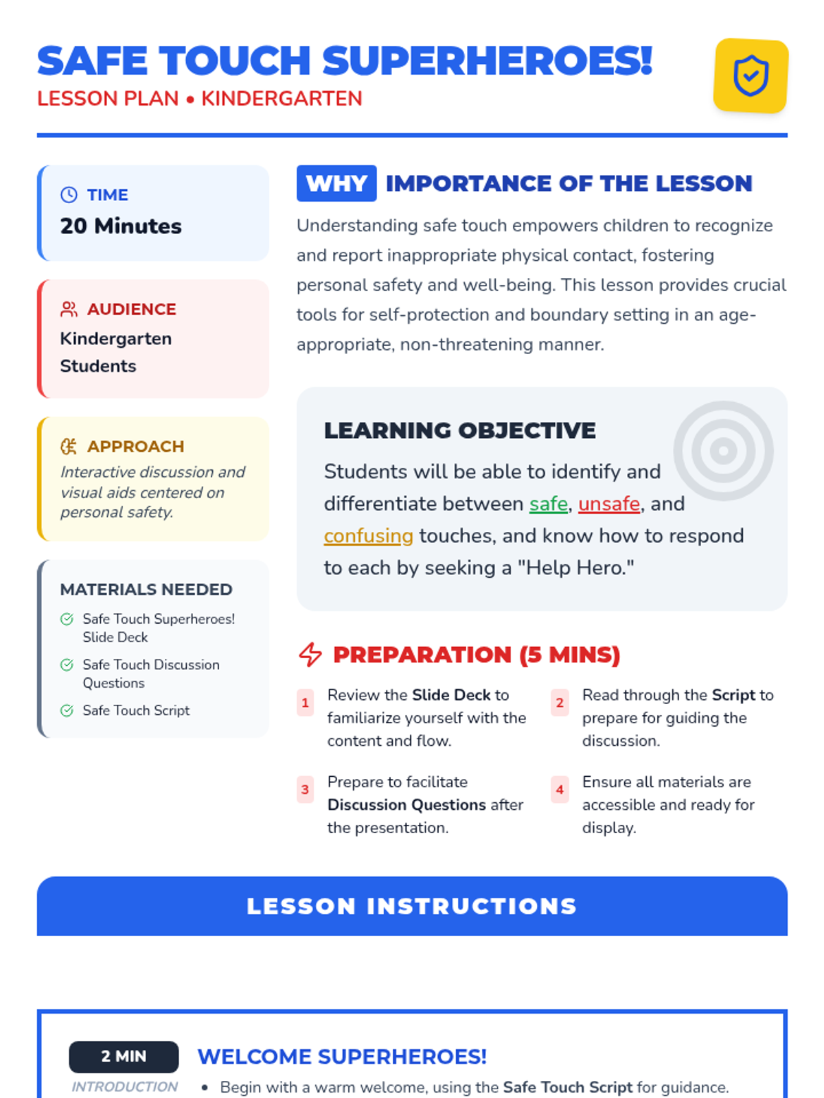 A 20-minute Kindergarten lesson that uses a superhero theme to teach students about safe, unsafe, and confusing touches, empowering them with bodily autonomy and identifying trusted 'Help Heroes'.