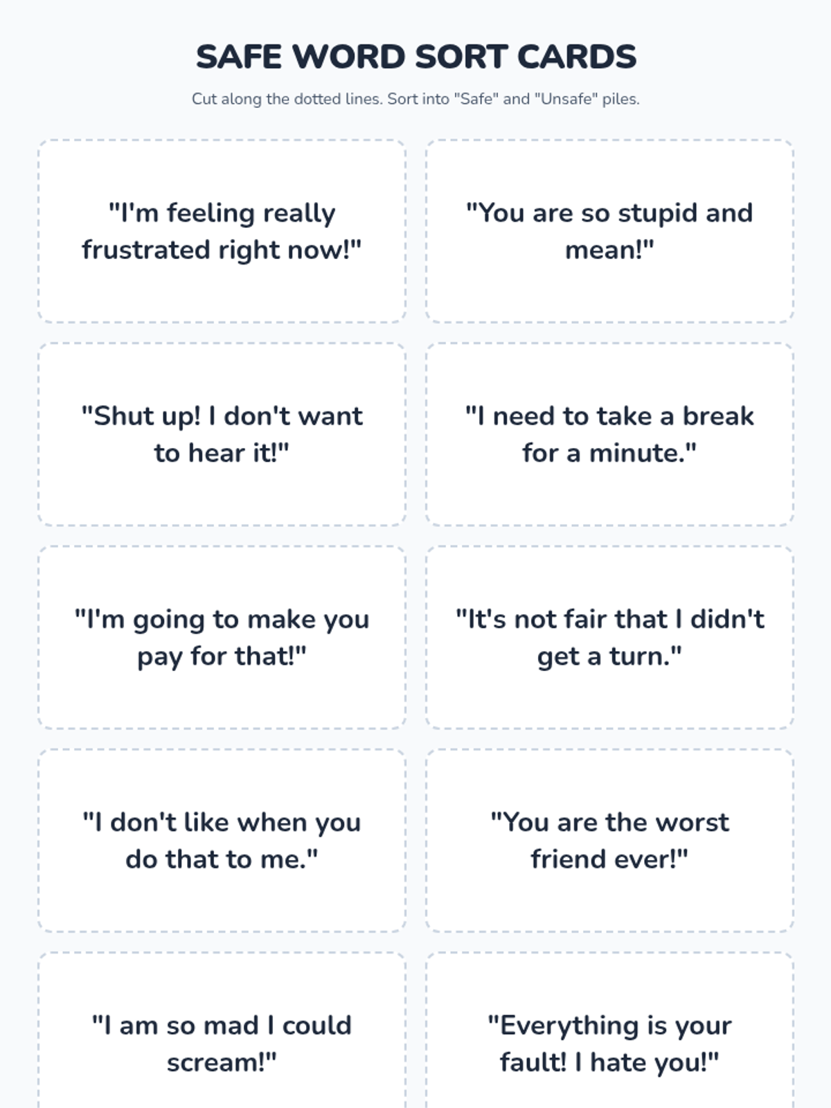 A 30-minute social-emotional learning lesson for 3rd graders on identifying and using safe language when experiencing anger. Students learn the impact of their words and practice sorting safe and unsafe phrases.