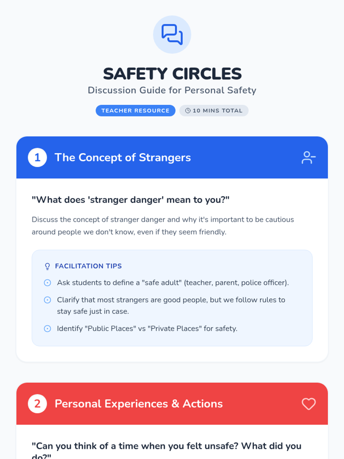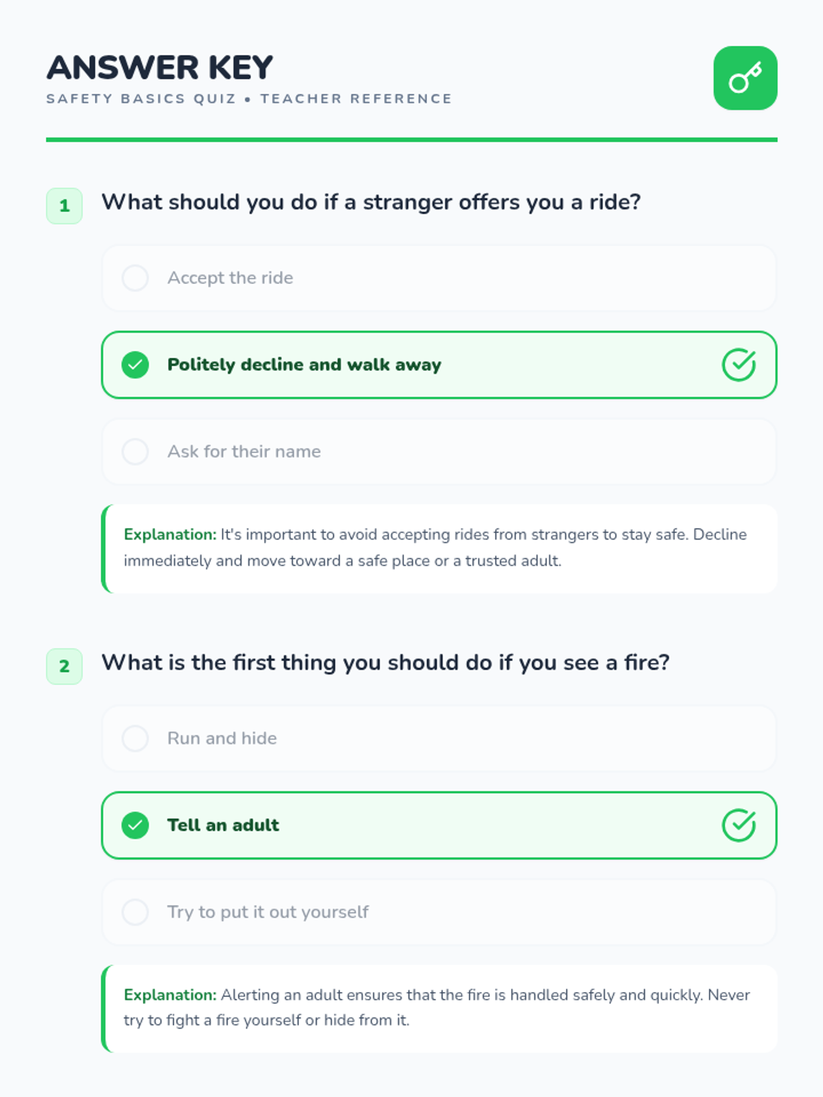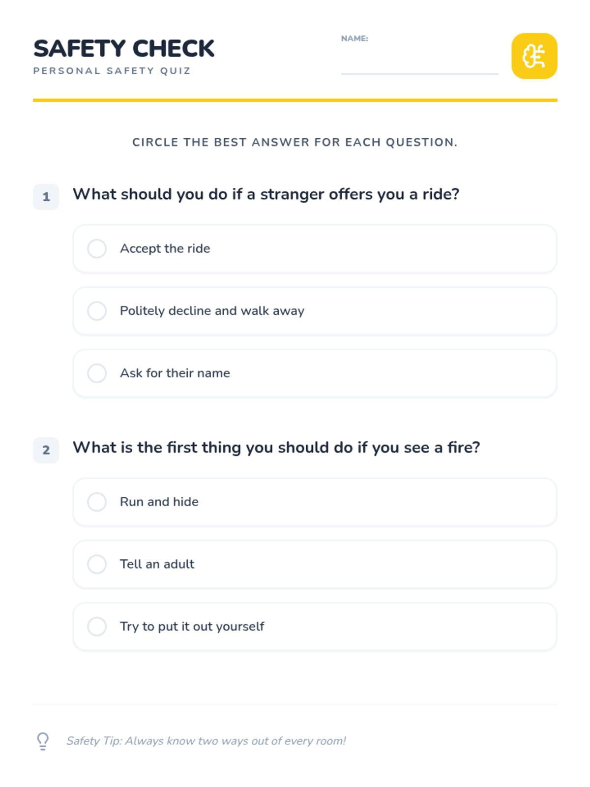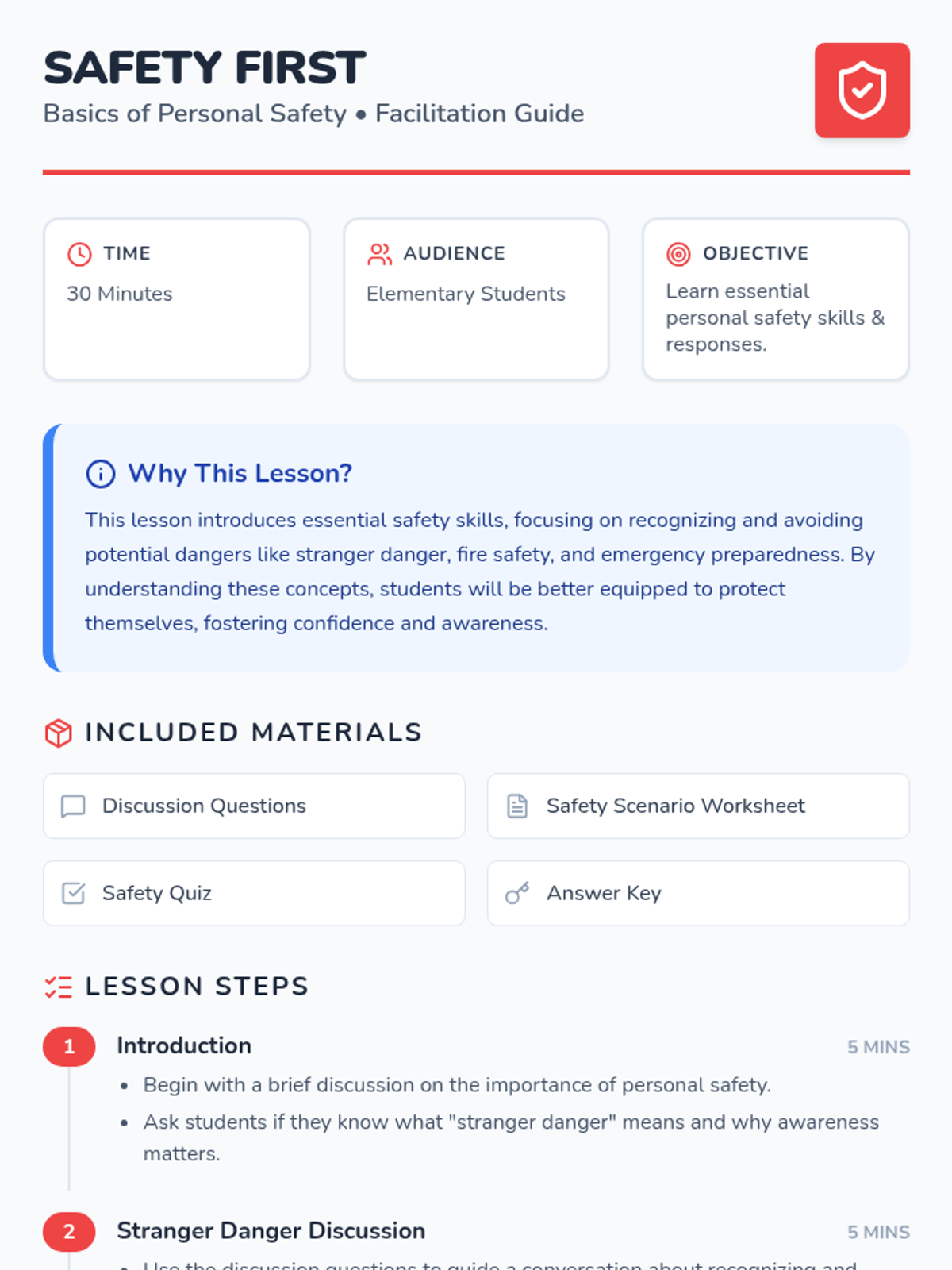 This lesson introduces elementary students to essential safety skills, focusing on recognizing and avoiding potential dangers such as stranger danger, fire safety, and emergency preparedness. By understanding these concepts, students will be better equipped to protect themselves in various situations, fostering a sense of confidence and awareness.