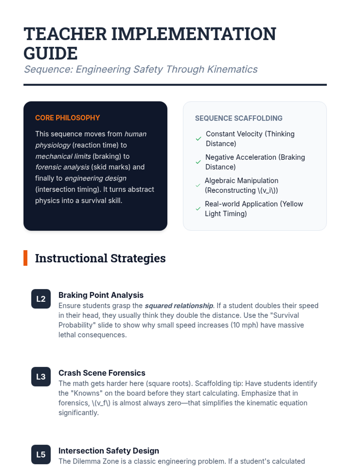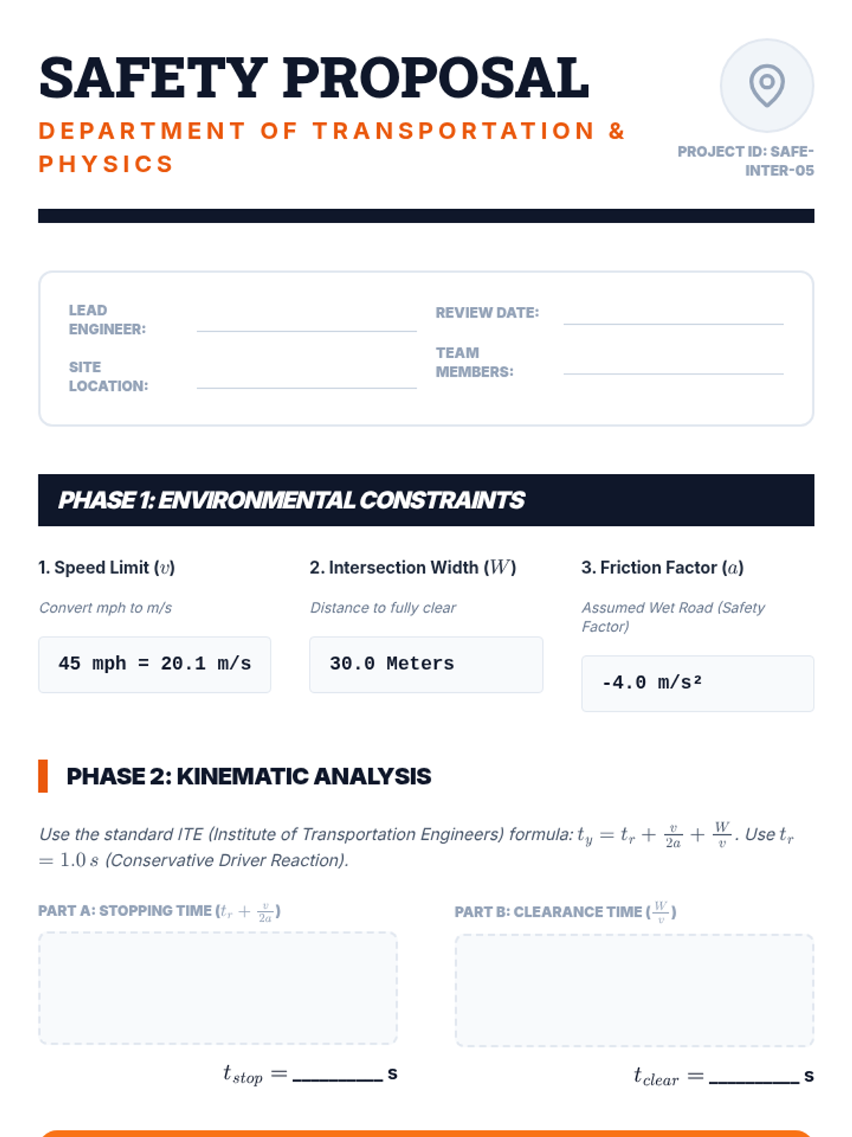 Students apply their knowledge to design a safer traffic intersection, calculating optimal yellow-light timing to eliminate the 'dilemma zone.'