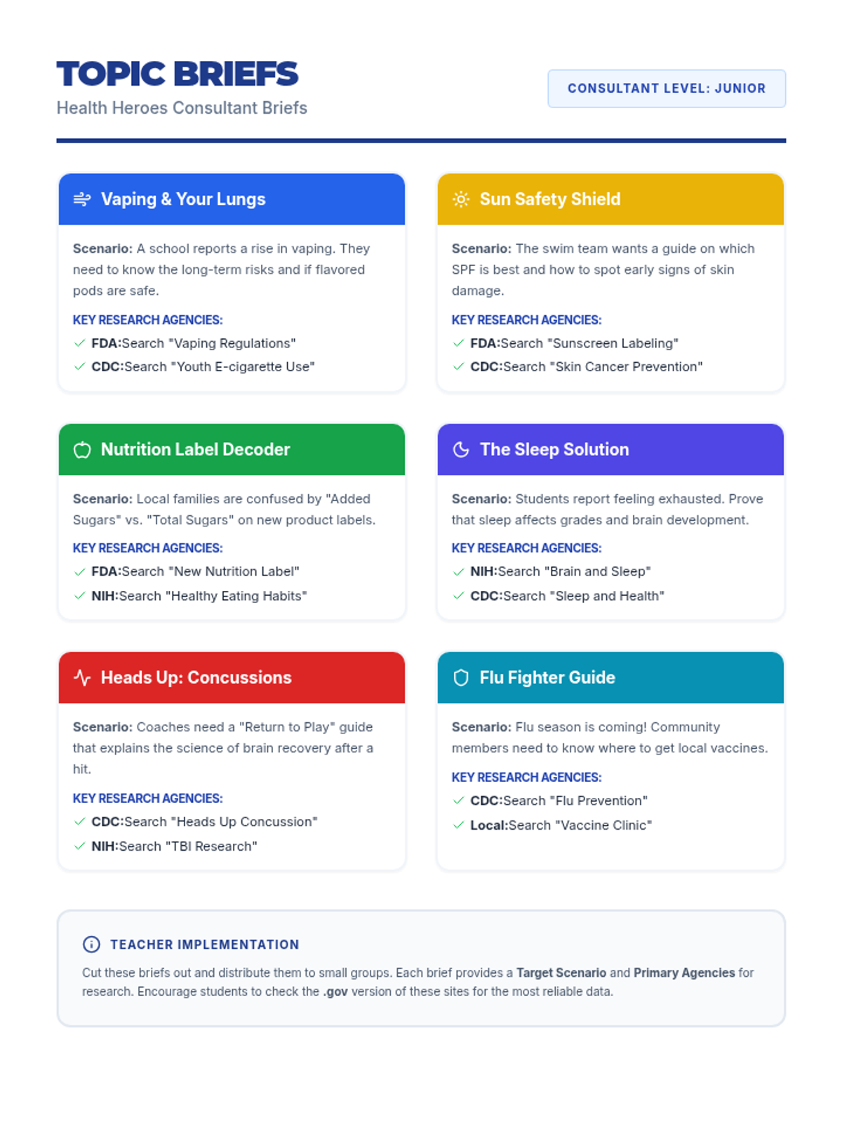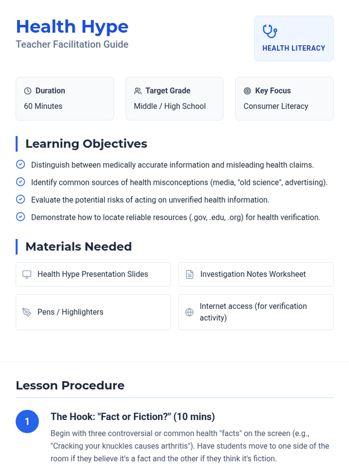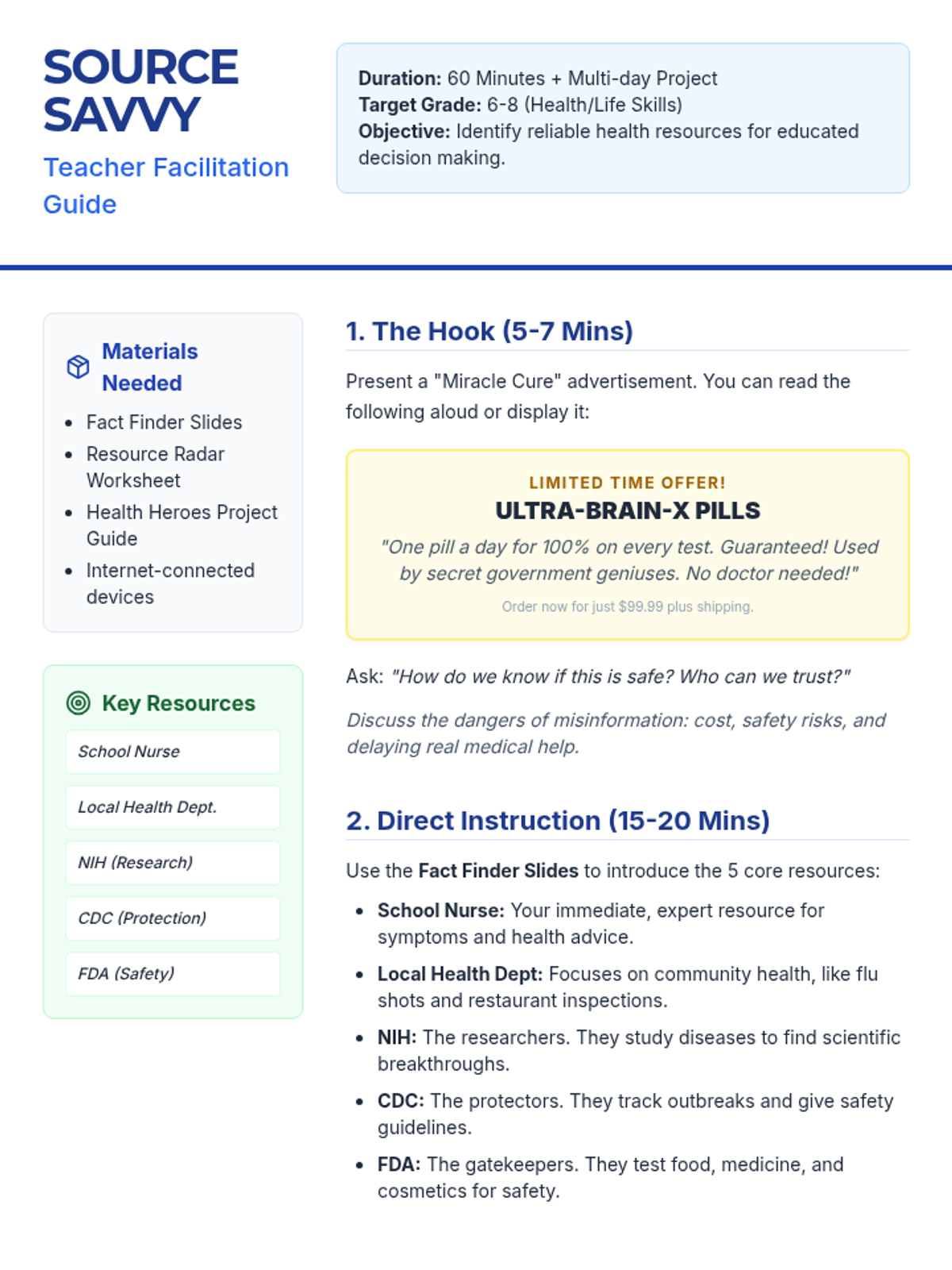 A comprehensive lesson teaching students how to identify and utilize reliable health resources like the CDC, FDA, and school health professionals to make informed health decisions. Includes a multi-day community health project.