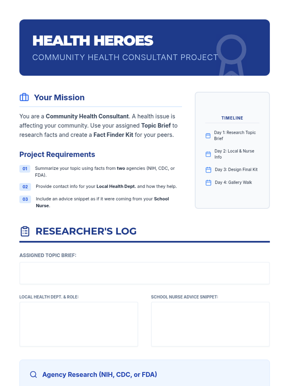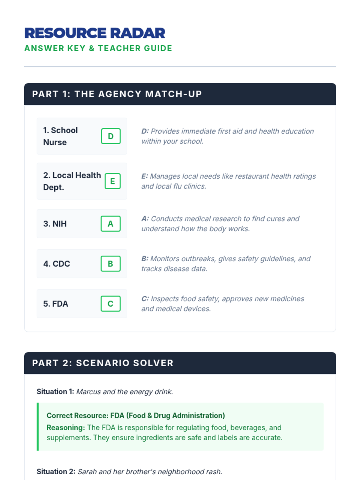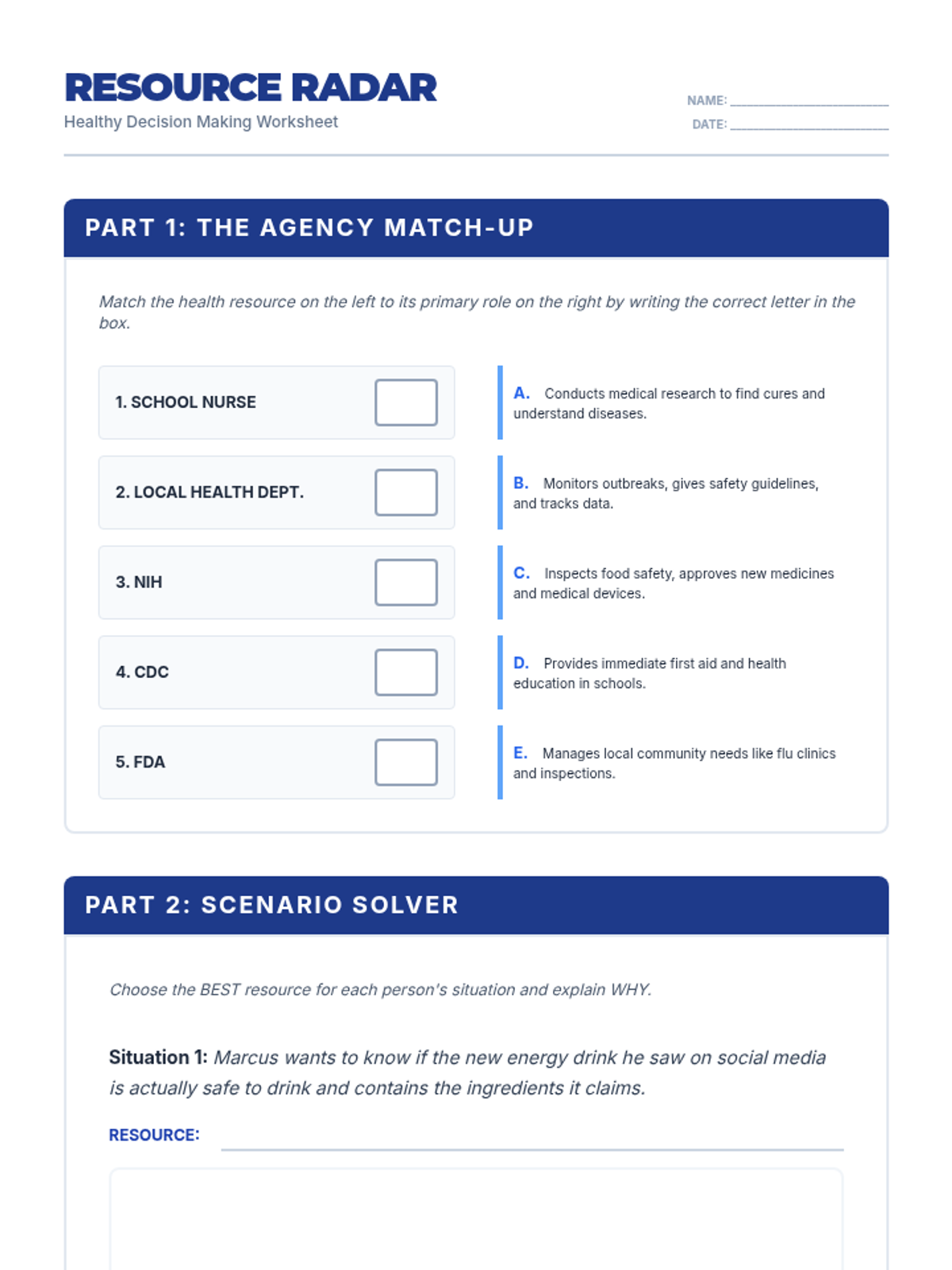 A comprehensive lesson teaching students how to identify and utilize reliable health resources like the CDC, FDA, and school health professionals to make informed health decisions. Includes a multi-day community health project.