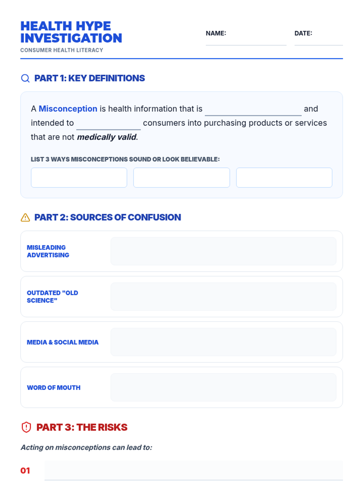 Students learn to distinguish between medically accurate information and health misconceptions by identifying sources of misinformation, understanding the risks of 'quackery,' and practicing how to verify health claims using reliable resources.