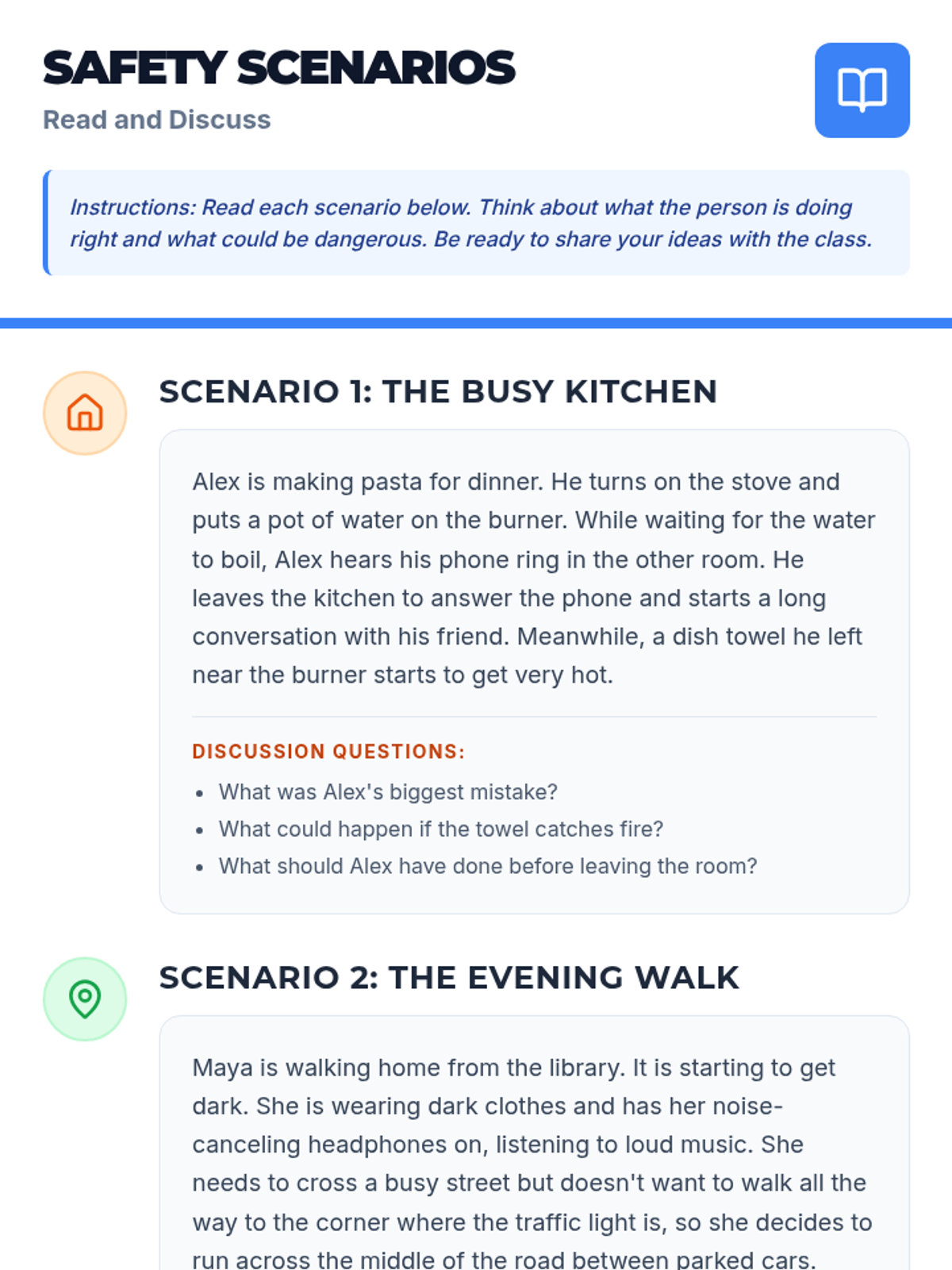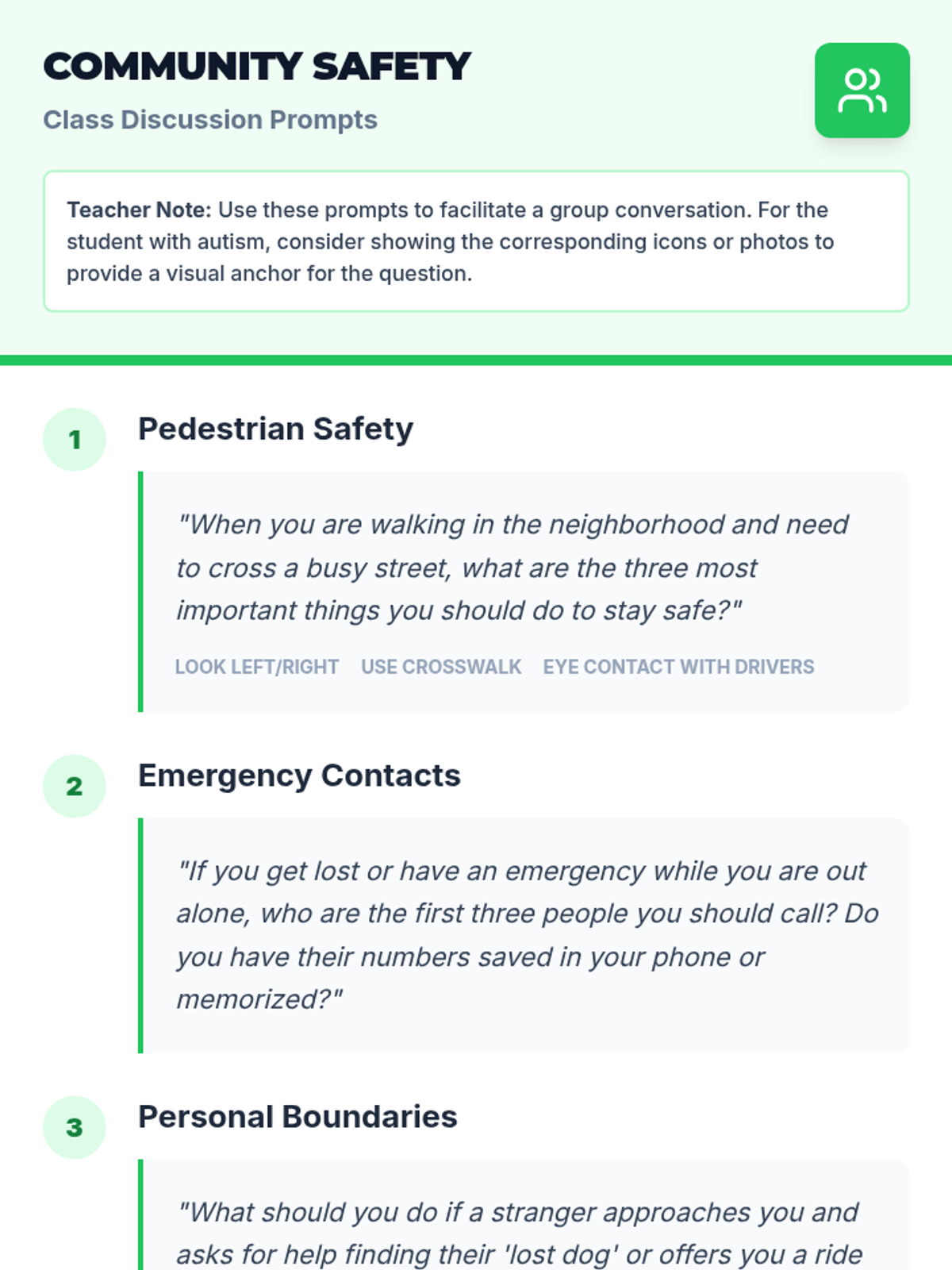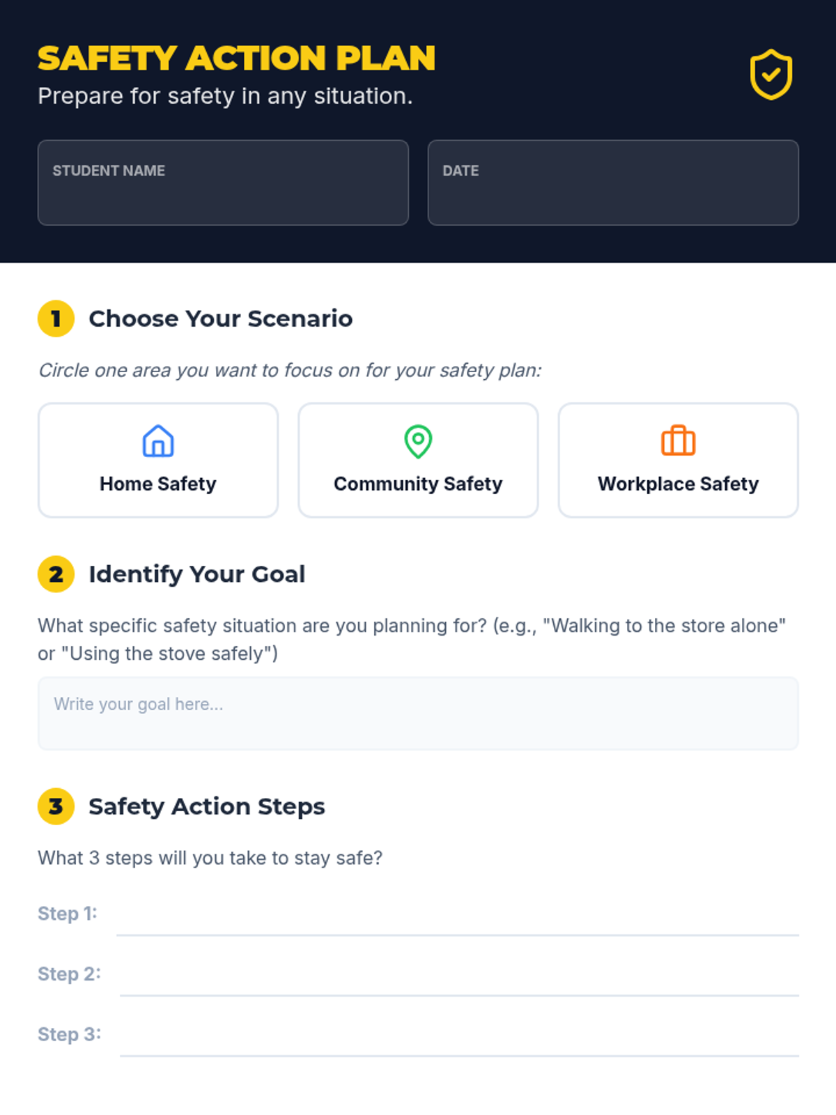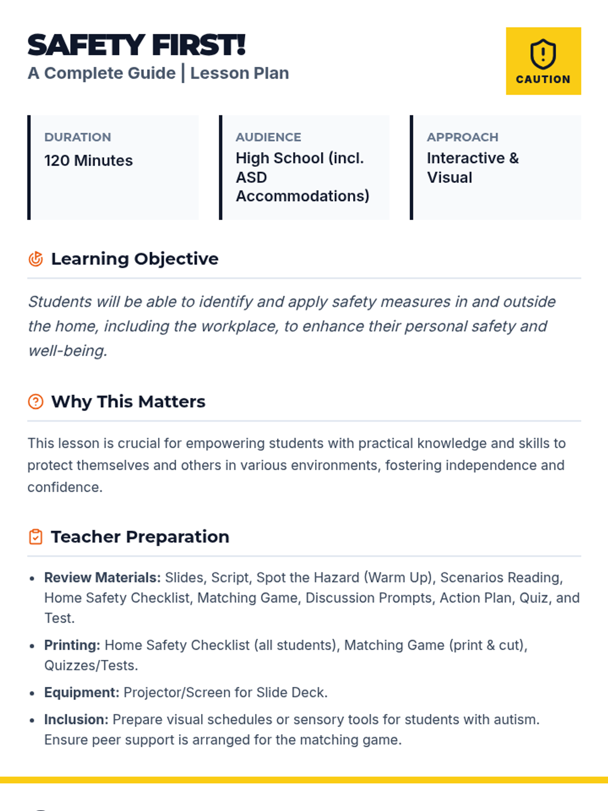 A comprehensive 120-minute session focused on empowering students with practical safety knowledge for home, community, and the workplace. Includes interactive activities, visual aids, and specific accommodations for students with diverse learning needs.