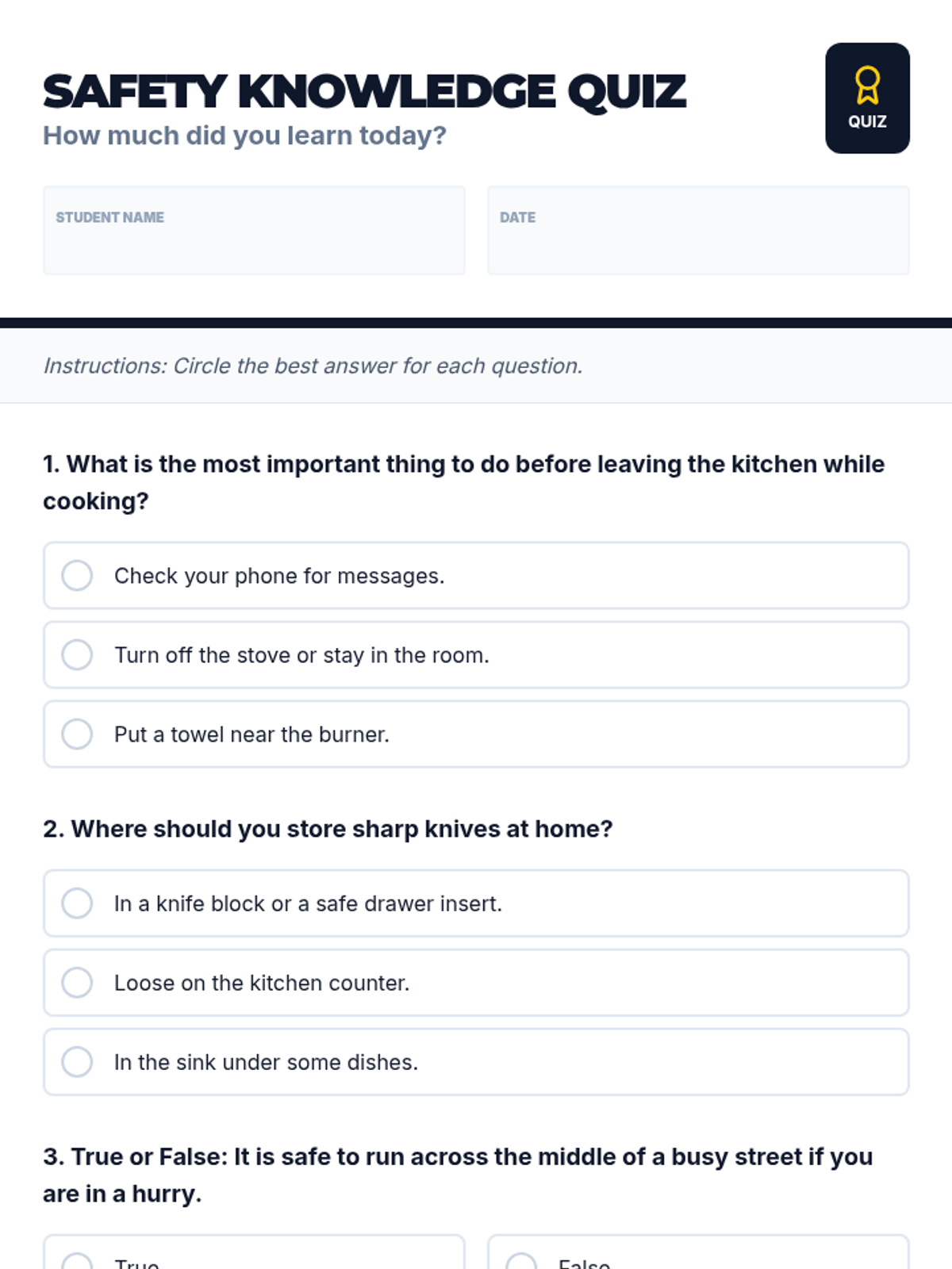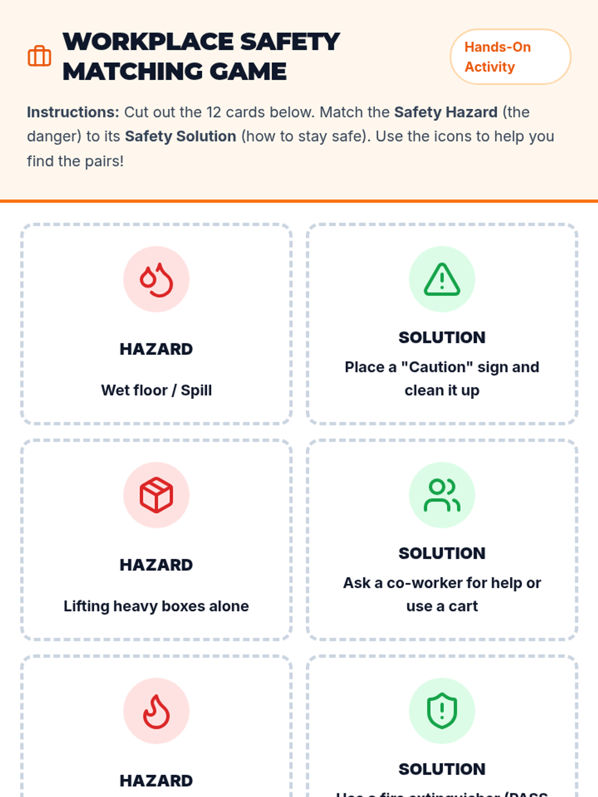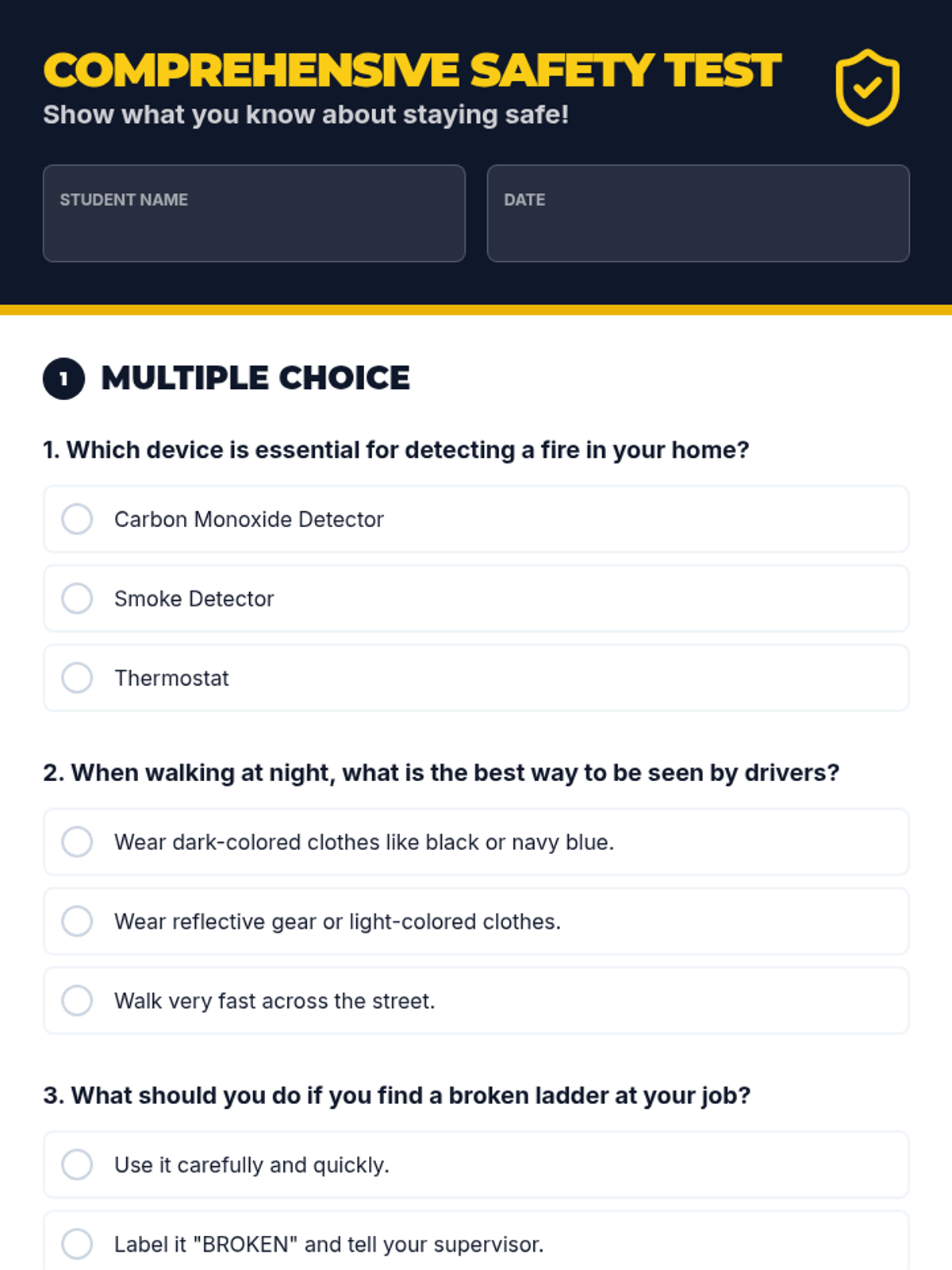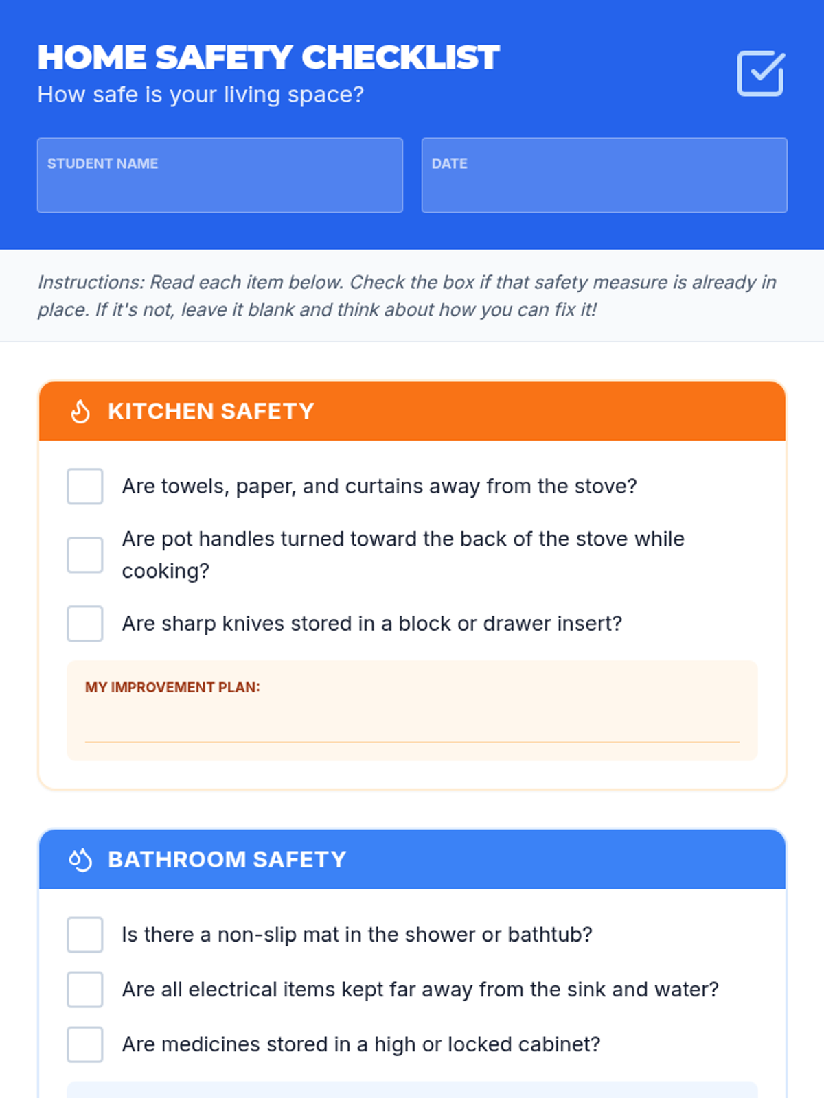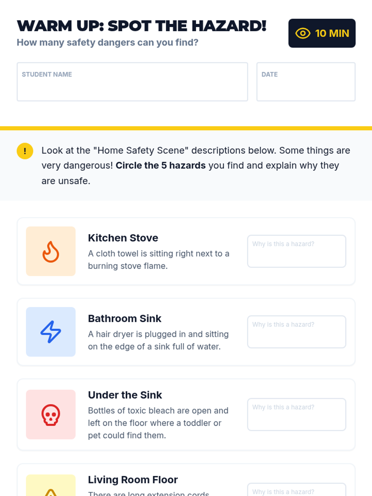 A comprehensive 120-minute session focused on empowering students with practical safety knowledge for home, community, and the workplace. Includes interactive activities, visual aids, and specific accommodations for students with diverse learning needs.