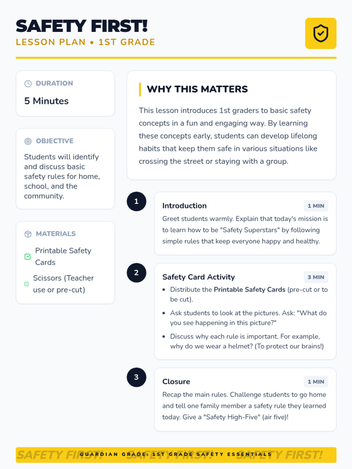 This lesson introduces 1st graders to basic safety concepts in various environments like home, school, and the playground through visual cards and discussion.