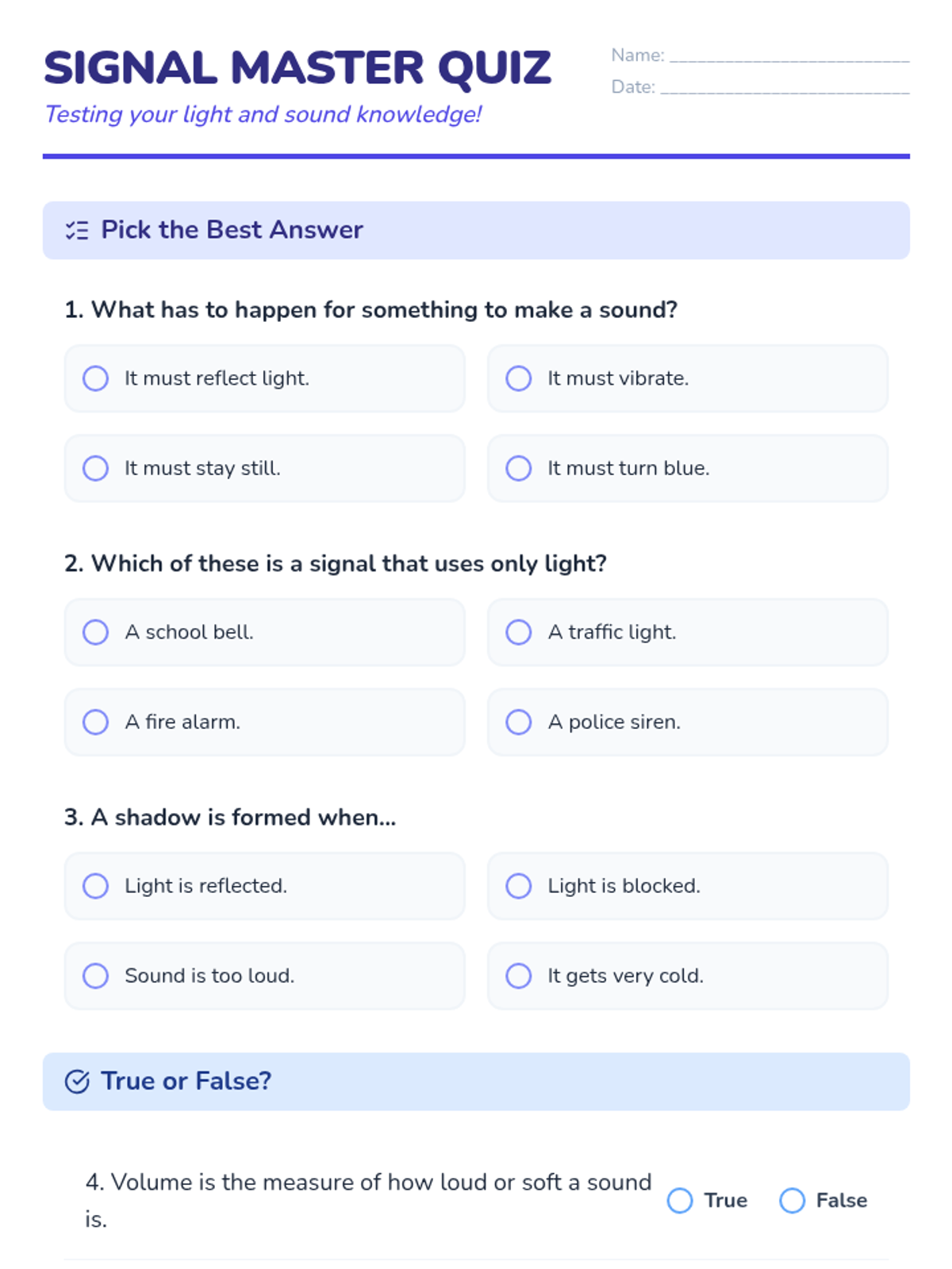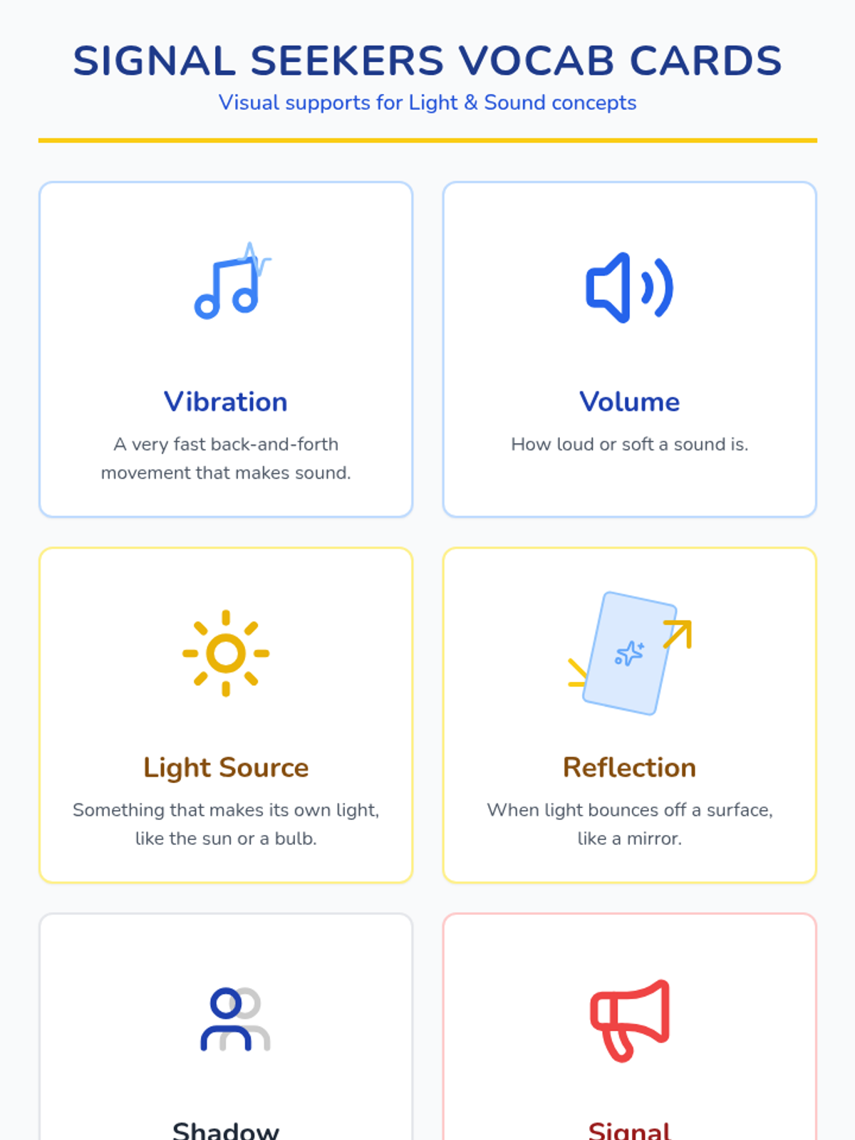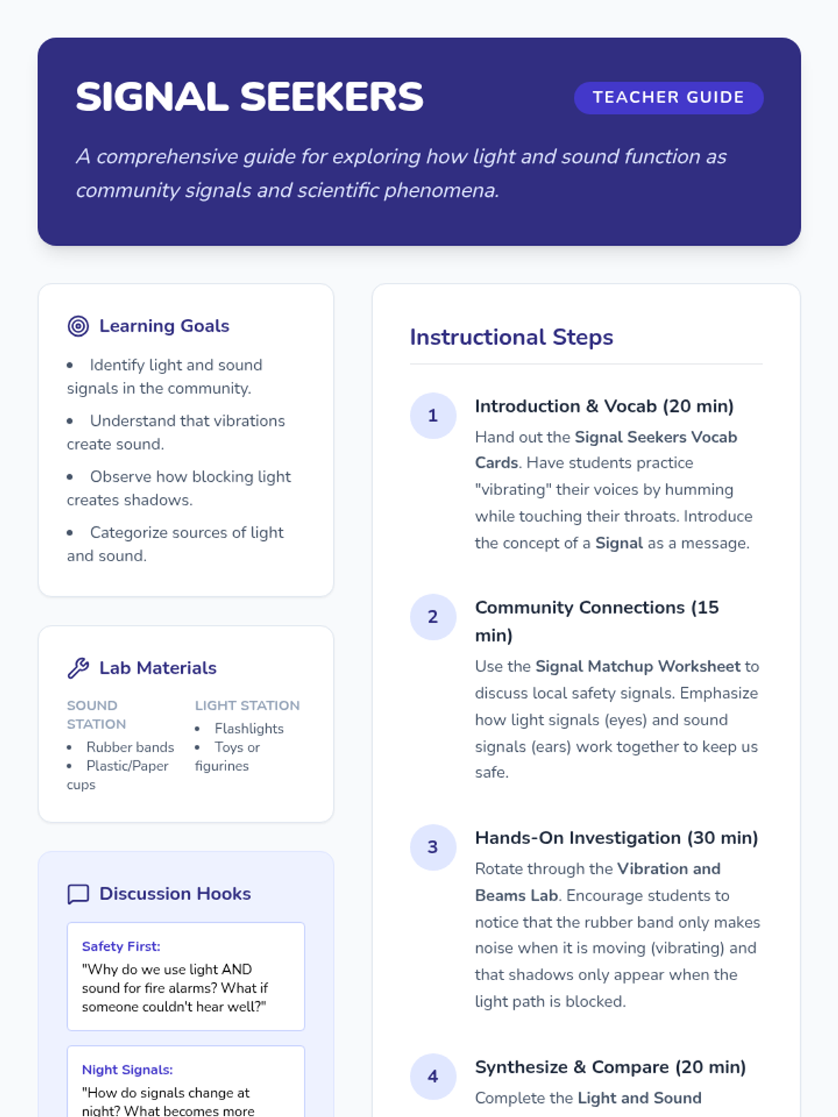 A comprehensive lesson exploring how light and sound function as signals in our community, how they are produced through vibrations and sources, and the unique properties of shadows and volume.