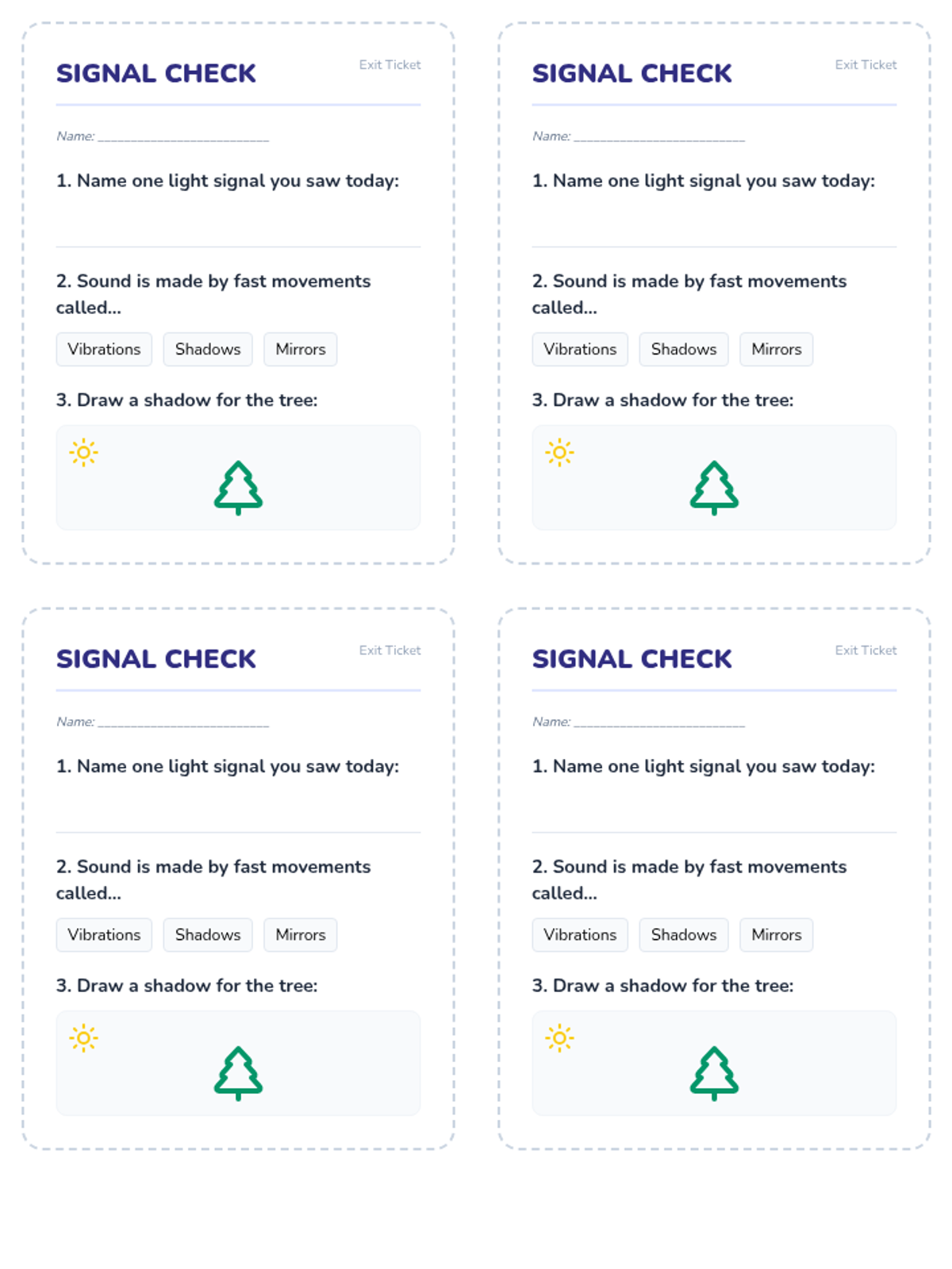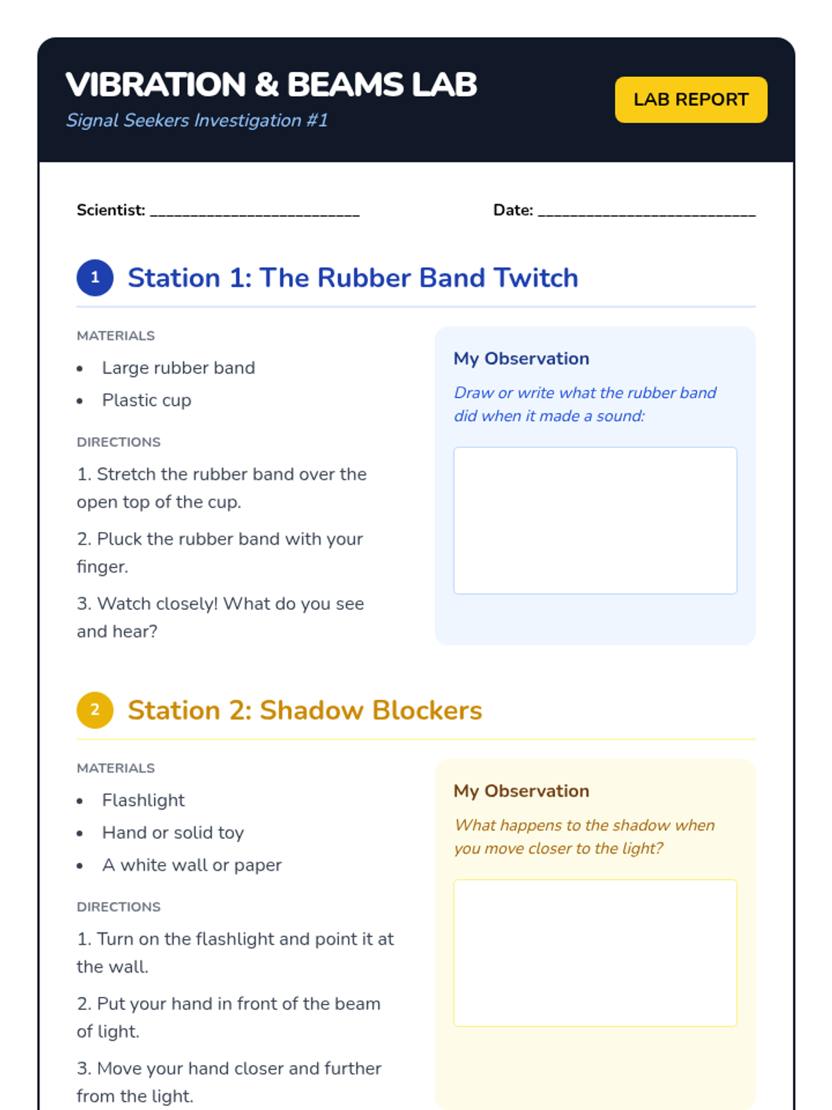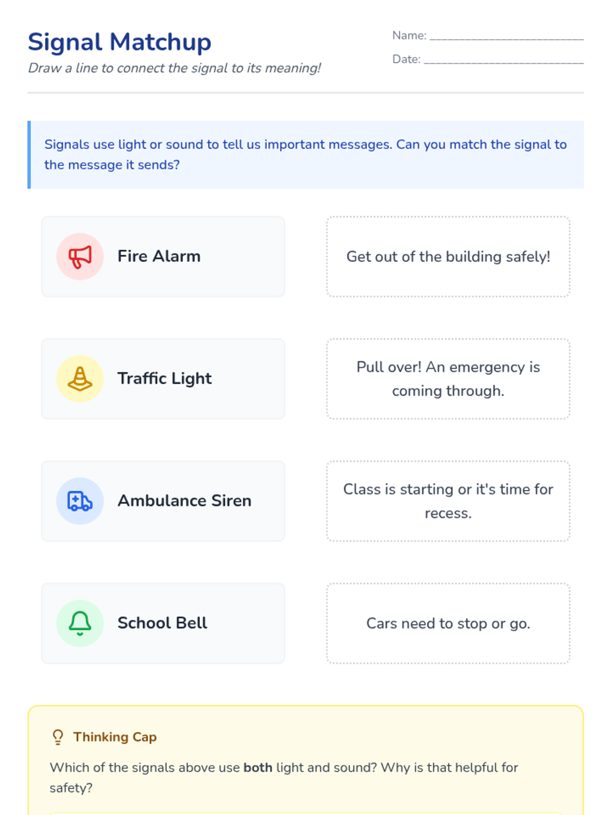 A comprehensive lesson exploring how light and sound function as signals in our community, how they are produced through vibrations and sources, and the unique properties of shadows and volume.