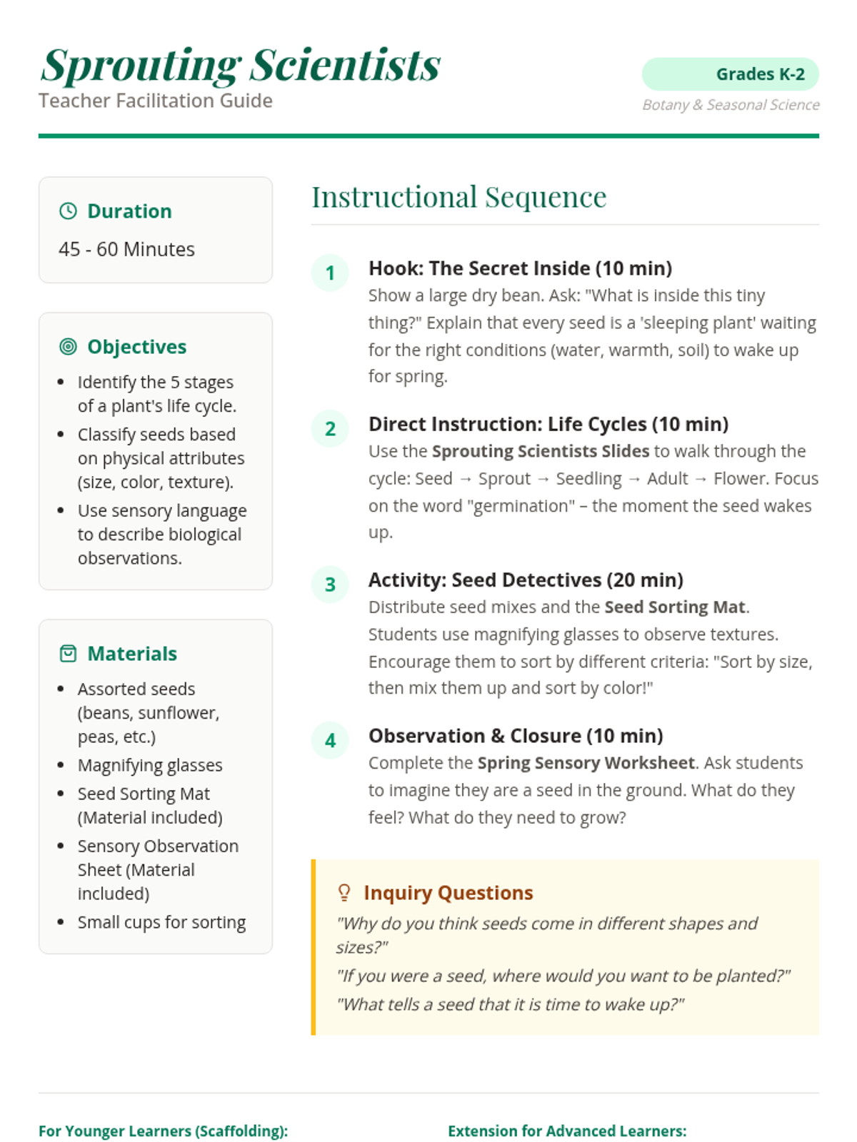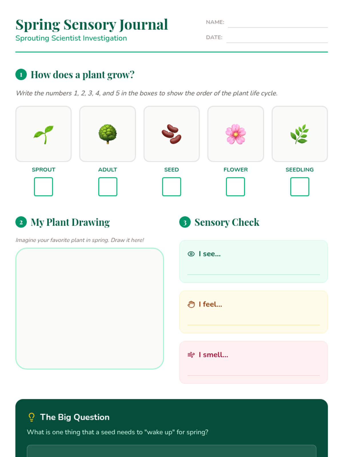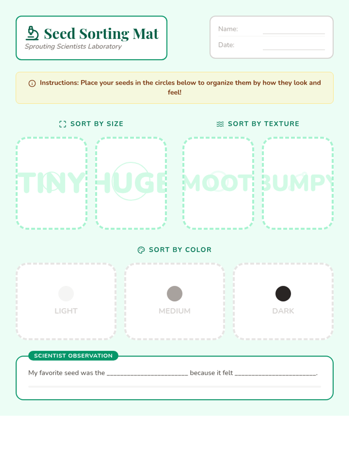 Students explore the plant life cycle through hands-on seed sorting and sensory observations, connecting biological processes to the arrival of spring.