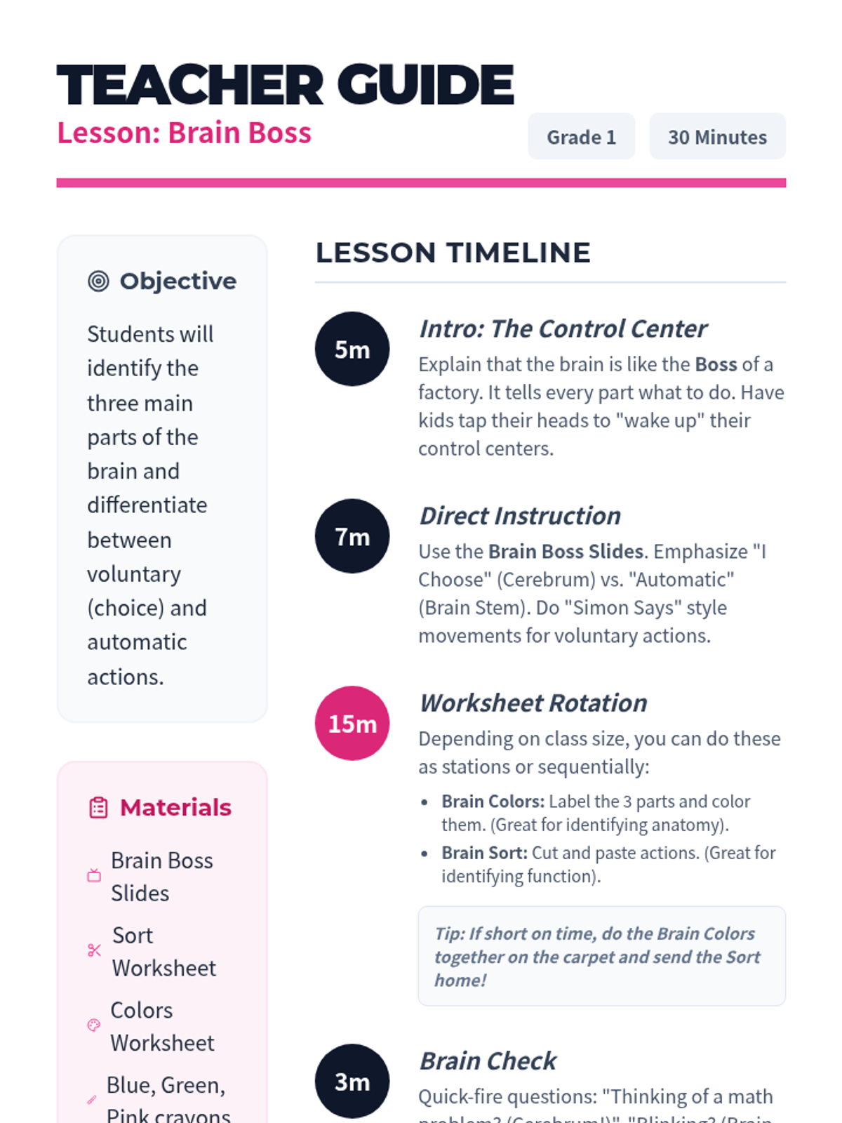 A 30-minute introductory lesson for 1st graders exploring how the brain acts as the body's "control center," managing both voluntary actions and automatic functions.