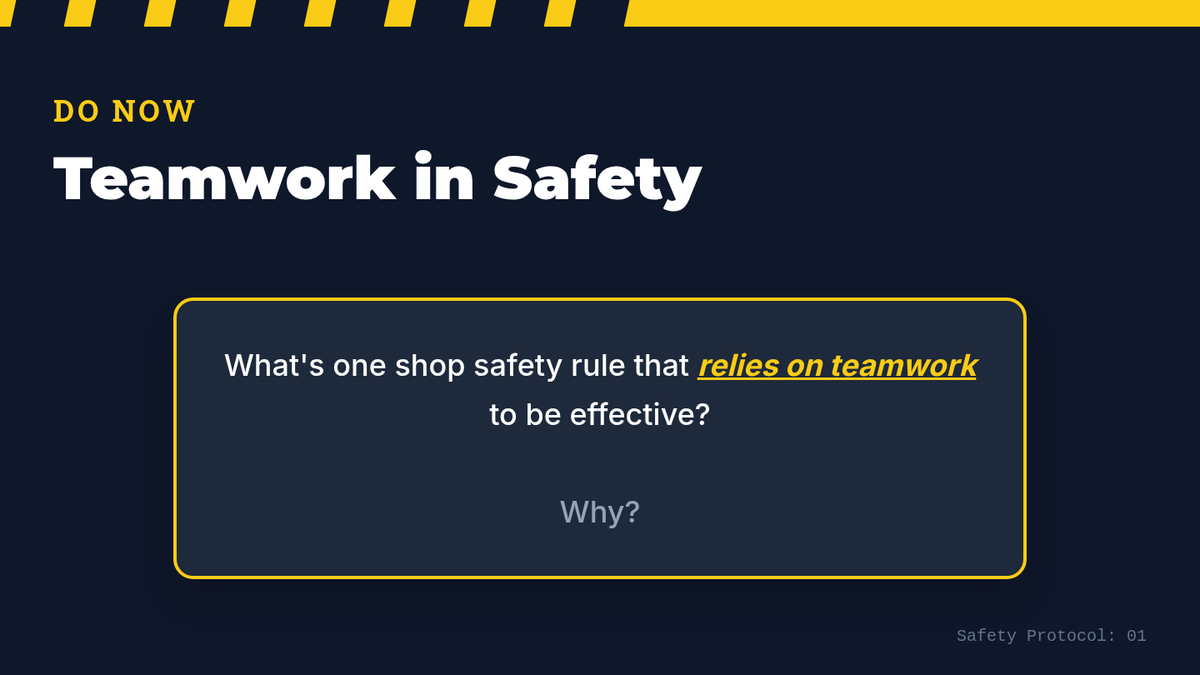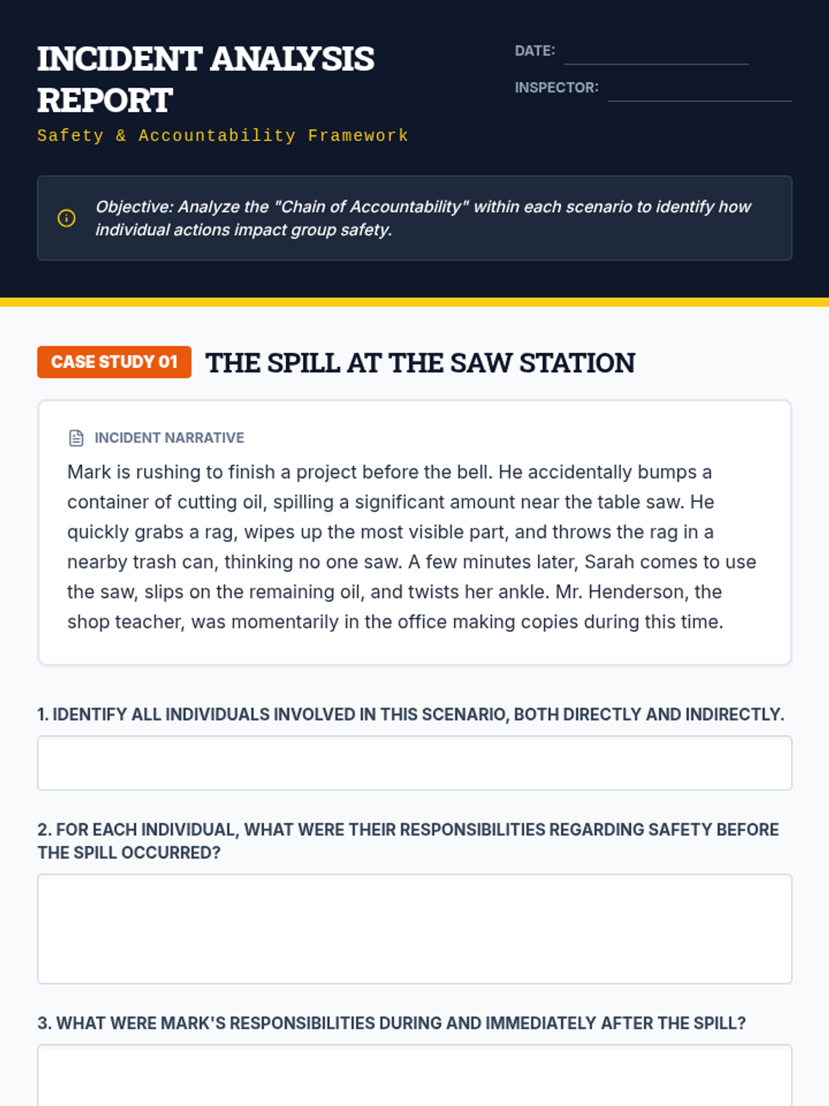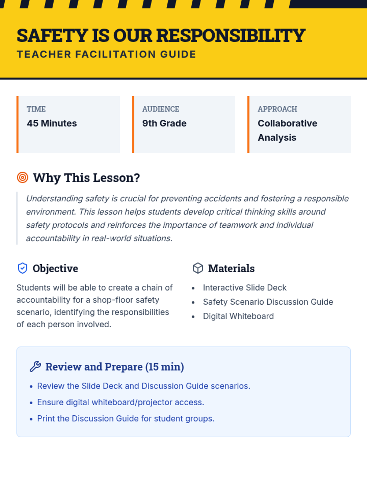 A 45-minute lesson for 9th-grade students that uses collaborative scenarios to teach accountability, teamwork, and prevention in a shop-floor environment.