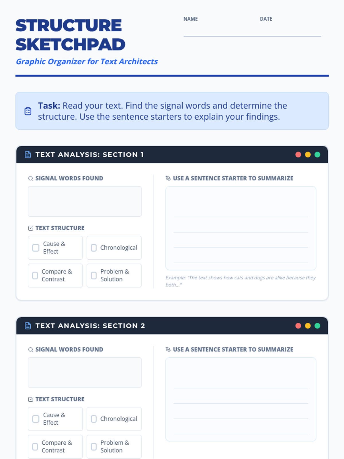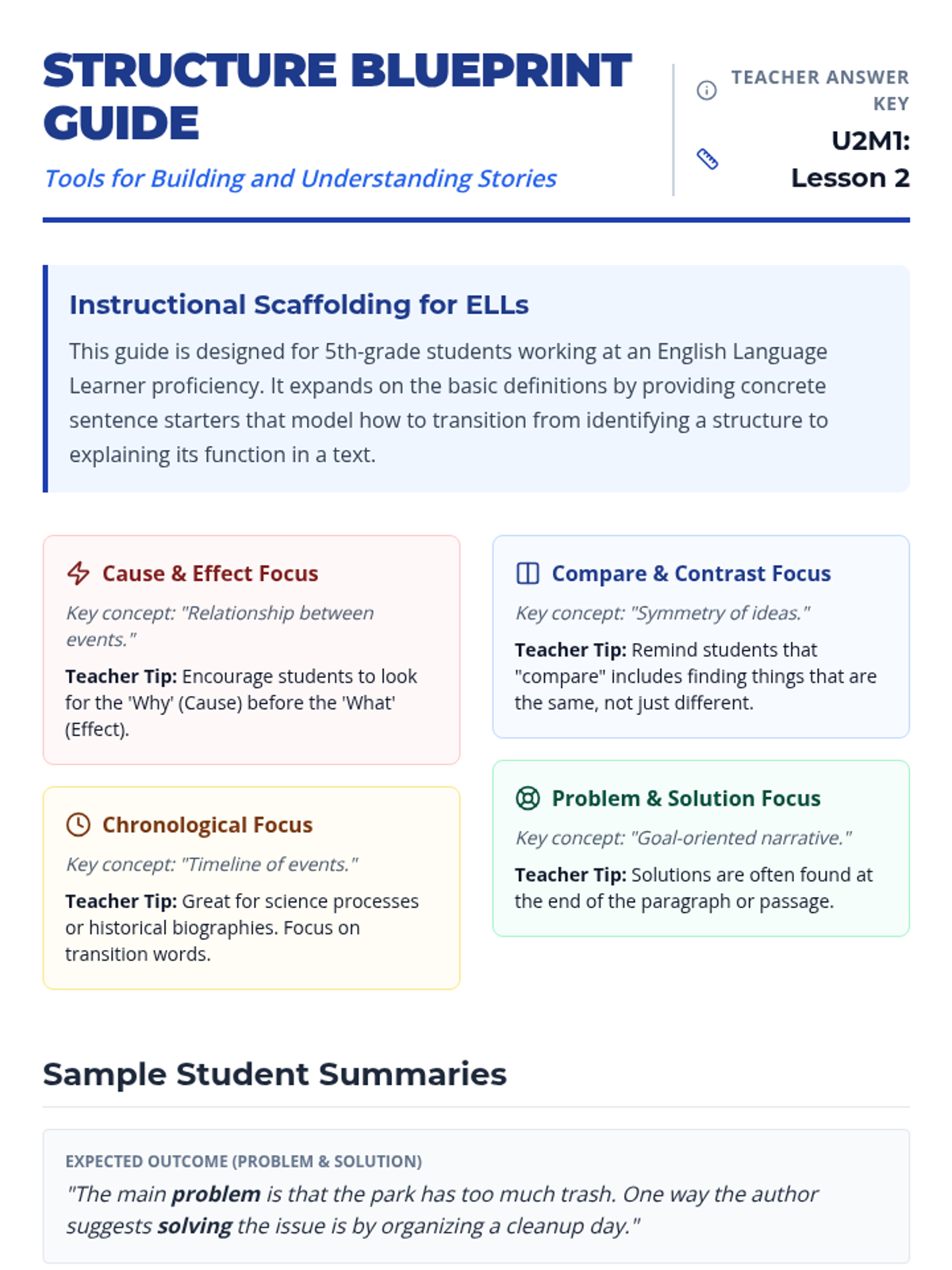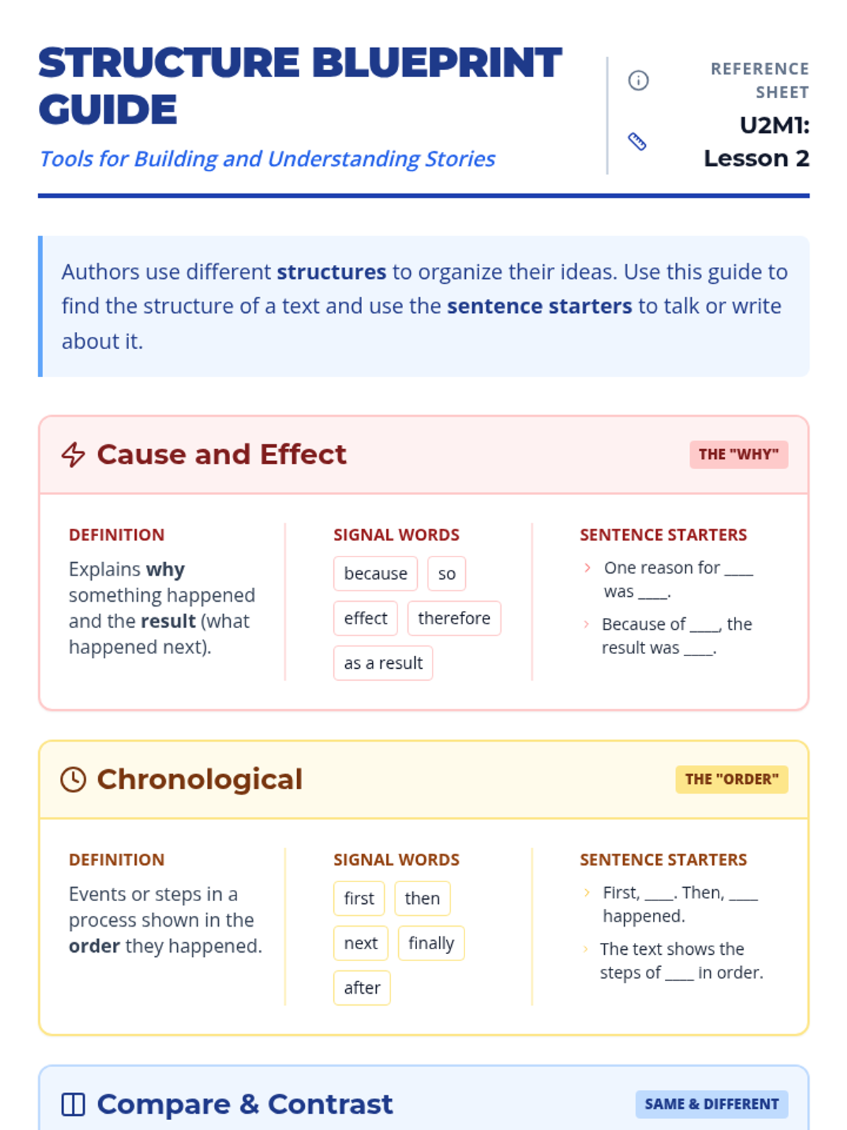 A lesson focused on identifying text structures using visual scaffolding, signal words, and sentence starters designed for English Language Learners.