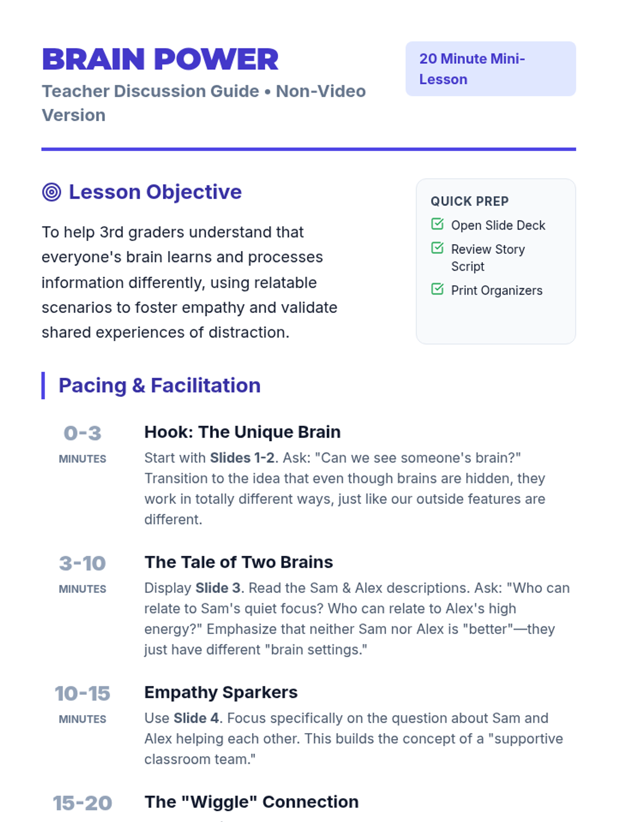 A 20-minute introductory discussion lesson for 3rd graders focused on neurodiversity, celebrating different ways of thinking, and fostering classroom empathy.