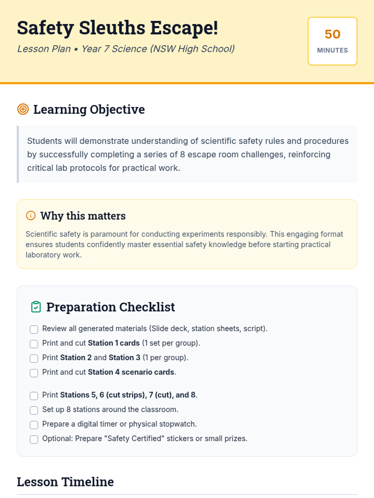 Students embark on a 50-minute escape room challenge to reinforce their understanding of scientific safety rules and procedures, specifically designed for Year 7 NSW High School students.