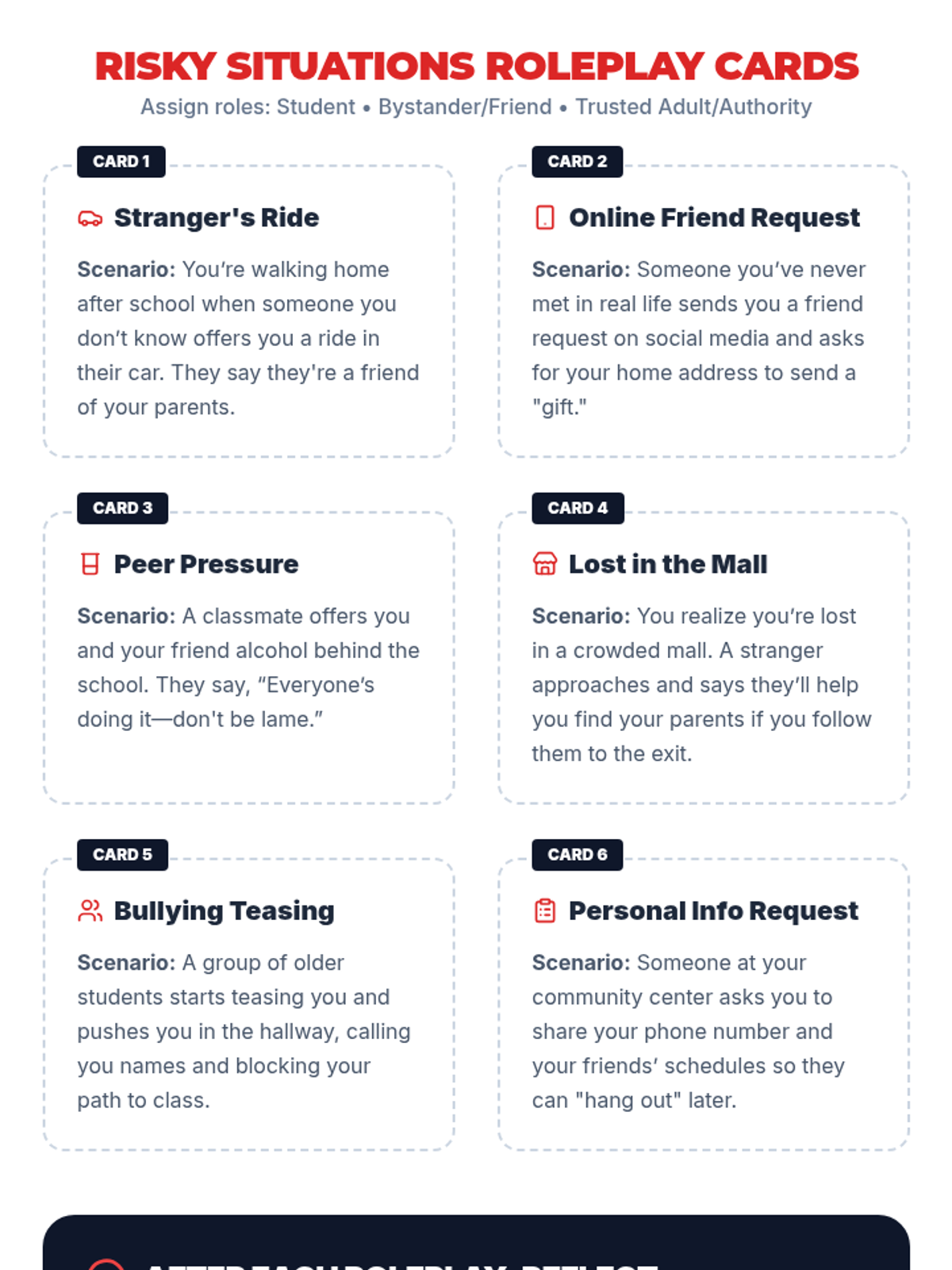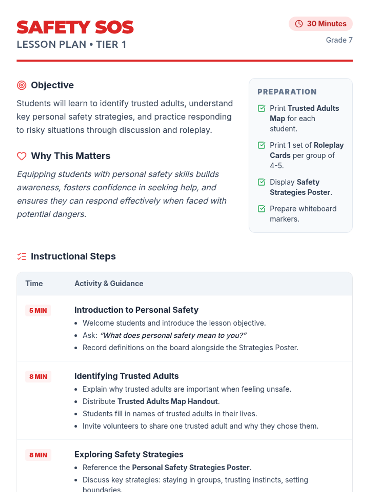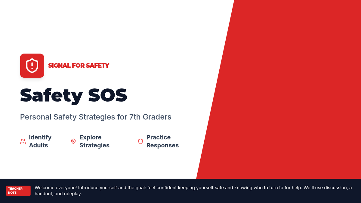 A 30-minute Tier 1 lesson for 7th graders focused on personal safety, identifying trusted adults, and practicing responses to risky situations. This session empowers students with practical skills and a support network map.
