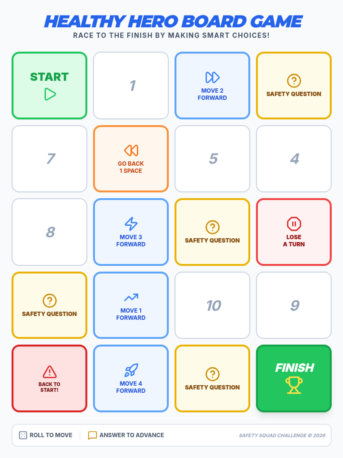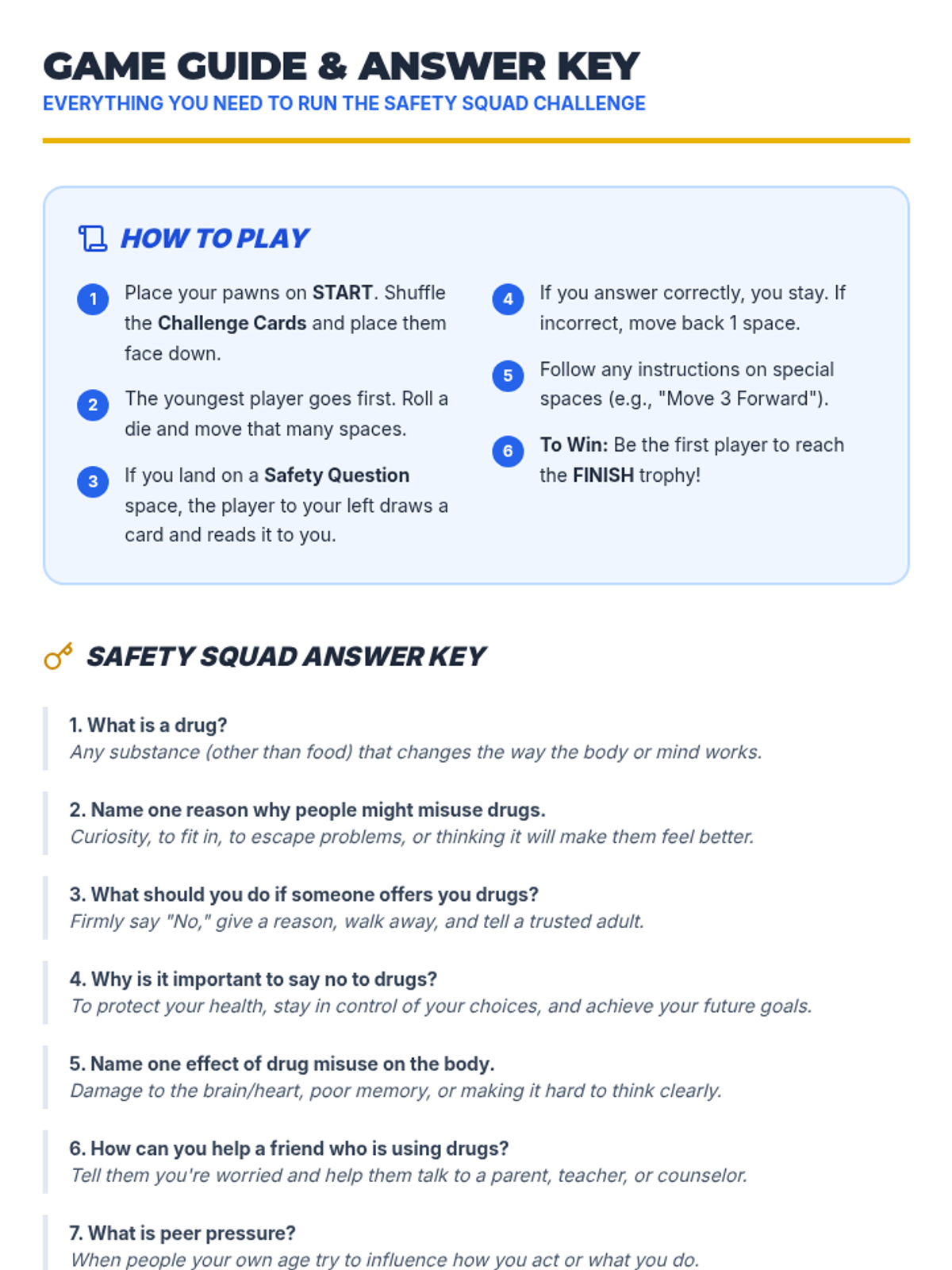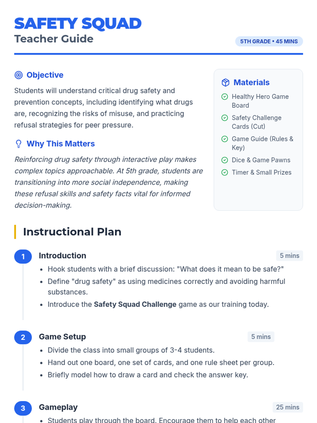 An interactive 5th-grade lesson where students play a board game to learn about drug safety, peer pressure, and healthy decision-making.