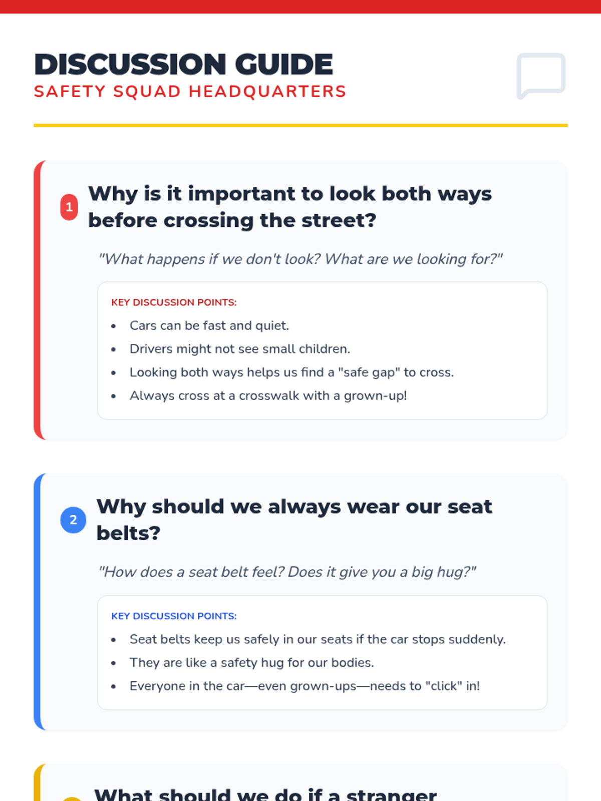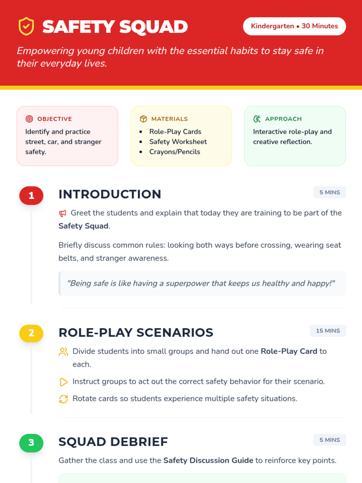 A comprehensive lesson for kindergarten students on stranger safety, focusing on identifying safe adults, understanding the 'No, Go, Tell' rule, and distinguishing between safe and unsafe stranger interactions.