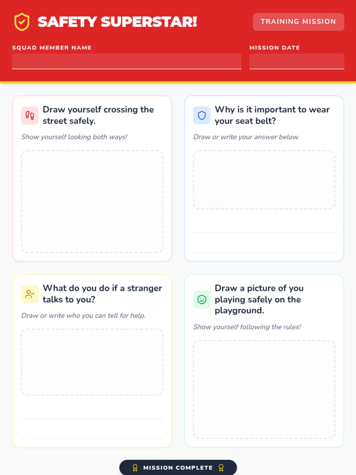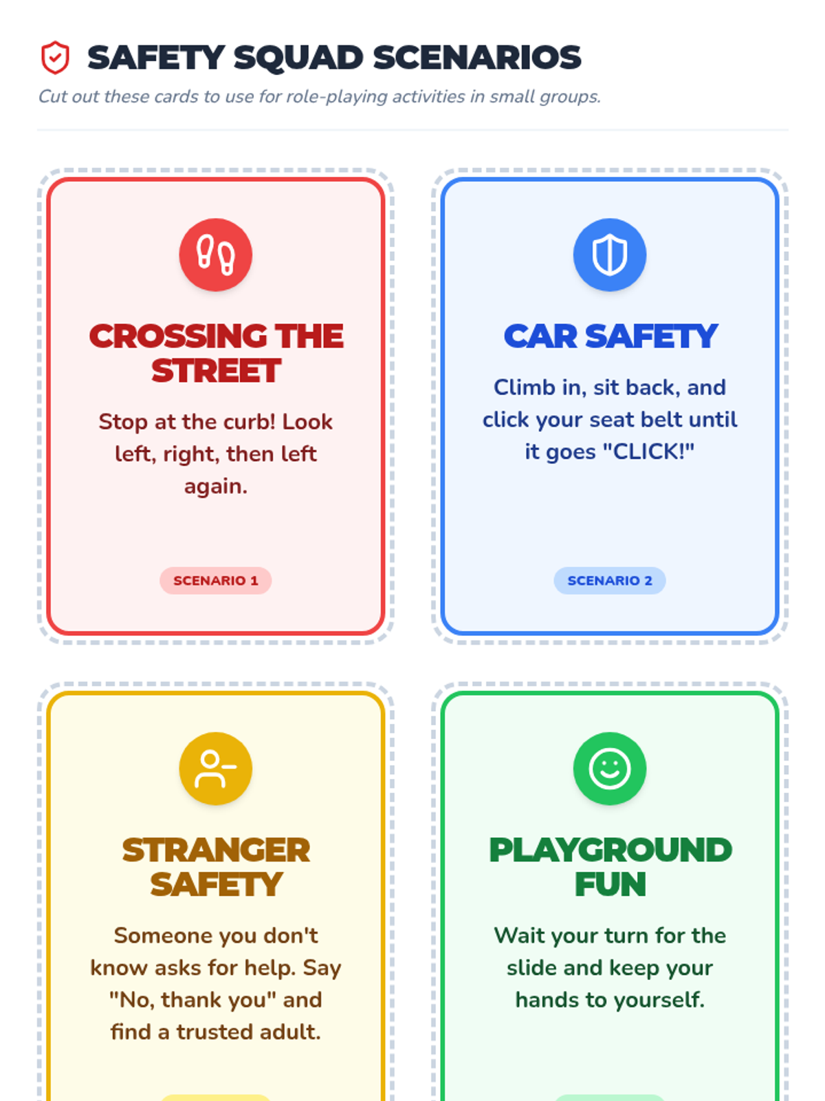 Students will learn and practice everyday safety practices like crossing the street, using seat belts, and avoiding strangers through role-play and creative activities.