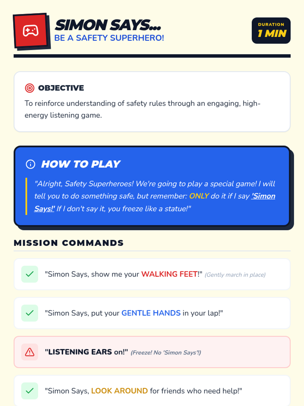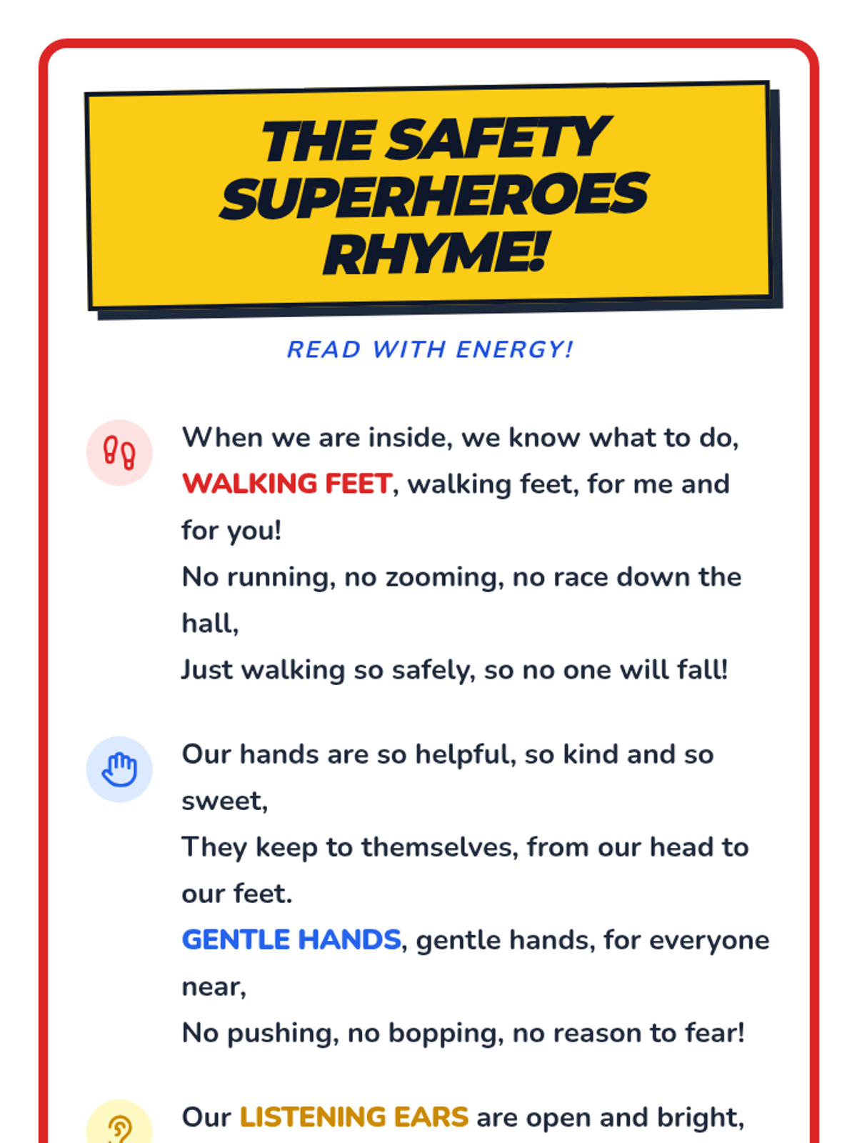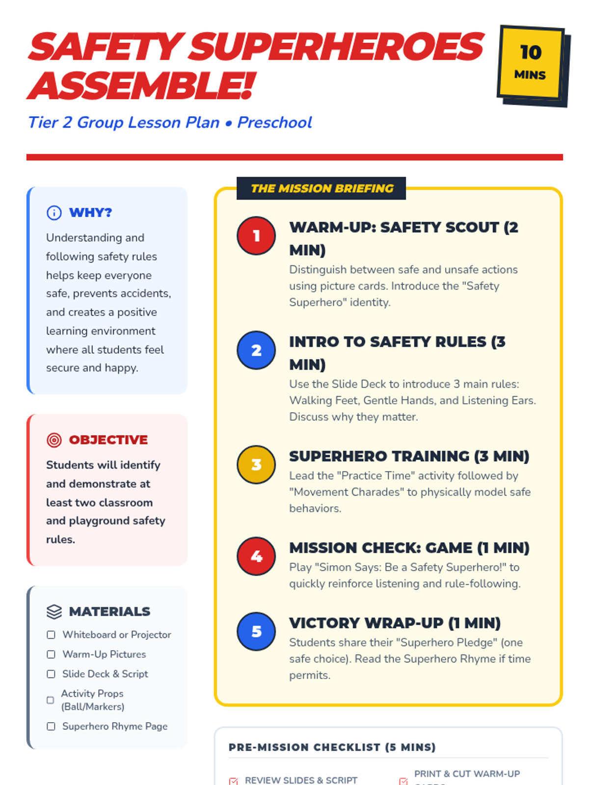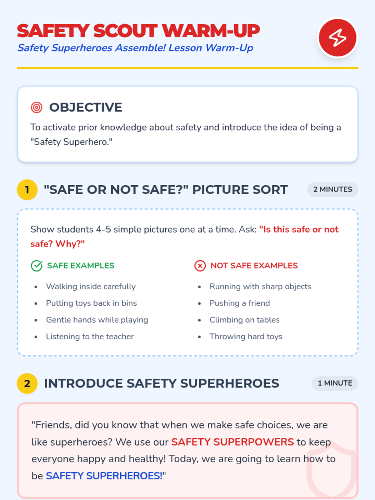 A fun, superhero-themed lesson for preschoolers to learn and practice essential classroom and playground safety rules. Students will identify safe vs. unsafe actions and commit to being 'Safety Superheroes.'